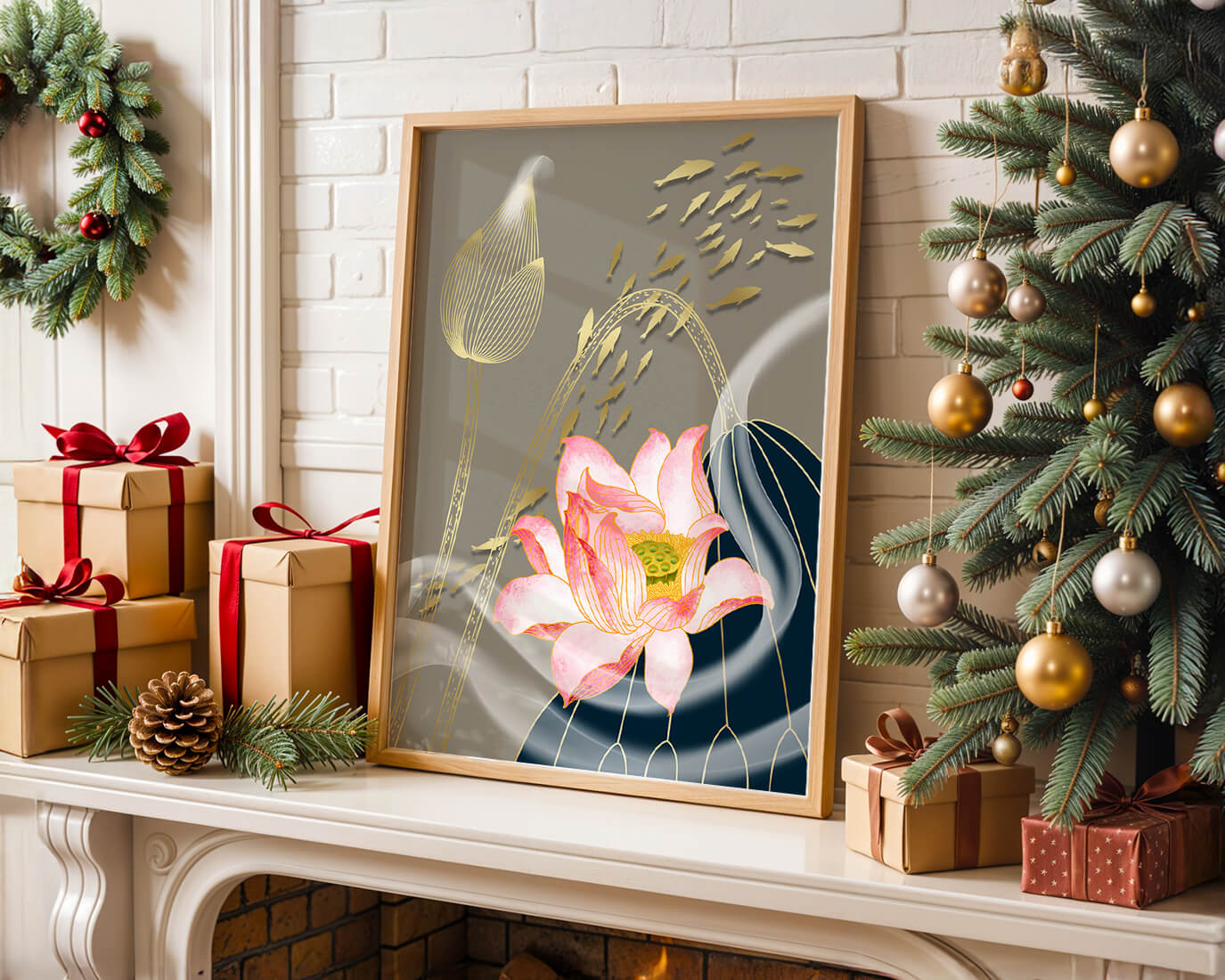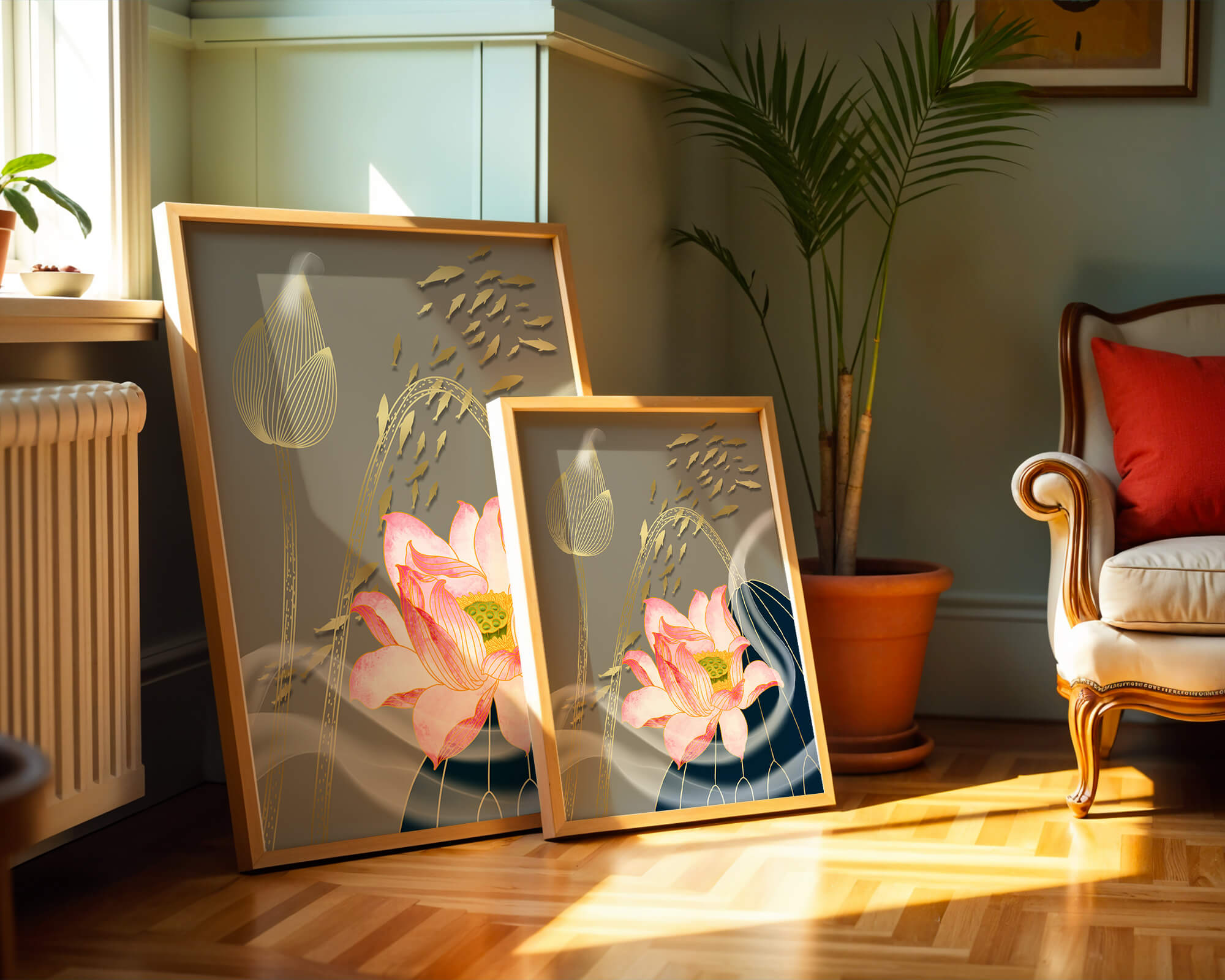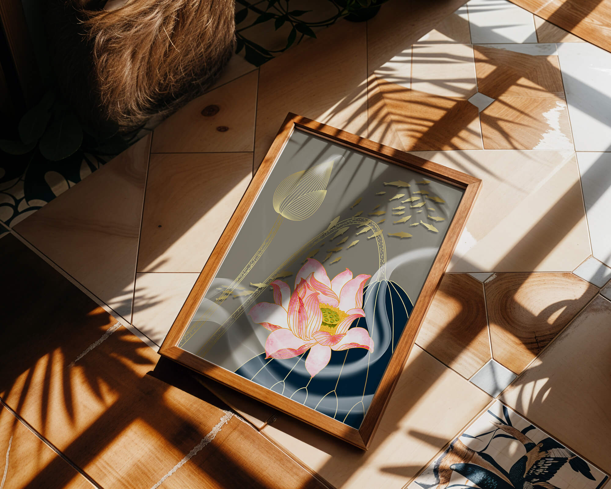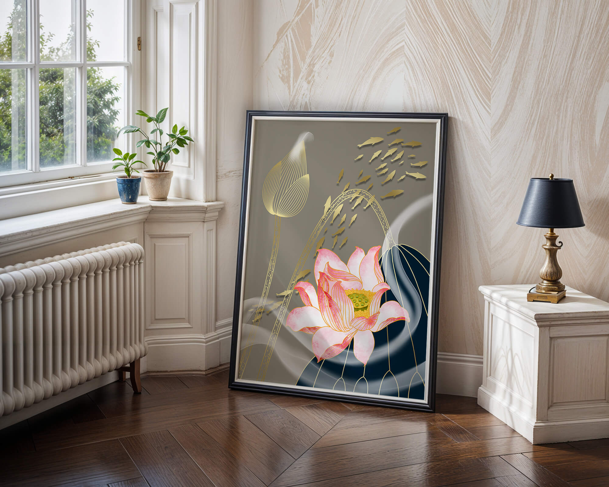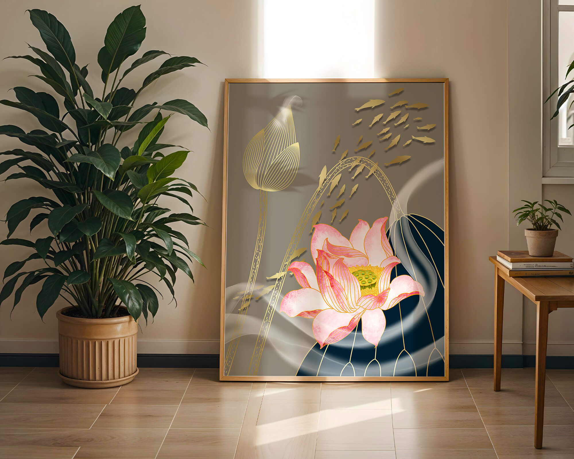 Diseño floral elegante con flores de loto en flor y detalles de peces dorados.