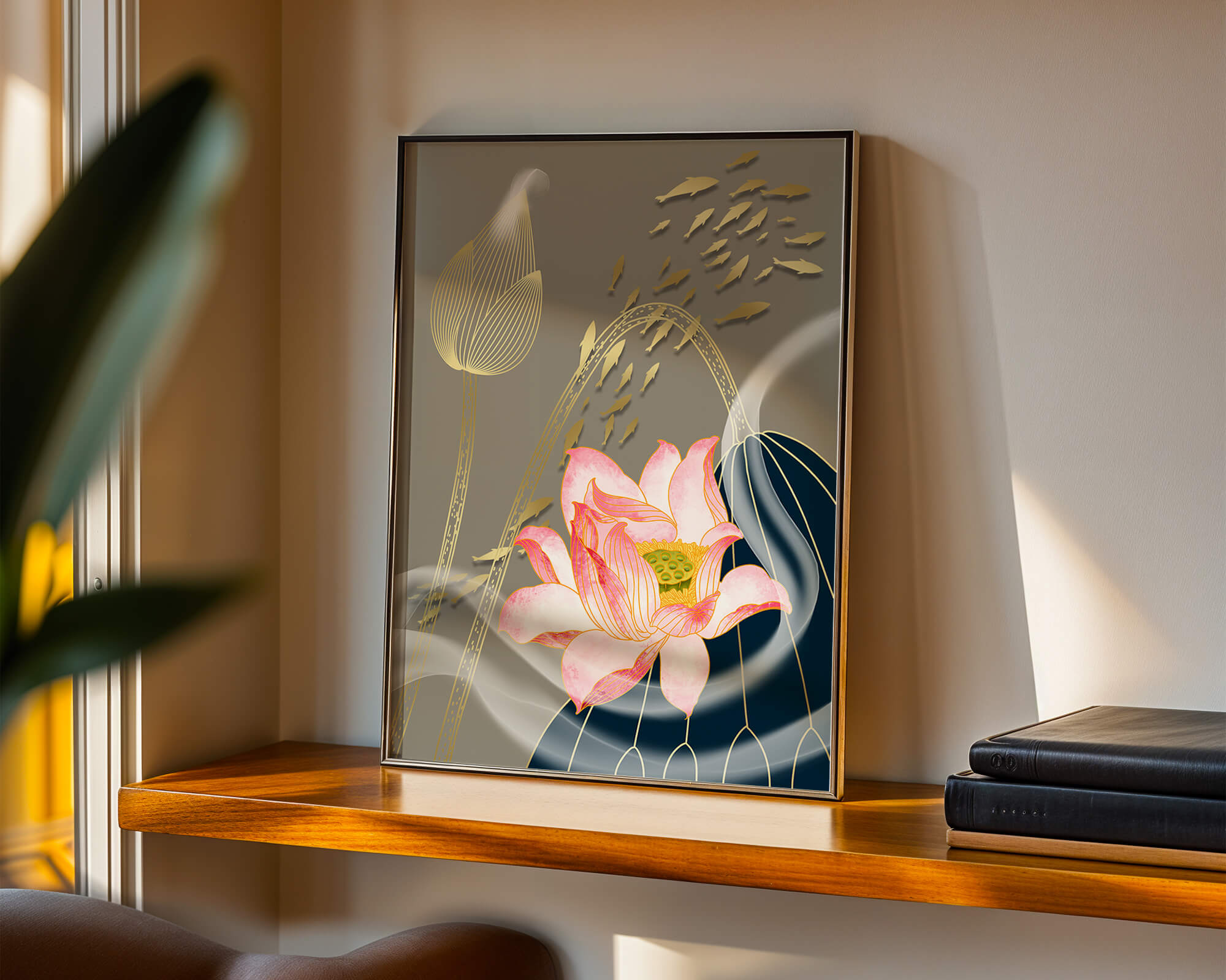 Изображение демонстрирует потрясающее представление природы с цветущим розовым лотосом, окруженным струящимися золотыми линиями и акцентами из рыбы.