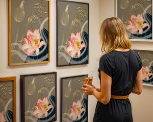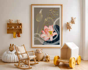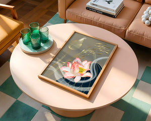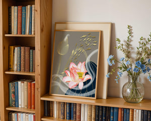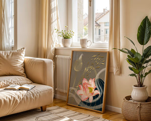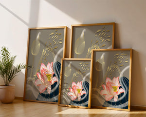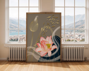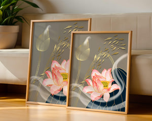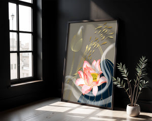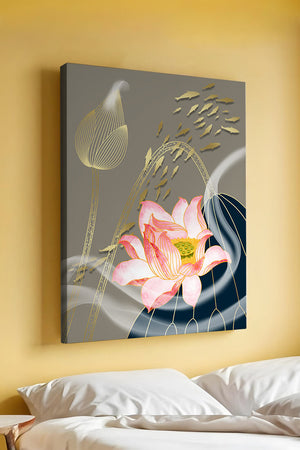 Эта композиция содержит красиво детализированный розовый лотос в качестве центрального элемента, подчеркнутый сложной линией, придающей ему ощущение жизни и движения. Лотос дополняется распускающимся цветком, выполненным в элегантных золотых контурах, добавляя изысканность к дизайну. Золотые рыбы грациозно плавают вокруг цветочных элементов, переплетаясь с мягкими и плавными волнами, которые добавляют динамичную энергию к композиции. Использование золота и спокойного серого фона подчеркивает умиротворяющую и спокойную атмосферу изображения, делая его идеальным дополнением к современному домашнему декору.
