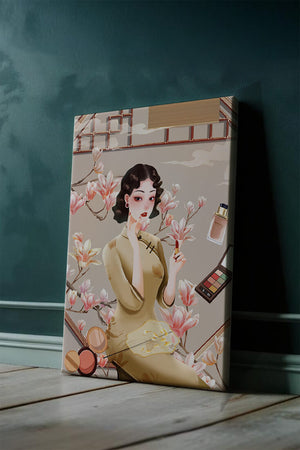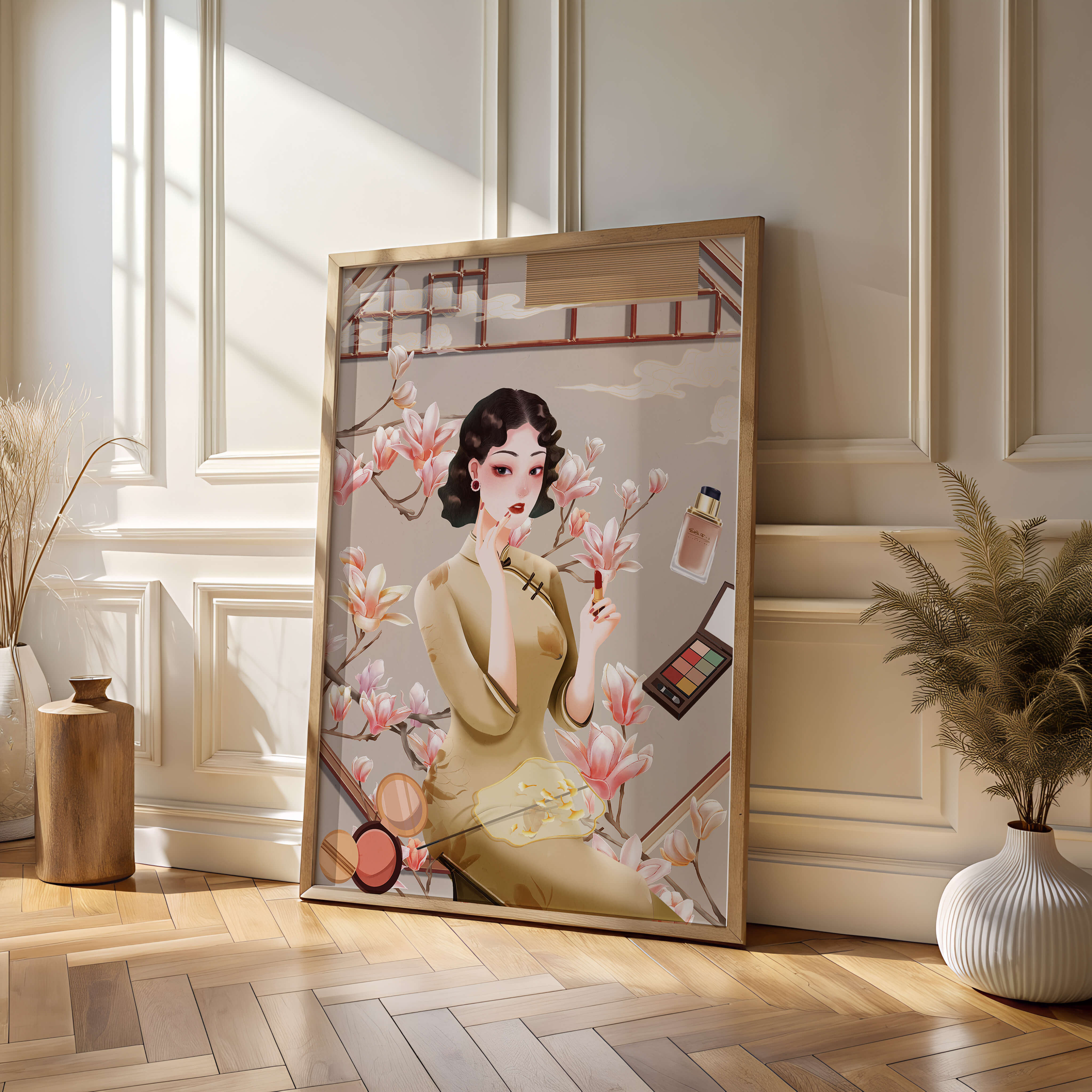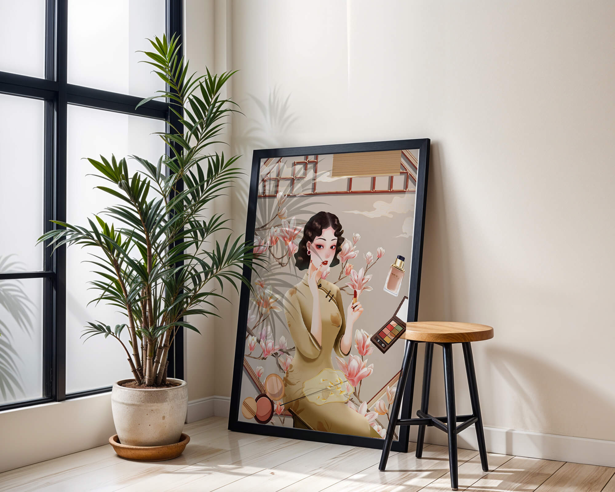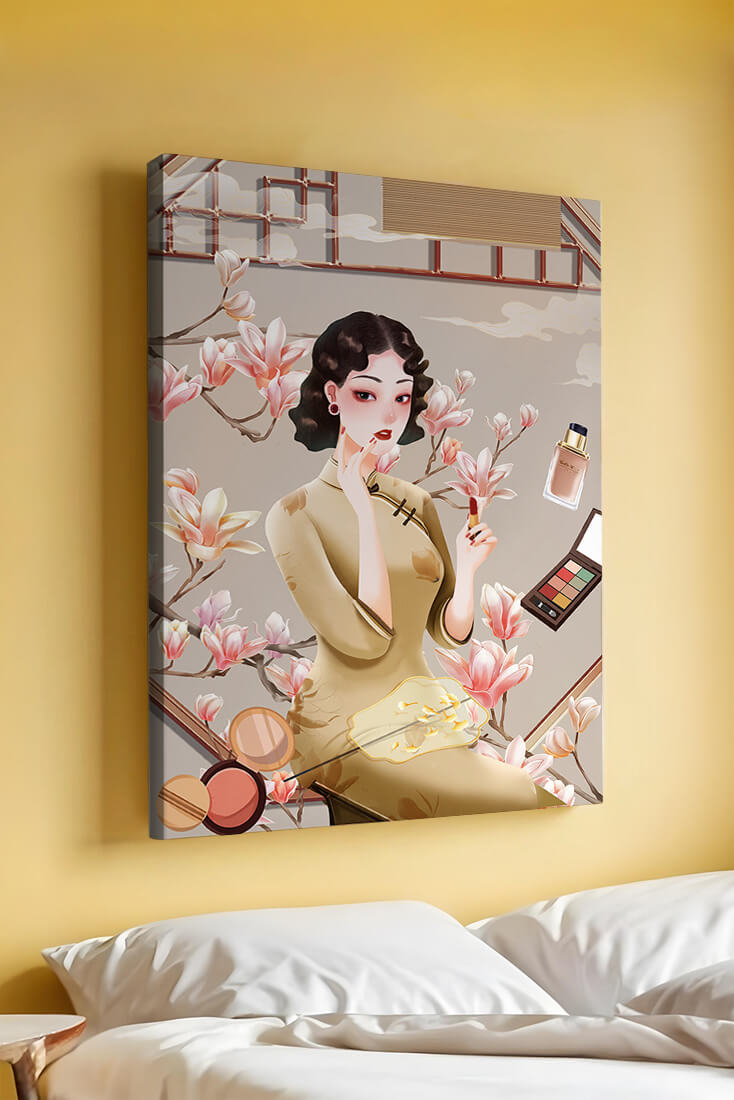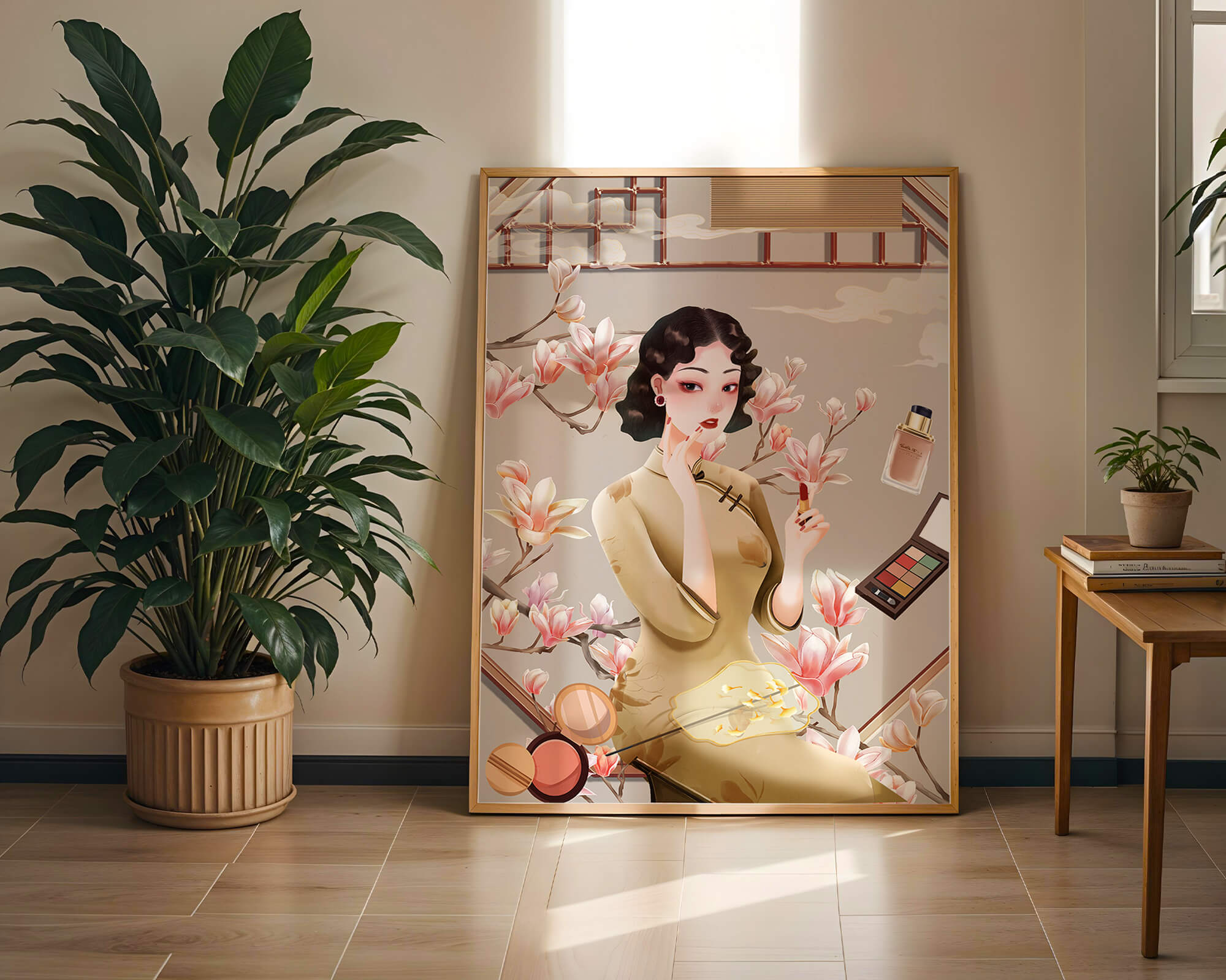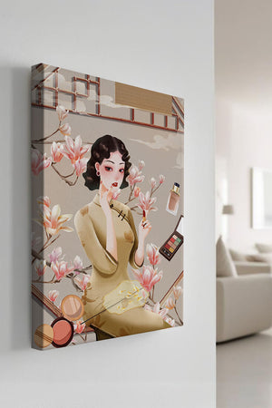 Изображение захватывает спокойную грацию женщины, наносящей макияж, окруженной мягкими оттенками цветущей магнолии. Ее наряд и нежный цветочный фон вызывают ощущение вневременной элегантности, отражая как культурную, так и эстетическую красоту. Палитра и губная помада намекают на тонкий гламур, дополняя ее сдержанное обаяние.Иллюстрация безупречно объединяет художественное самовыражение с элементами природы и красоты, создавая визуально захватывающую сцену. Нежное сочетание пастельных тонов и детализированных черт приглашает зрителей оценить как художественность, так и природное обаяние, присутствующие в изображении.| Тип |