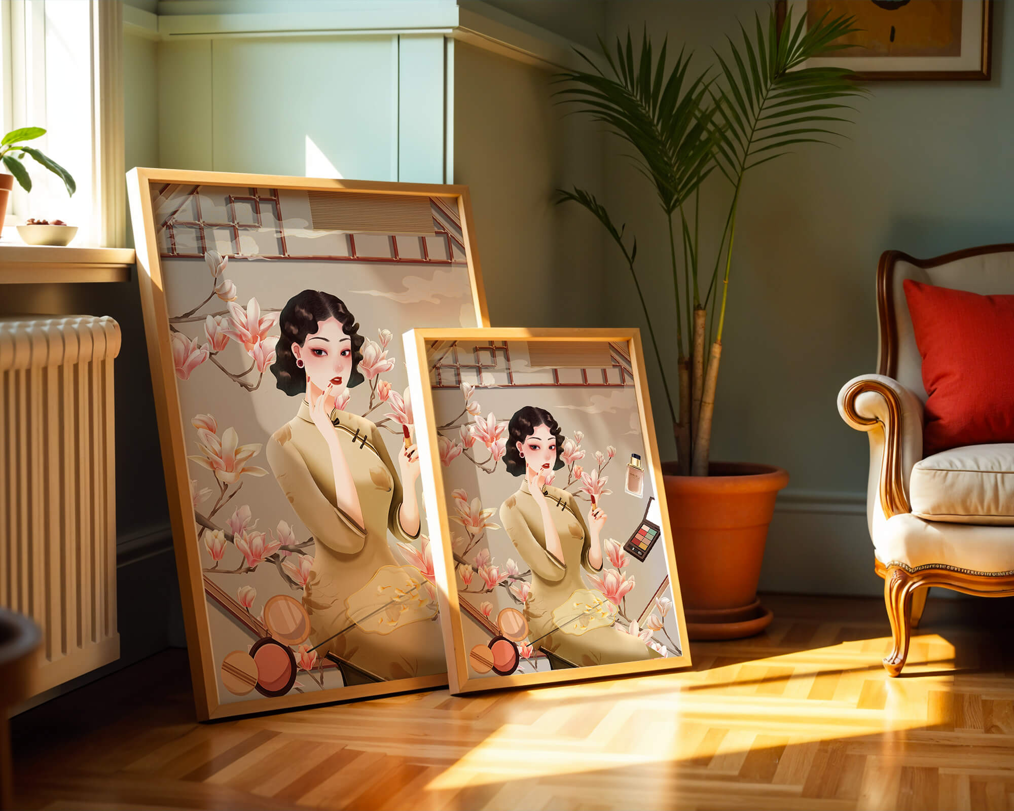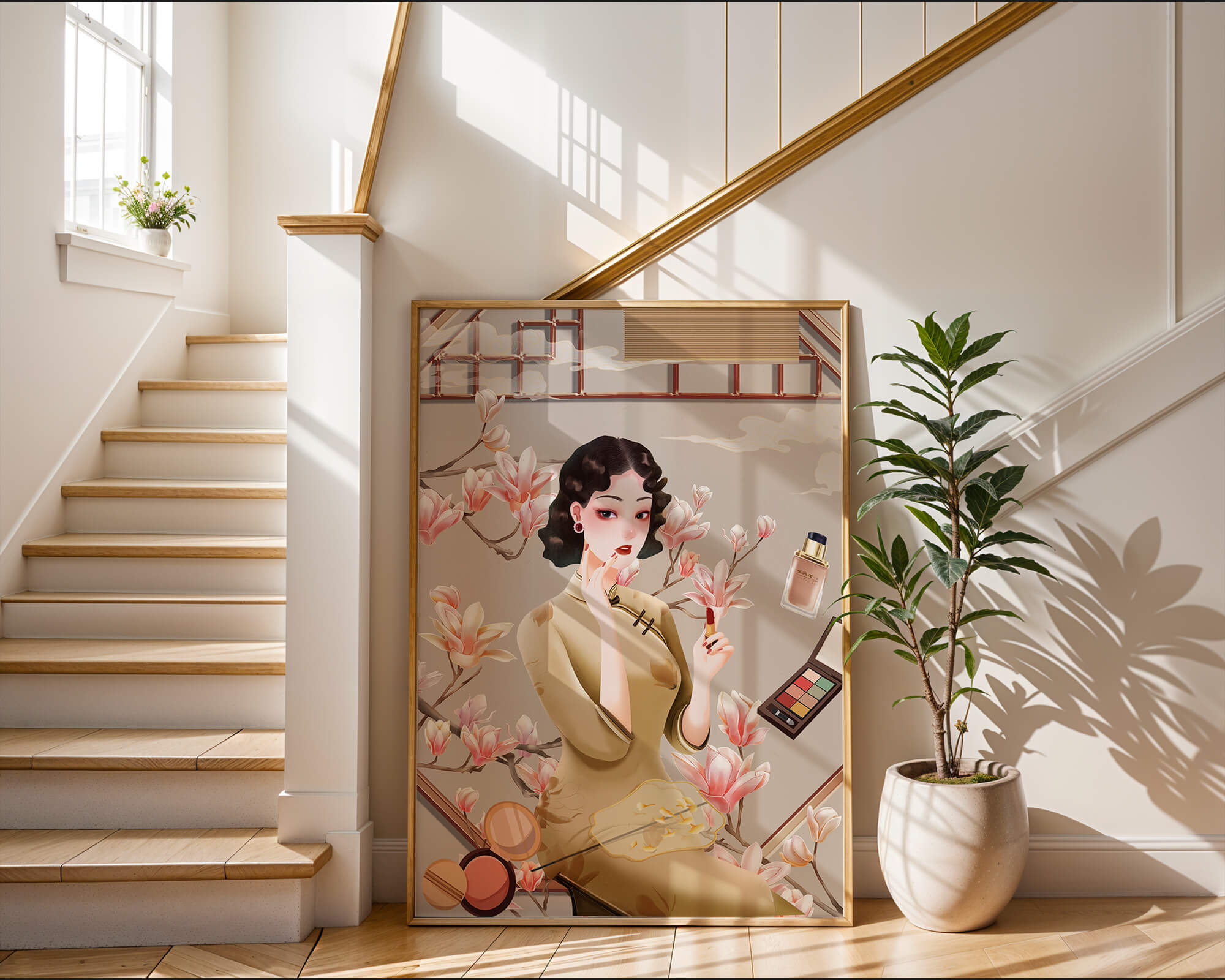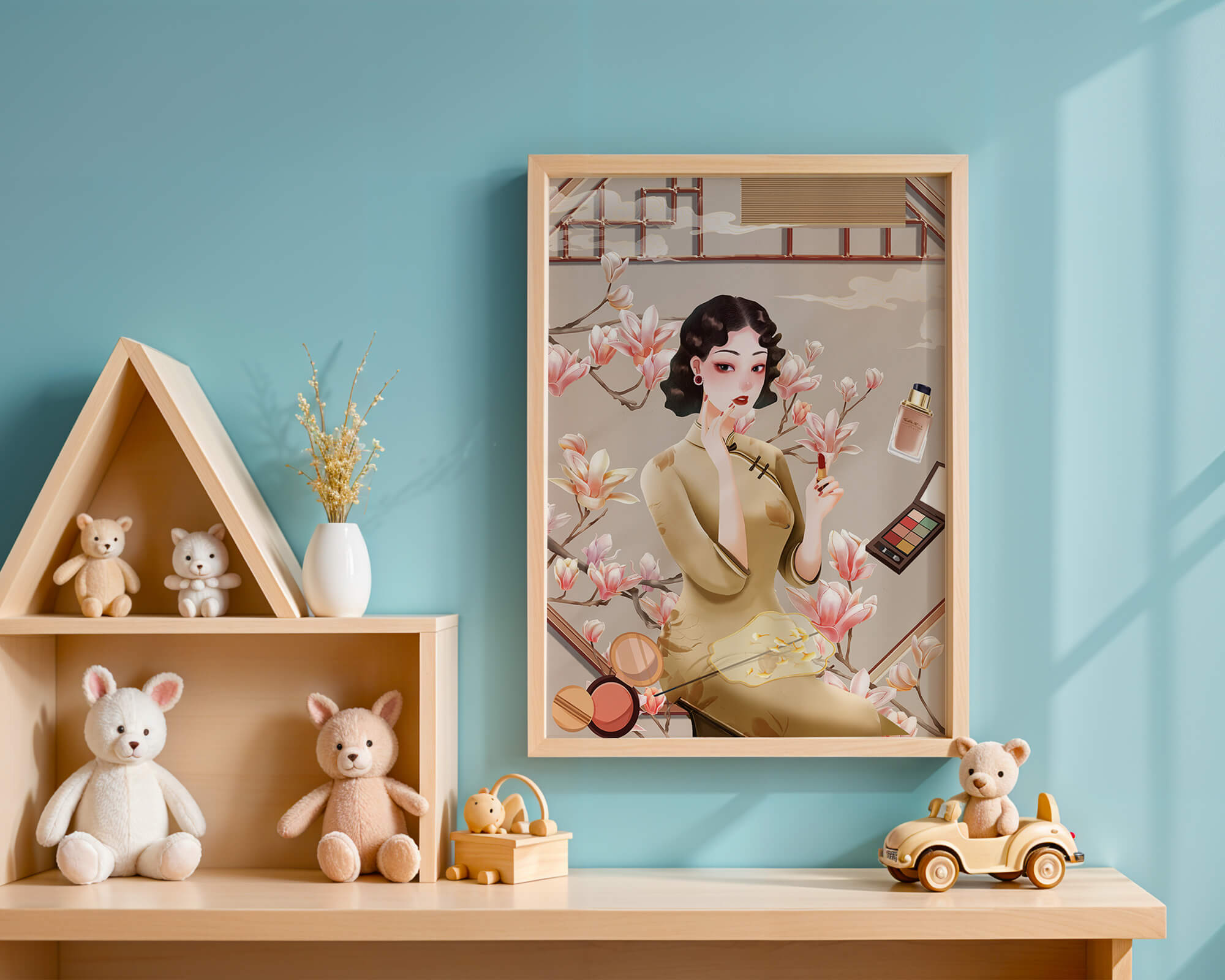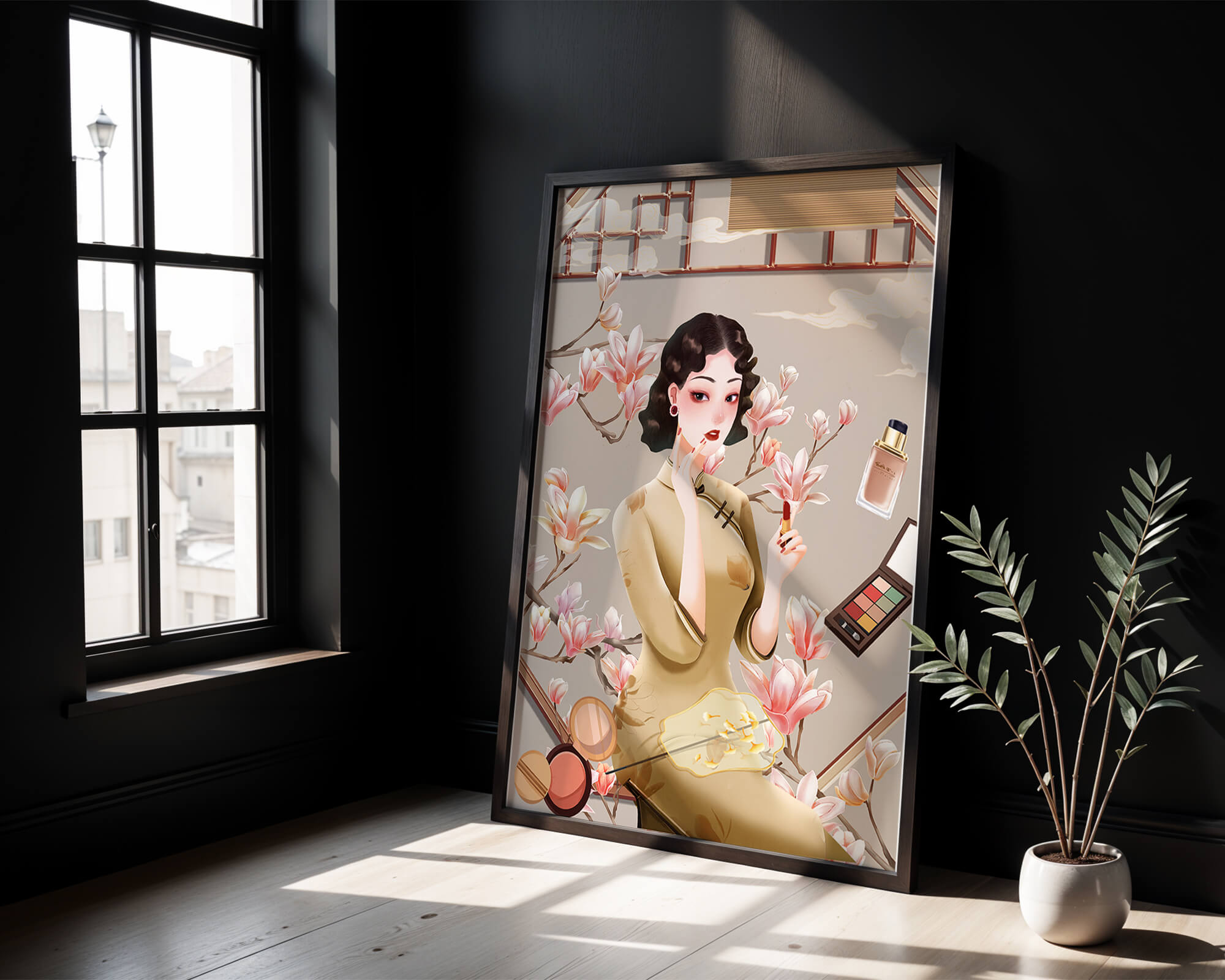 Изображение захватывает спокойную грацию женщины, наносящей макияж, окруженной мягкими оттенками цветущей магнолии. Ее наряд и нежный цветочный фон вызывают ощущение вневременной элегантности, отражая как культурную, так и эстетическую красоту. Палитра и губная помада намекают на тонкий гламур, дополняя ее сдержанное обаяние.Иллюстрация безупречно объединяет художественное самовыражение с элементами природы и красоты, создавая визуально захватывающую сцену. Нежное сочетание пастельных тонов и детализированных черт приглашает зрителей оценить как художественность, так и природное обаяние, присутствующие в изображении.| Тип |