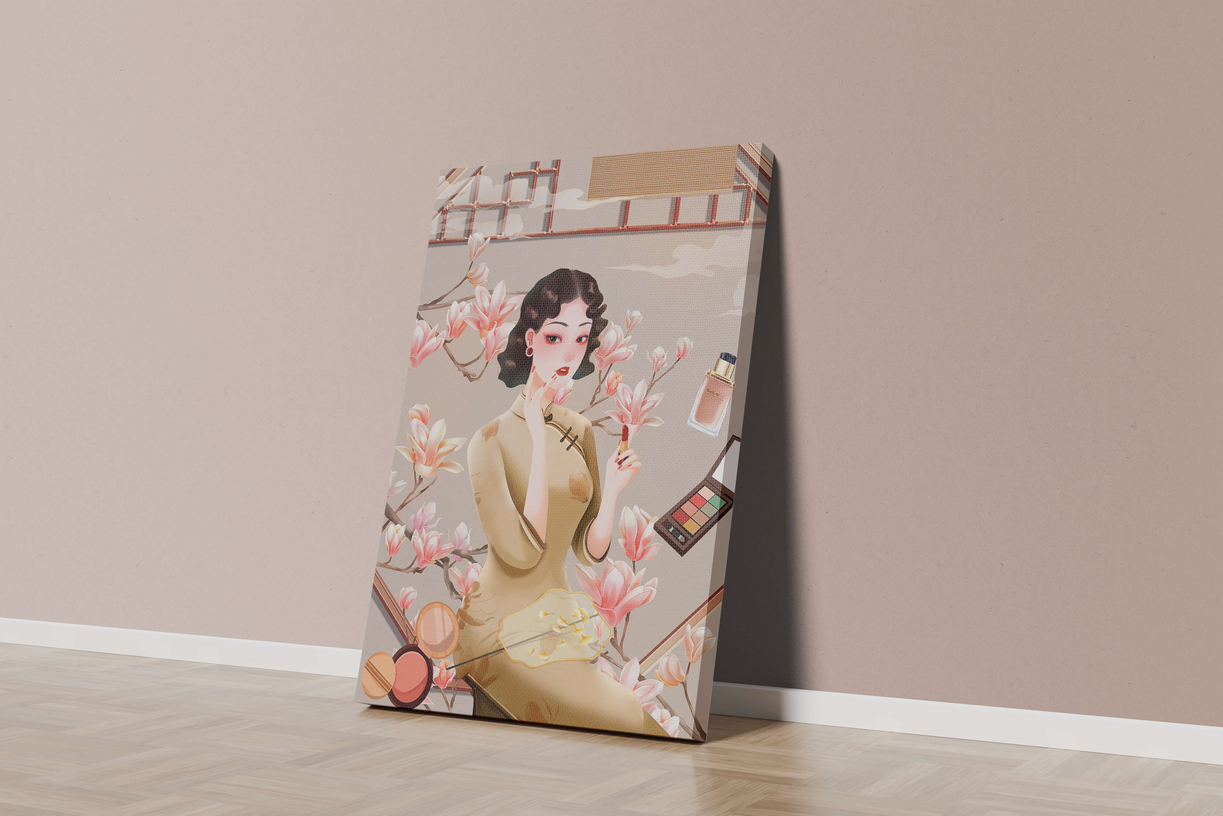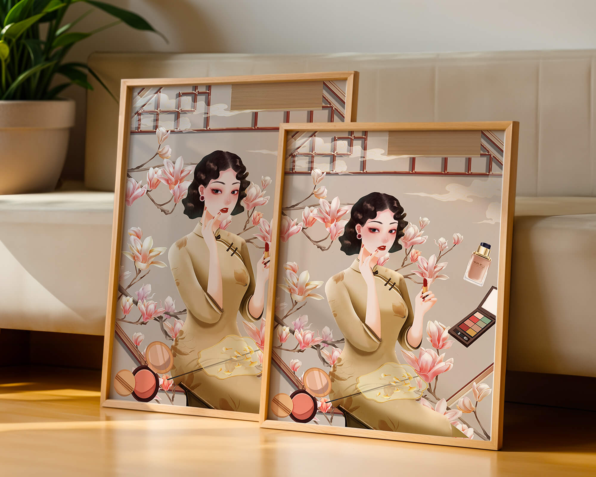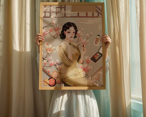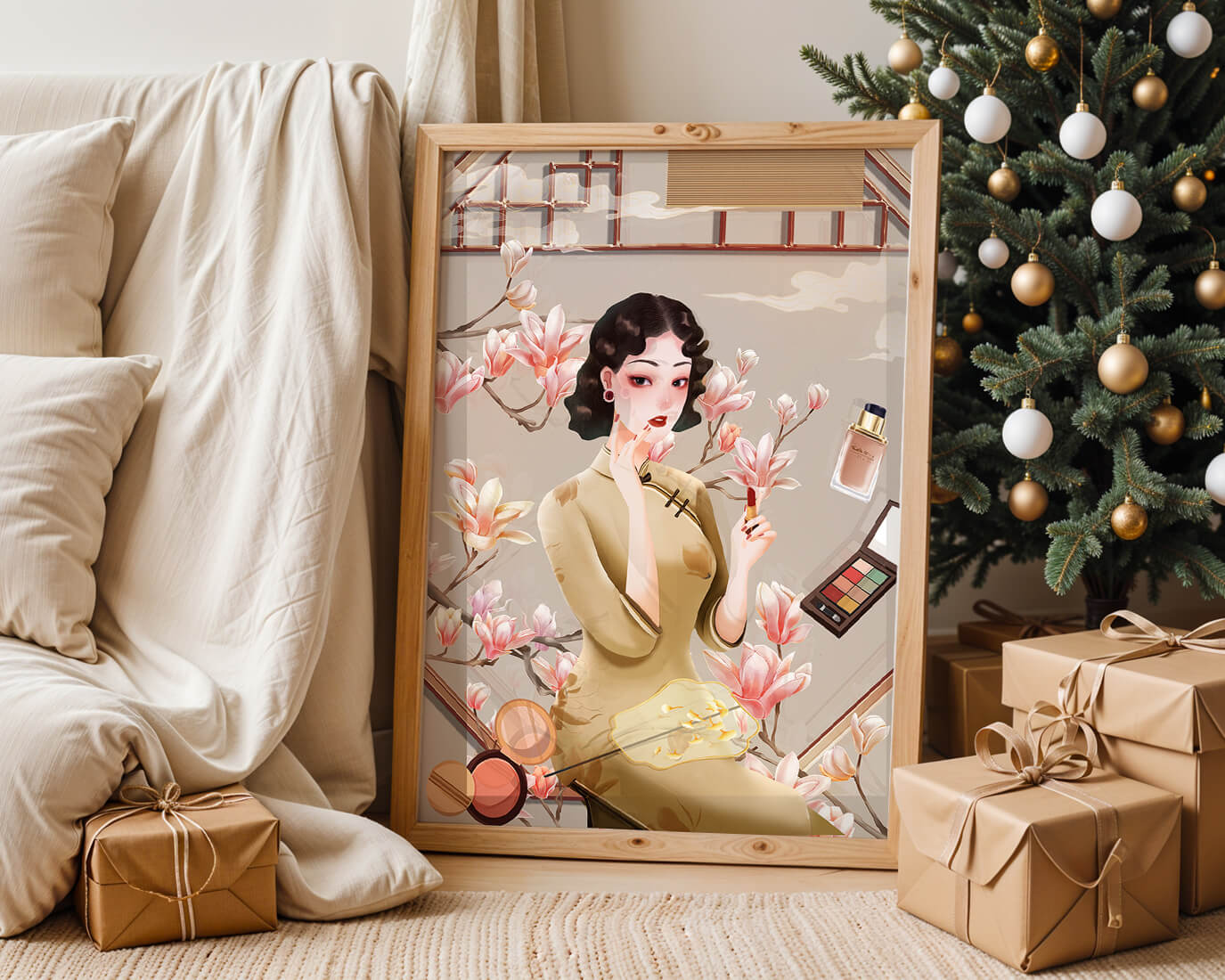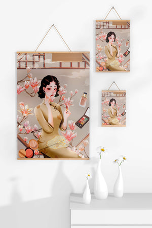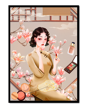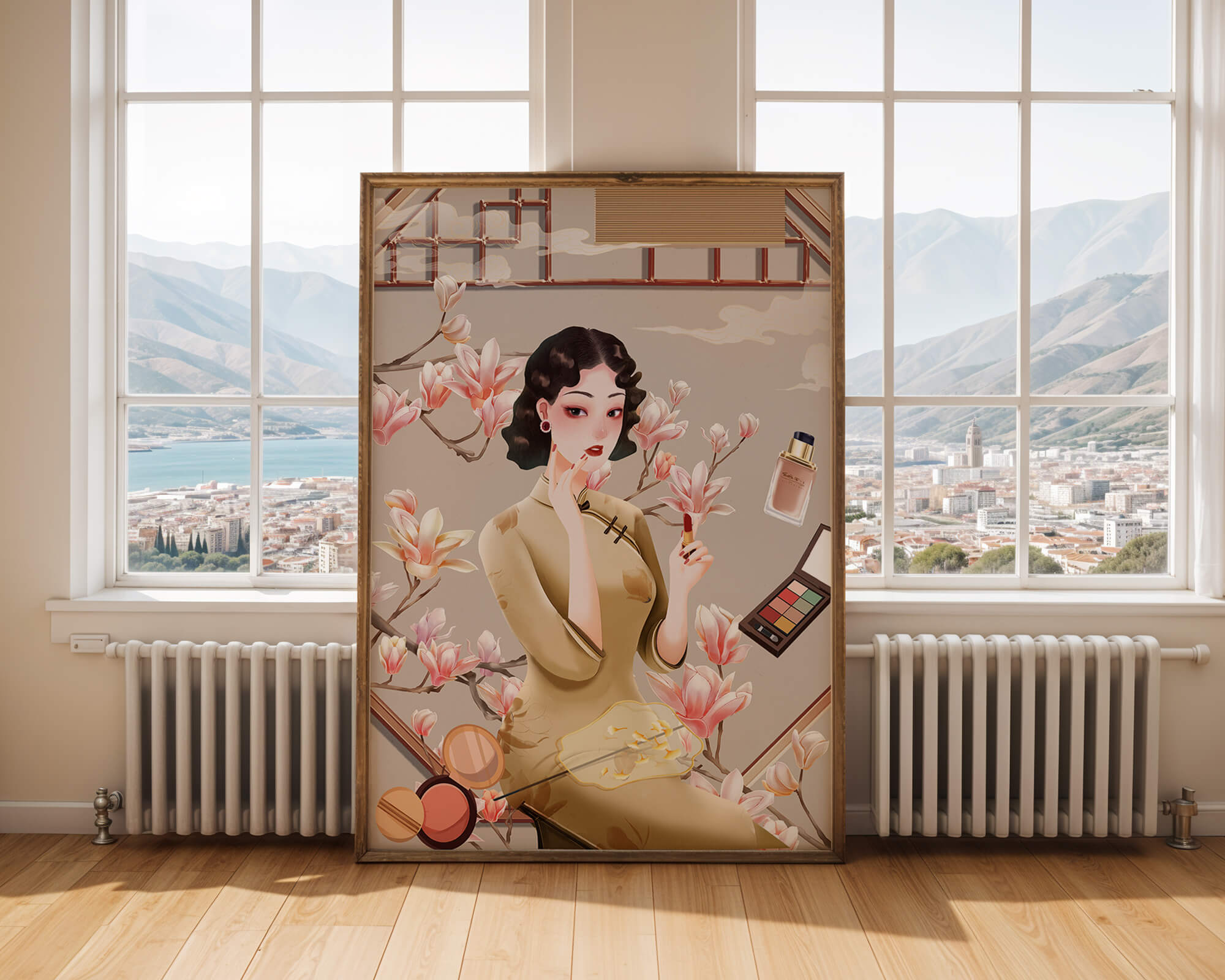 Изображение захватывает спокойную грацию женщины, наносящей макияж, окруженной мягкими оттенками цветущей магнолии. Ее наряд и нежный цветочный фон вызывают ощущение вневременной элегантности, отражая как культурную, так и эстетическую красоту. Палитра и губная помада намекают на тонкий гламур, дополняя ее сдержанное обаяние.Иллюстрация безупречно объединяет художественное самовыражение с элементами природы и красоты, создавая визуально захватывающую сцену. Нежное сочетание пастельных тонов и детализированных черт приглашает зрителей оценить как художественность, так и природное обаяние, присутствующие в изображении.| Тип |