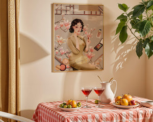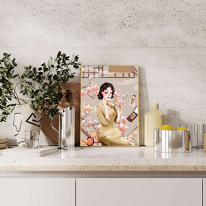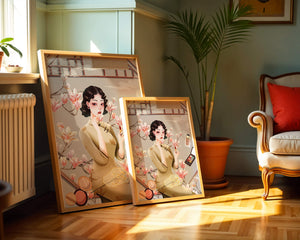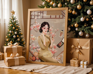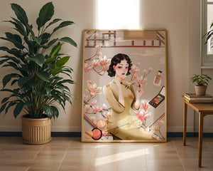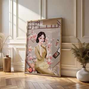 На этой изысканной иллюстрации изображена женщина на фоне цветов магнолии, сочетая традиционную красоту с современными элементами.