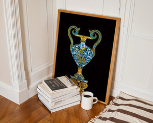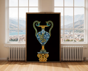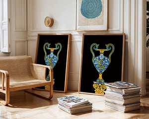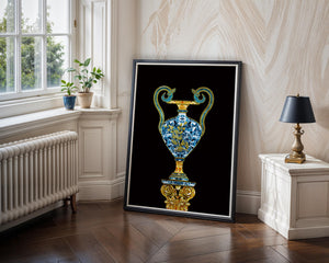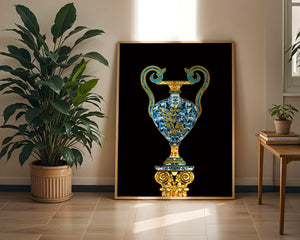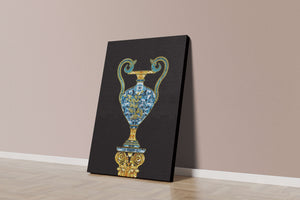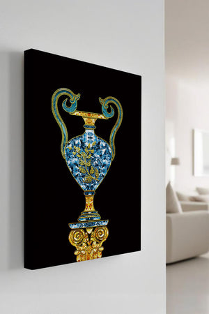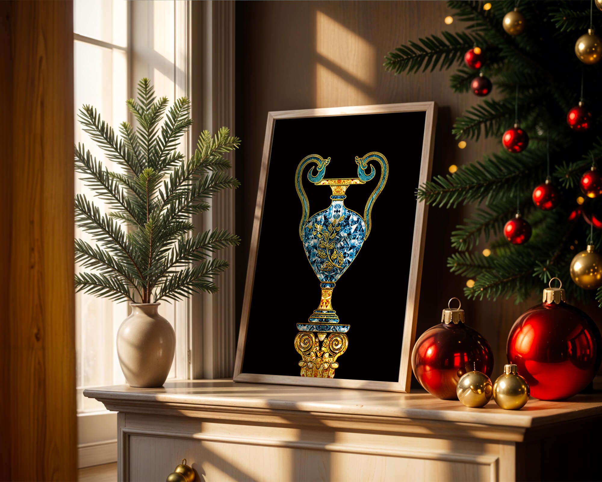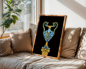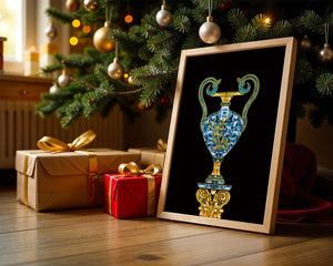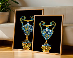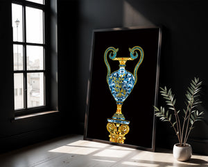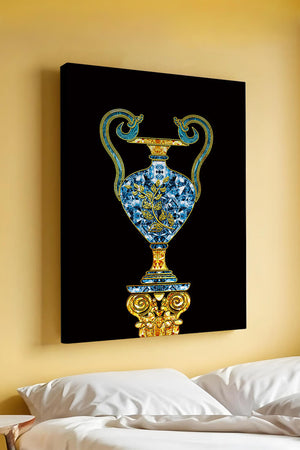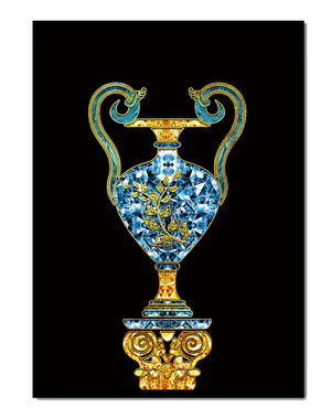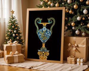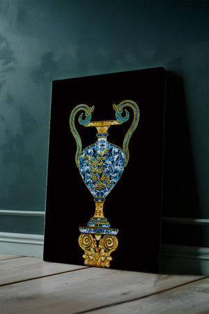 Vas elegant cu bijuterii încrustate cu accente de aur și albastru pe fundal negru