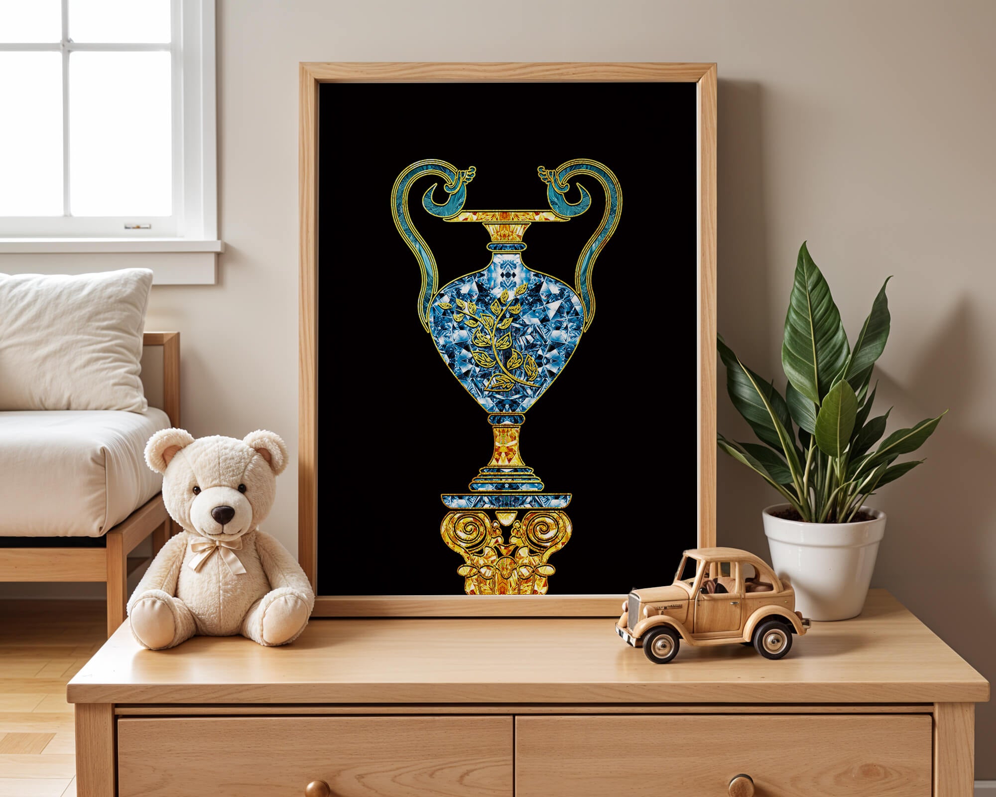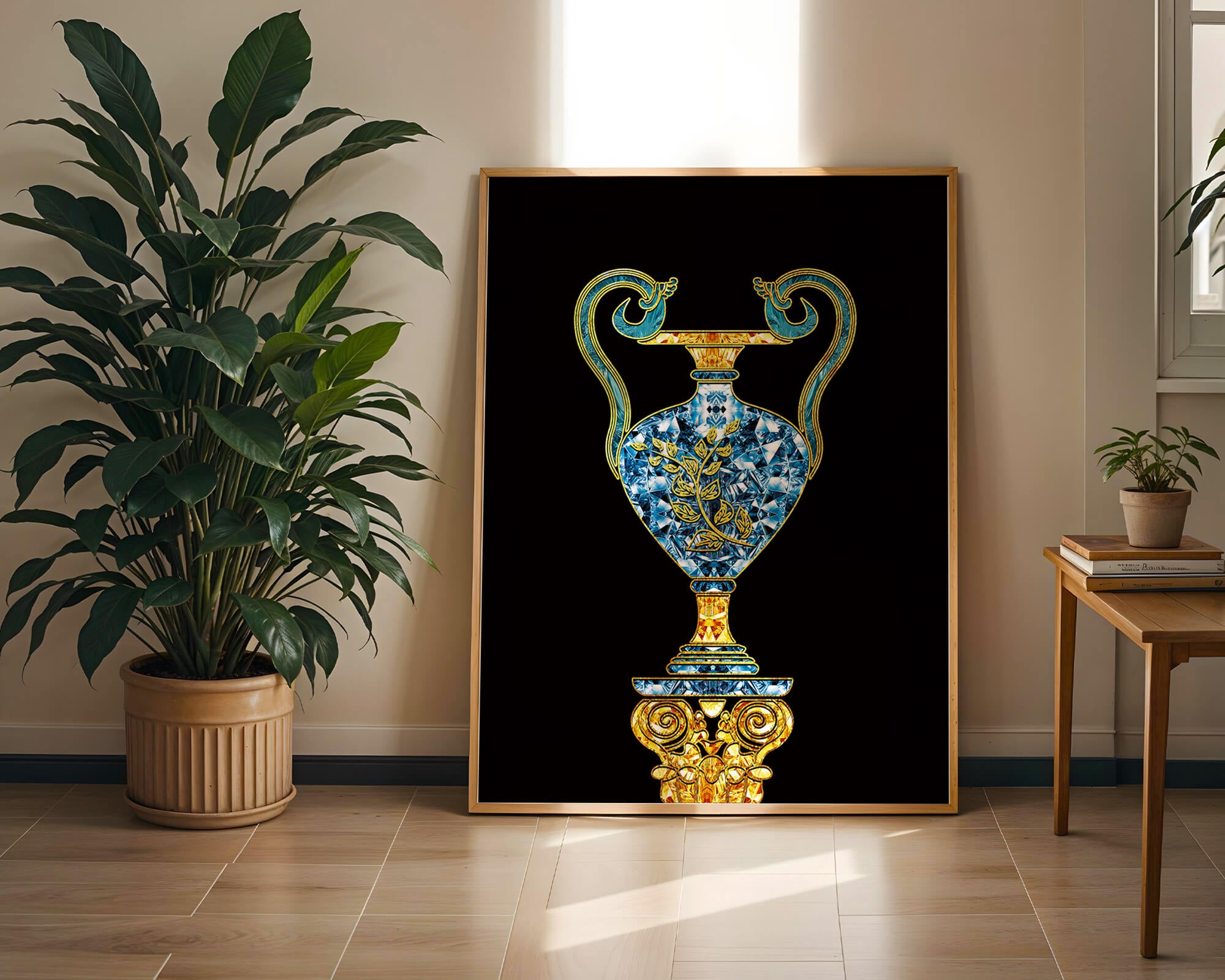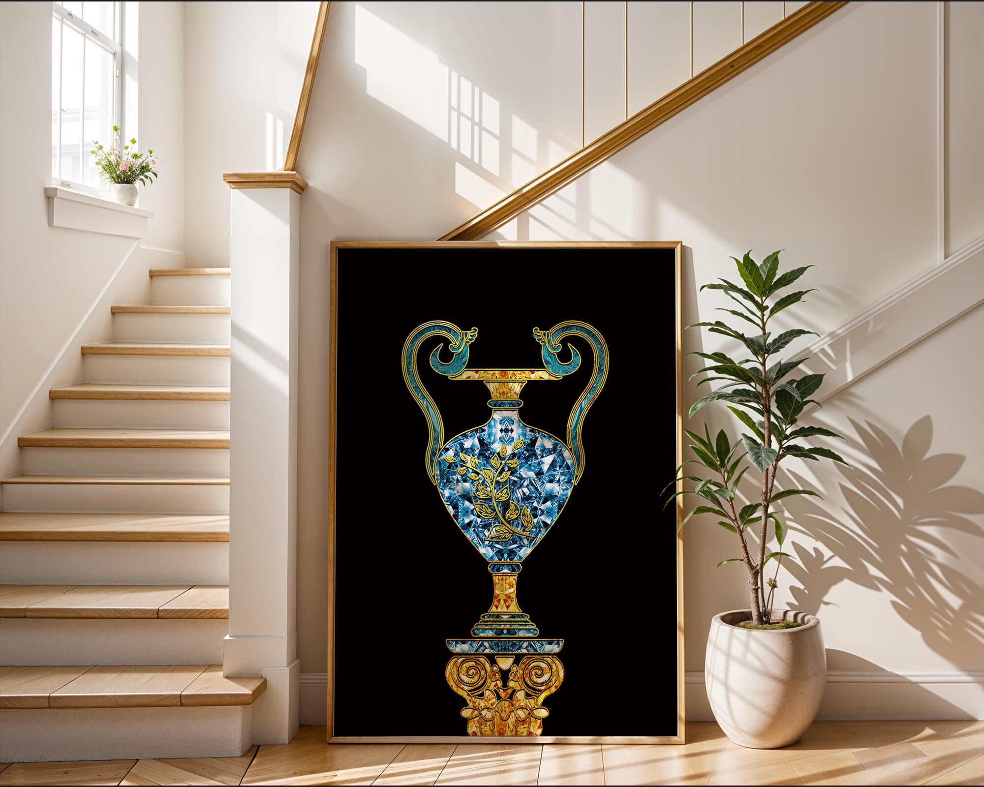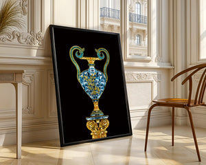 Изысканное изображение вазы, украшенной драгоценными камнями, демонстрирует сложное мастерство с золотыми и синими элементами на фоне яркого черного цвета. Роскошный дизайн подчеркивает элегантность и роскошь этого элемента декора.