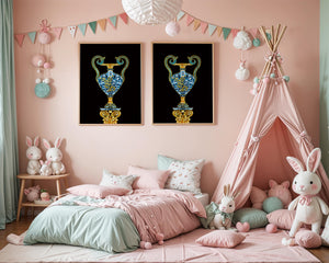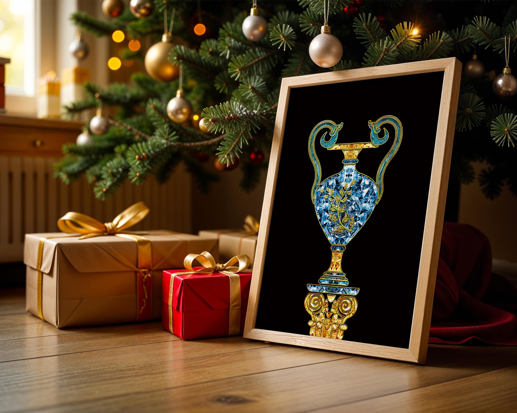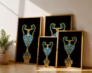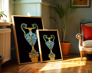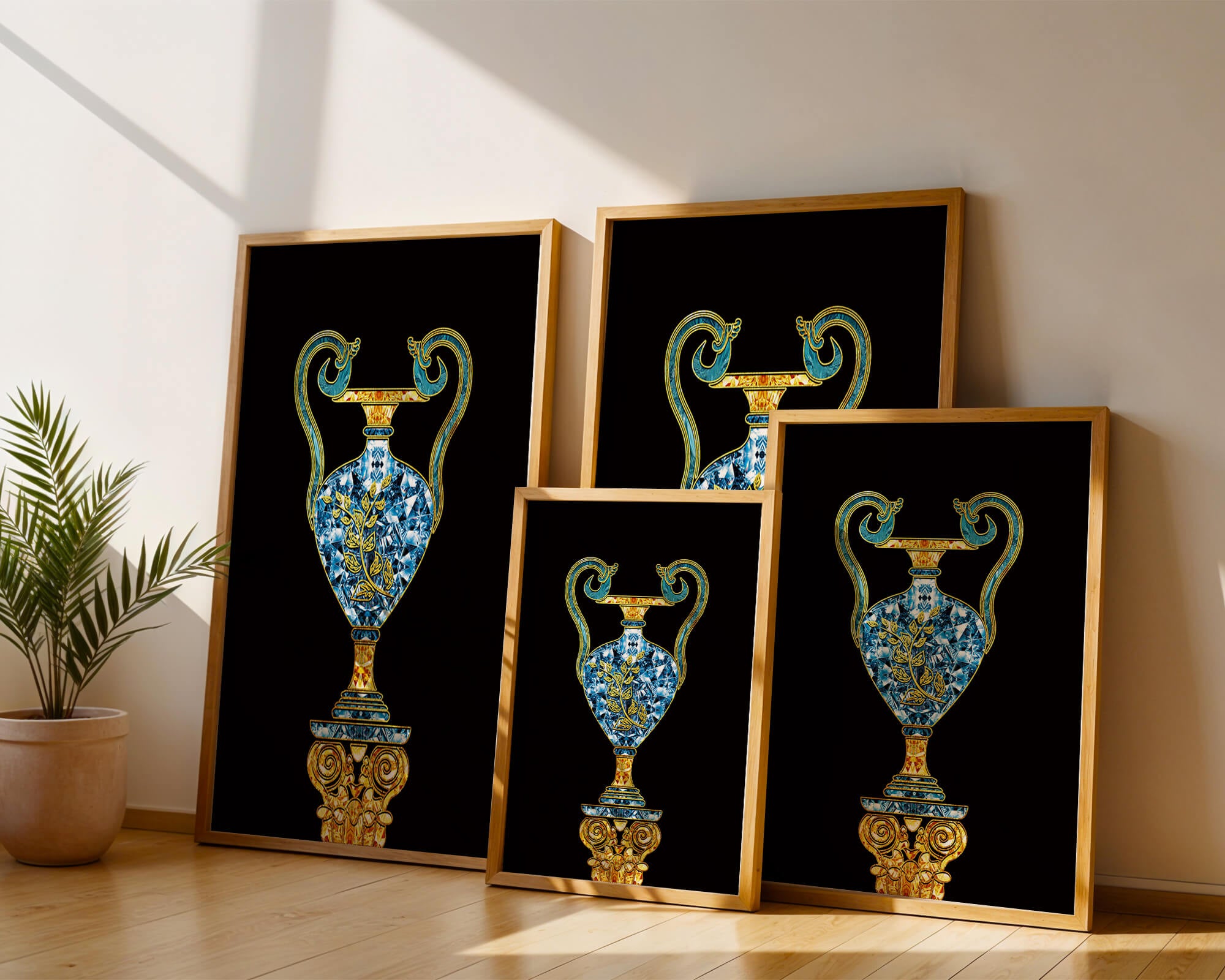Изысканное изображение вазы, украшенной драгоценными камнями, демонстрирует сложное мастерство с золотыми и синими элементами на фоне яркого черного цвета. Роскошный дизайн подчеркивает элегантность и роскошь этого элемента декора.