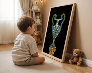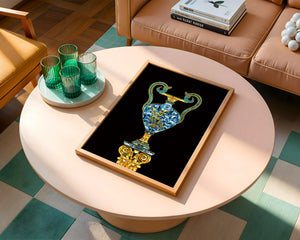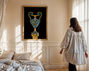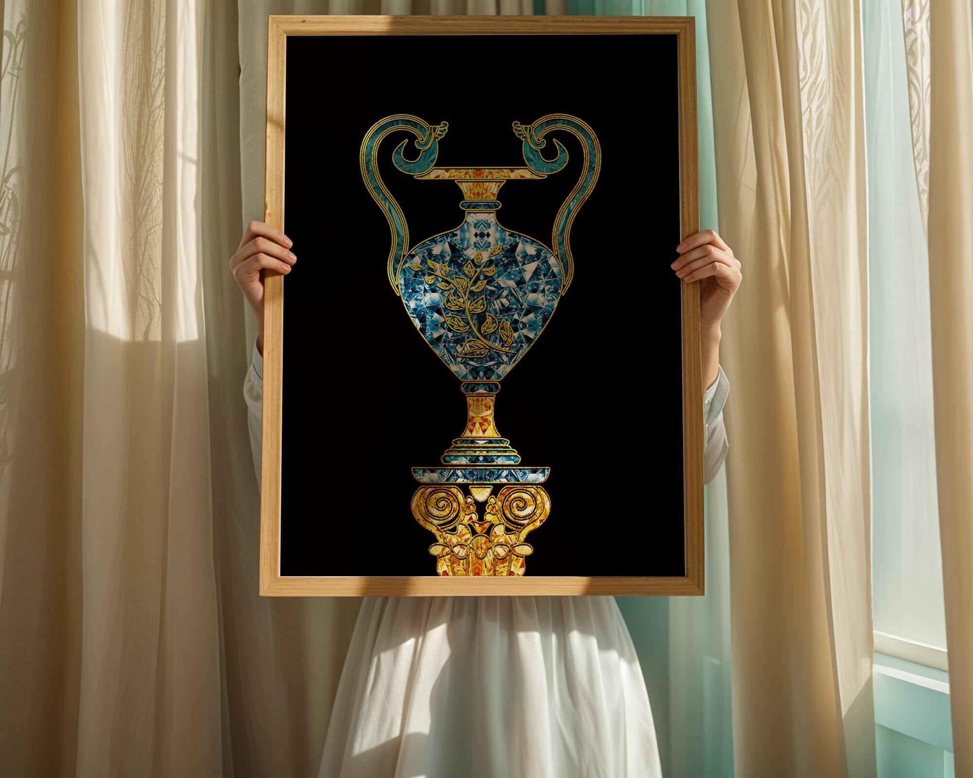 Это произведение искусства представляет собой потрясающую вазу, богато украшенную мотивами из драгоценных камней в синем и золотом цветах. Ваза излучает чувство элегантности и утонченности, закрепленное ее изысканным дизайном, который сочетает классические и современные стили. Тщательно подобранное расположение драгоценных камней создает ослепительный эффект, делая ее центром внимания в любой комнате. Благодаря своим ярким цветам и гармоничному составу, этот элемент декора идеально подходит для тех, кто хочет добавить своему пространству немного роскоши и художественного изящества. Золотые акценты эффектно контрастируют с глубокими синими тонами и темным фоном, усиливая привлекательность вазы.| Тип |