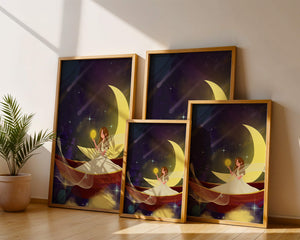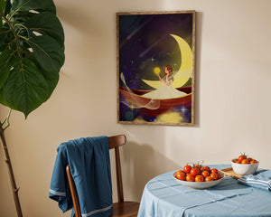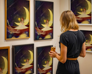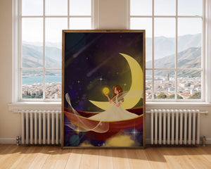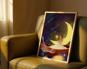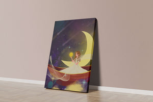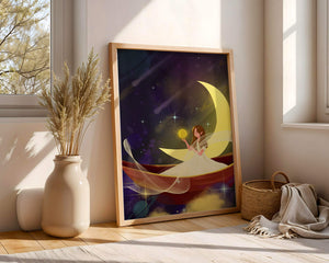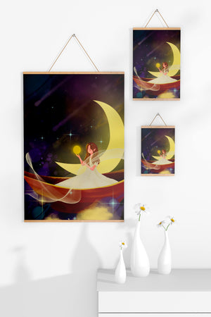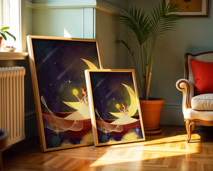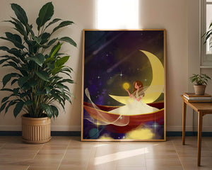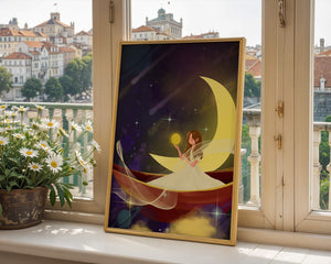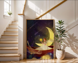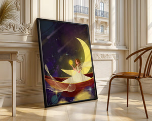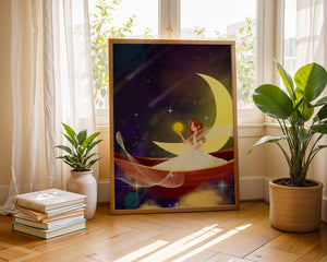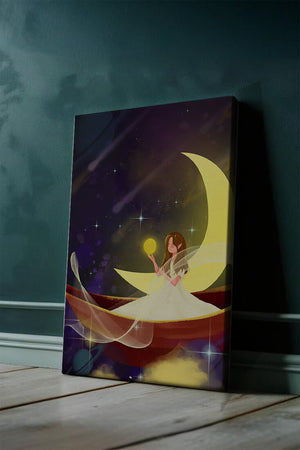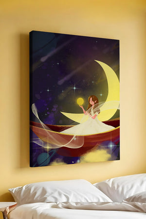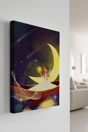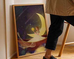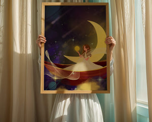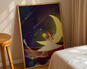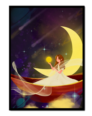 Молодая фея, одетая в струящееся белое платье, держит светящийся шар, который, кажется, излучает лучистый свет. Её спокойное выражение лица усиливает неземное качество работы, поскольку она обитает в сновидном царстве, наполненном мерцающими звёздами и завихряющимися галактиками. Серп луны бережно поддерживает её, служа небесным троном, пока она задумчиво вглядывается в бескрайнее пространство космоса. Глубокие оттенки синего и фиолетового фона усиливают мистическую атмосферу, усыпанную планетами и туманностями, которые вьются и танцуют в ночном небе. Сочетание этих элементов создаёт поразительный контраст с мягким сиянием феи, подчёркивая её присутствие и тот очаровательный мир, в котором она обитает. Это изображение, полное причудливости и удивления, станет идеальным дополнением