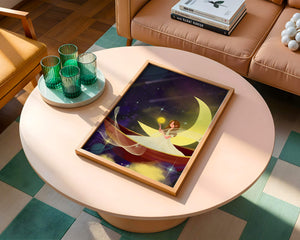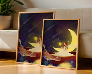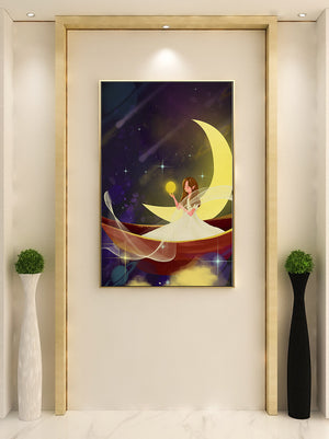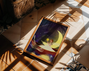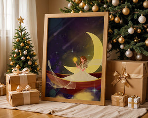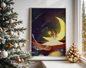 На этой очаровательной картине мы видим изящную фею, грациозно сидящую на ярком серпе луны на фоне звёздного неба. Сцена богата фантастическими элементами, вызывающими чувство удивления и волшебства, идеально подходящими для разжигания воображения.