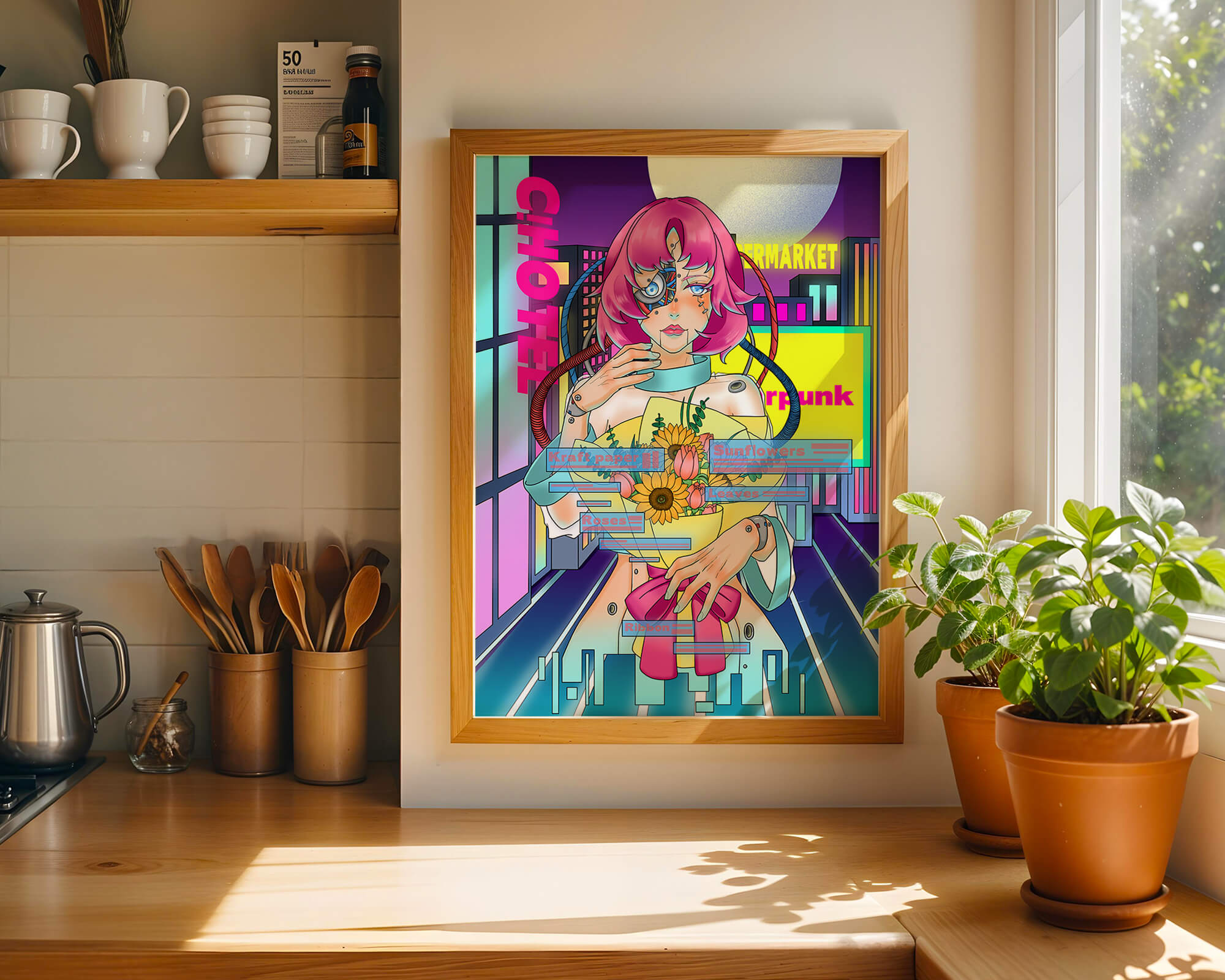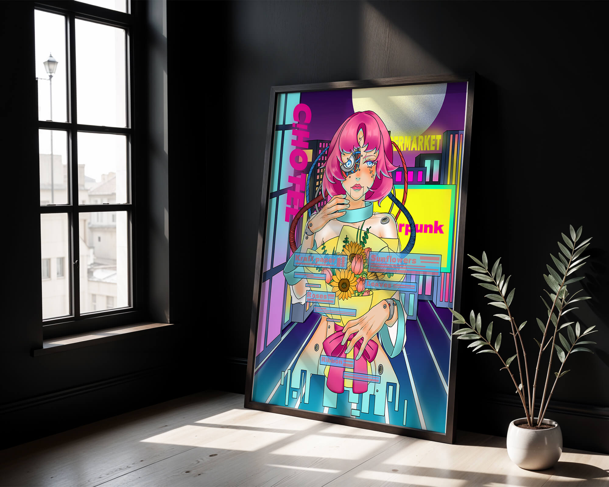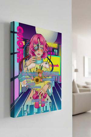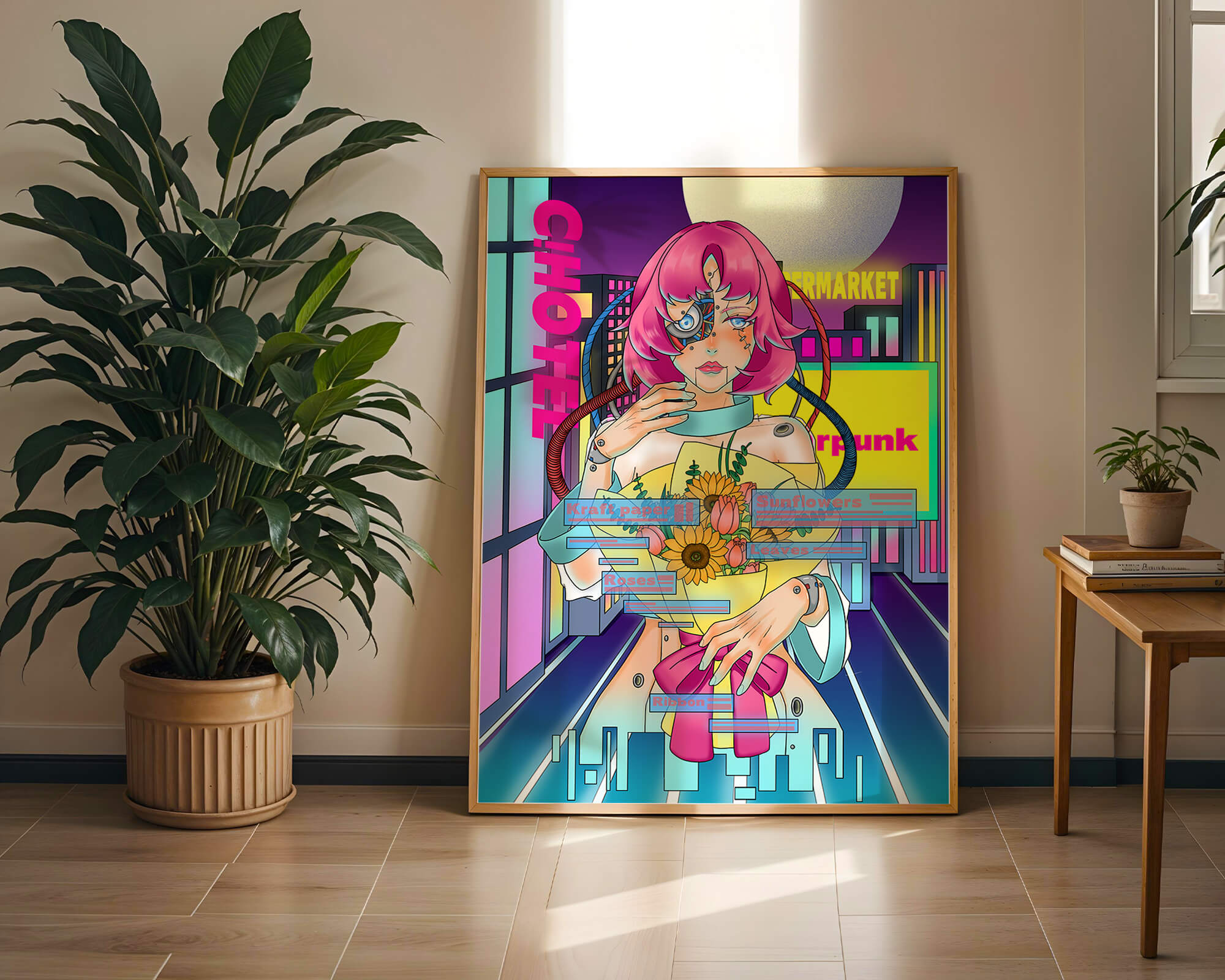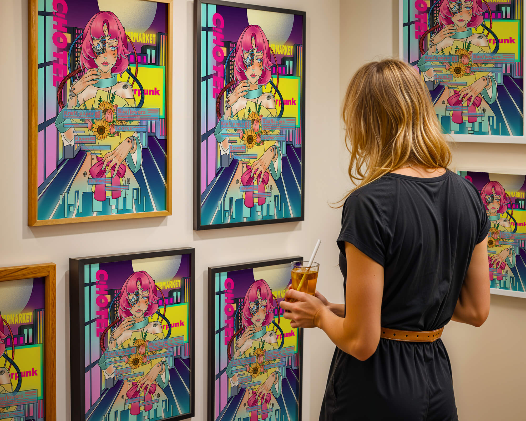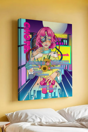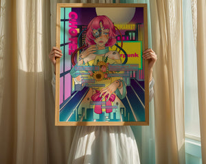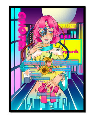 Это произведение изображает футуристическую киборг-женщину с ярко-розовыми волосами, держащую букет подсолнухов на фоне неонового городского пейзажа. Различные технологические элементы связывают её с этой ярко окрашенной и сюрреалистичной городской средой.