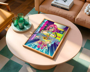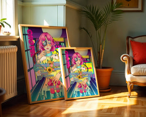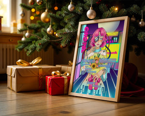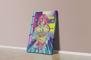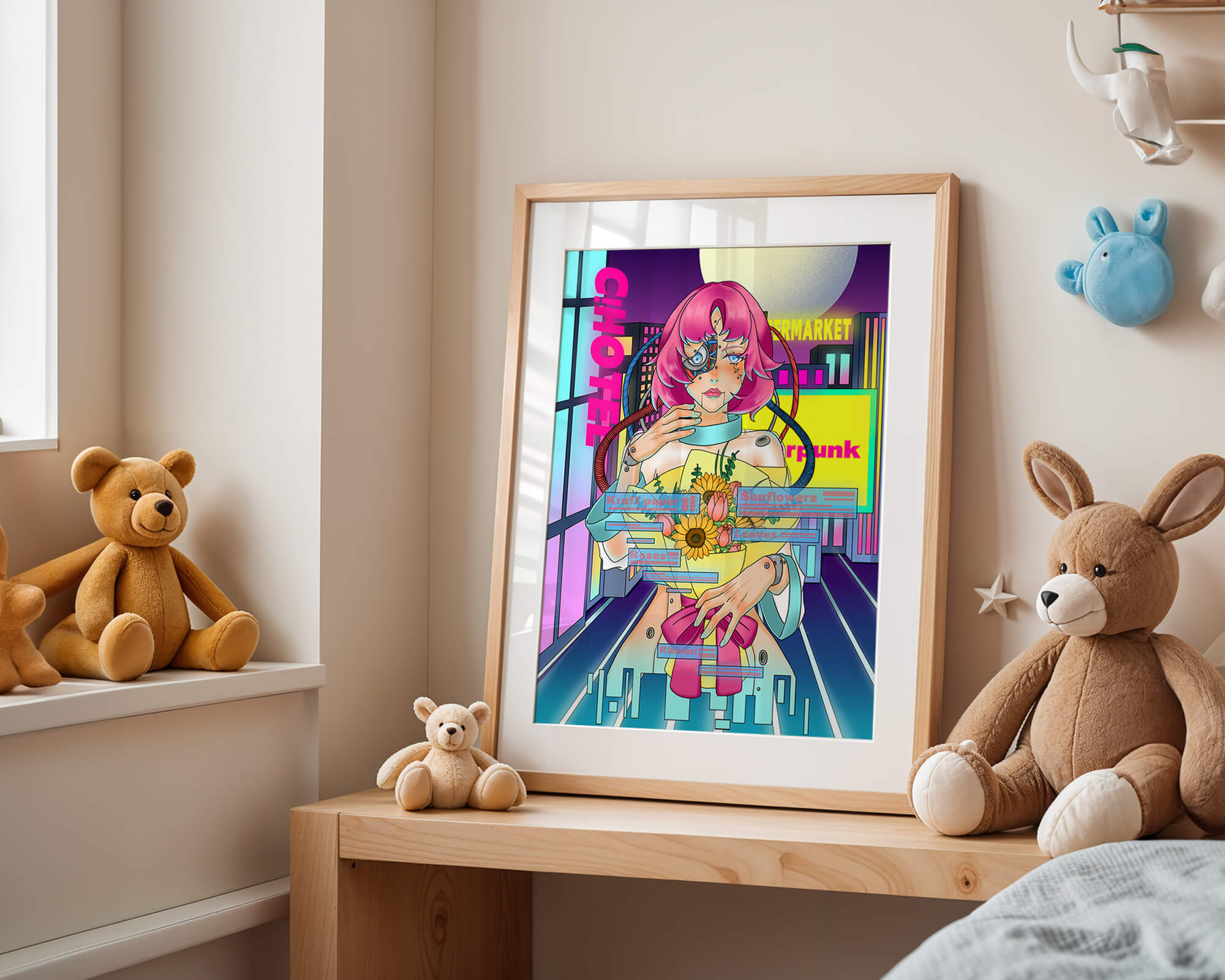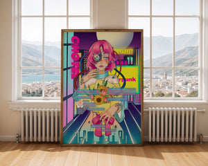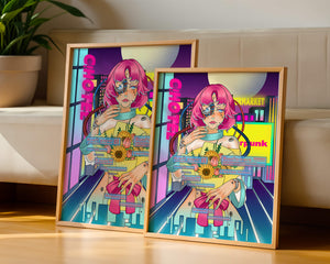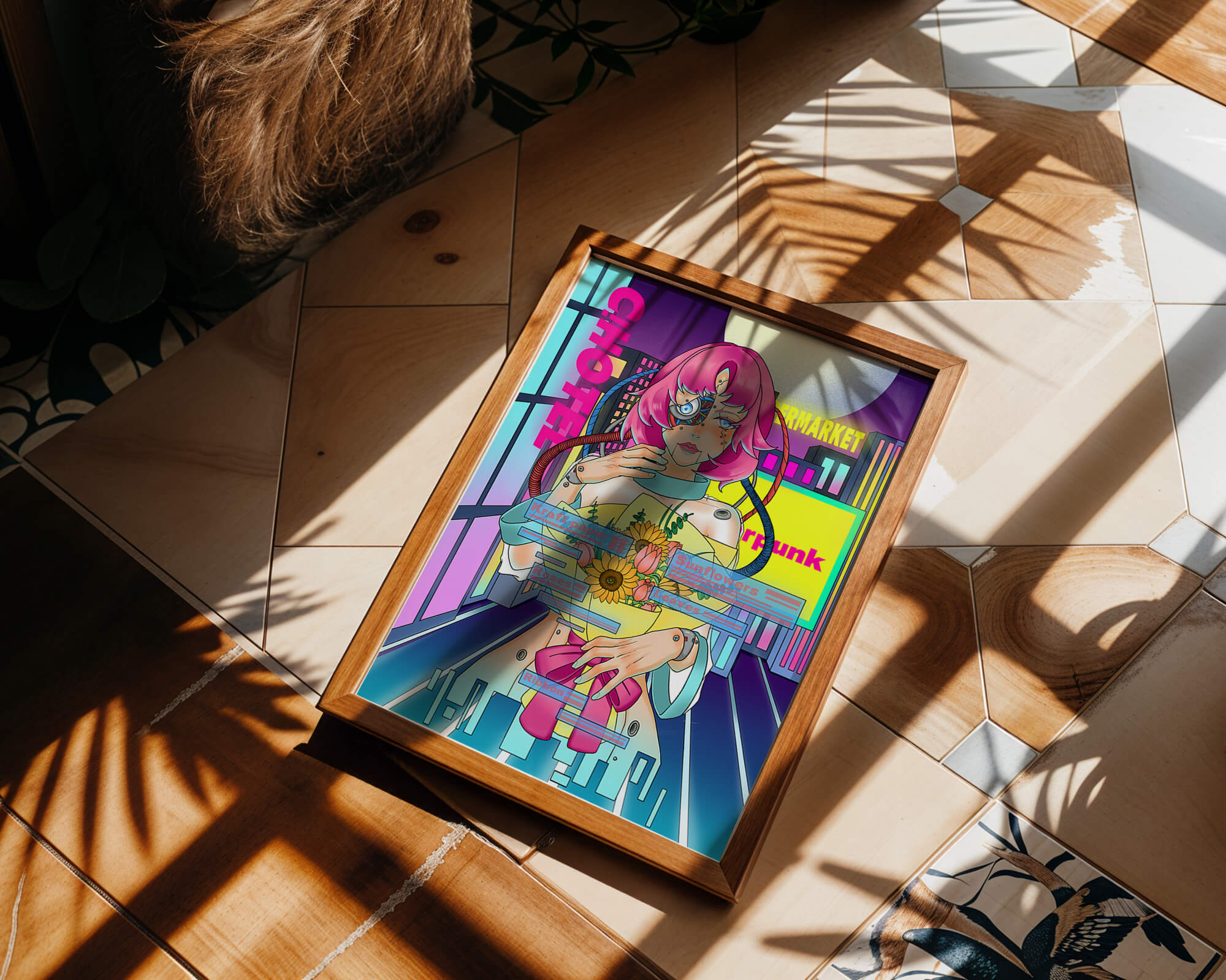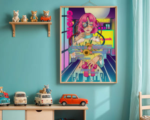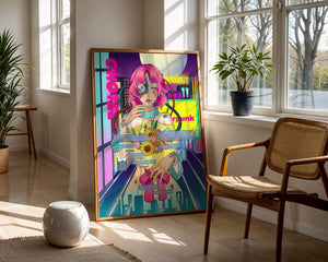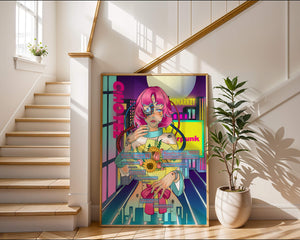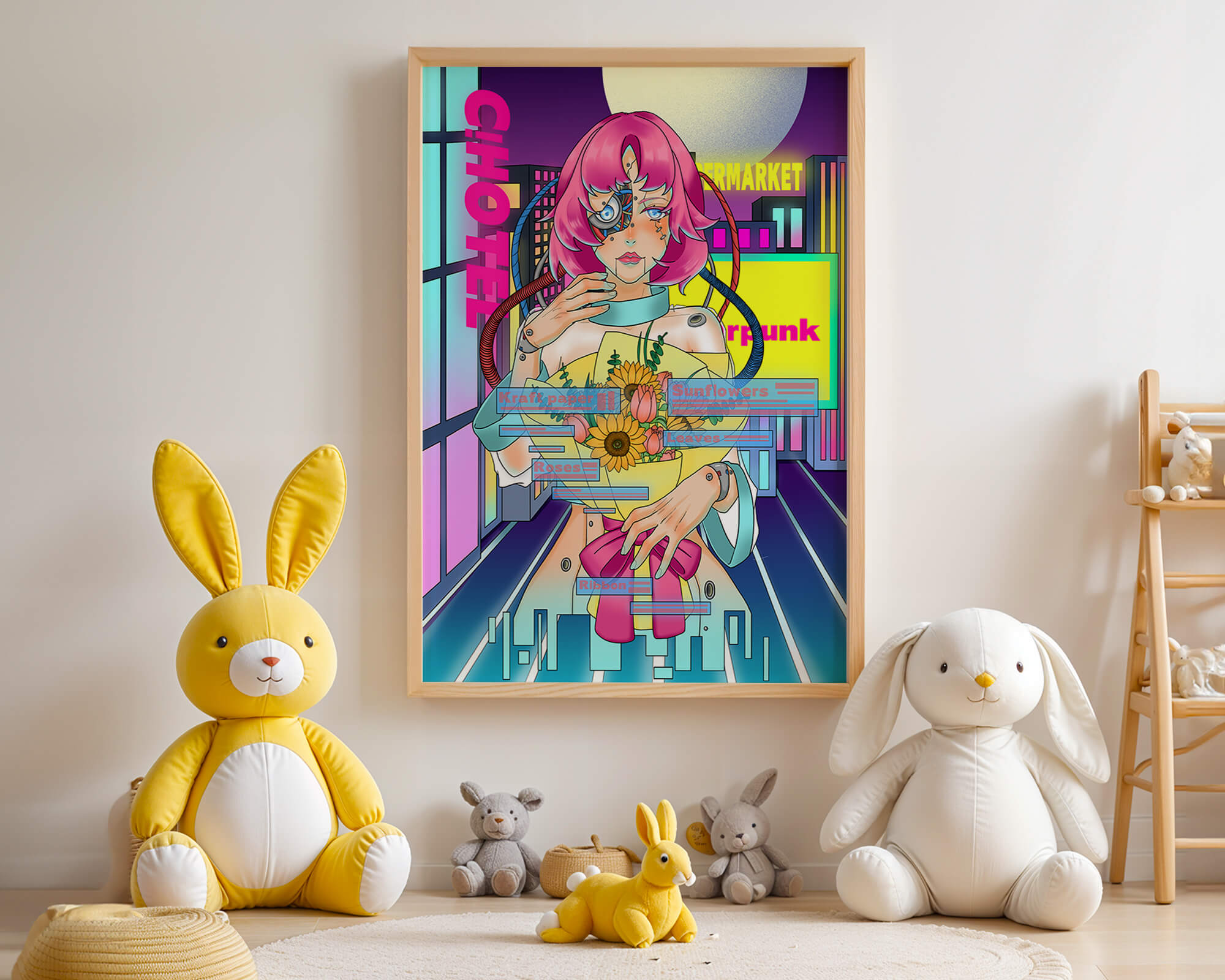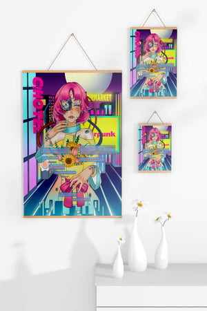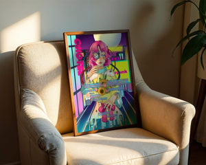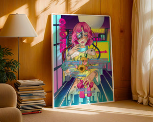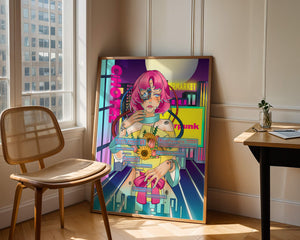 Это произведение изображает футуристическую киборг-женщину с ярко-розовыми волосами, держащую букет подсолнухов на фоне неонового городского пейзажа. Различные технологические элементы связывают её с этой ярко окрашенной и сюрреалистичной городской средой.