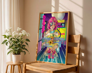 Изображение представляет собой поразительное сопоставление человеческих и механических элементов, воплощённое в дизайне киборг-женщины. Её розовые волосы резко контрастируют со сложным неоновым городским пейзажем, намекая на мир, в котором грань между органическим и синтетическим размыта.