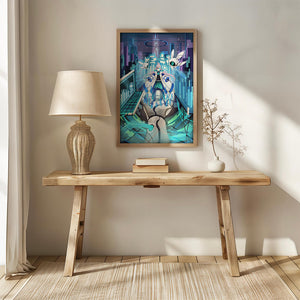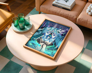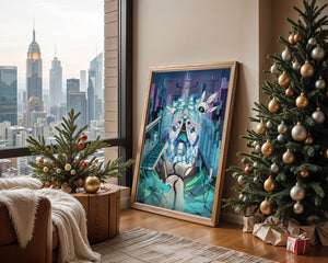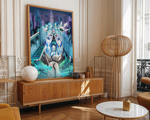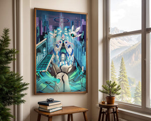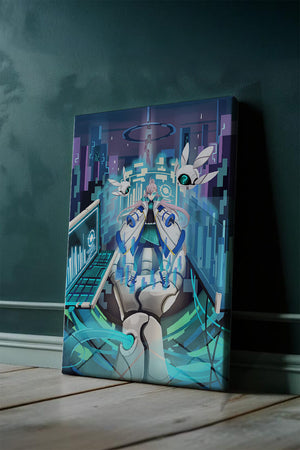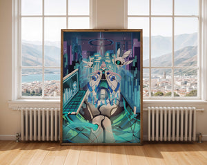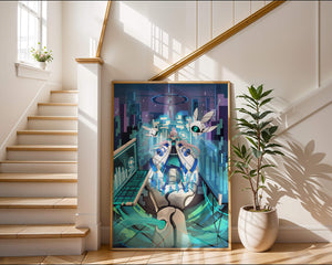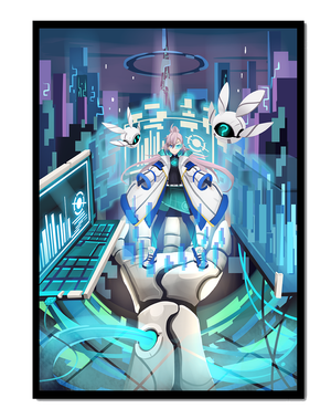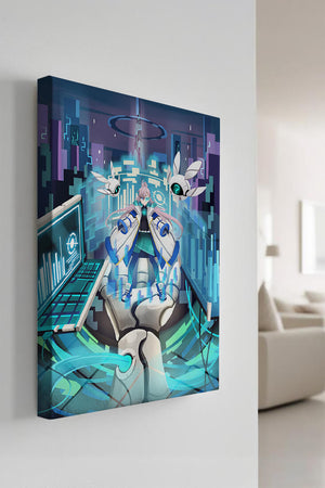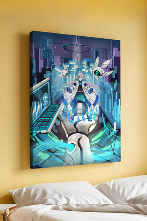Этот захватывающий цифровой арт изображает динамичную сцену в футуристическом городском пейзаже. В центре находится аниме-персонаж, одетый в одежду в стиле научной фантастики, сидящий в огромной роботизированной руке, окруженной голографическими интерфейсами и роботизированными спутниками. Яркие синие и фиолетовые цвета, вместе с парящими цифровыми элементами, создают богатую погружающую кибер-среду, напоминающую виртуальные миры. Сцена полна технологии, начиная от продвинутой консоли, отображающей сложные данные, и заканчивая горизонтом города, освещенным неоновыми огнями. Интеграция робототехники и цифровых изображений предполагает будущее, в котором технологии и человечество будут безупречно сосуществовать. Эта визуально поразительная работа приглашает зрителей в футуристический мир, полный возможностей и интриги, идеальный для тех, кто любит научную фантастику, аниме и цифровое искусство.
