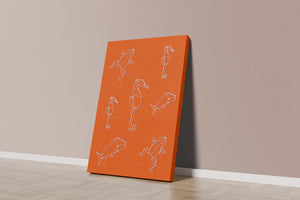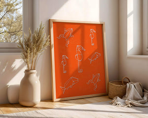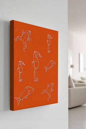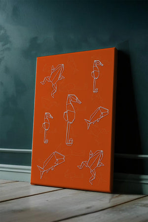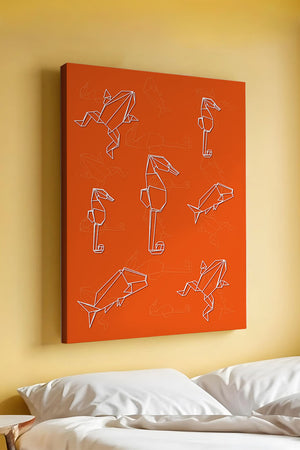 Изображение демонстрирует яркую коллекцию геометрических узоров животных на фоне насыщенного оранжевого цвета. Эти абстрактные дизайны включают в себя силуэты морских коньков, лягушек и китов, выполненные в минималистичном стиле, вдохновленном оригами.