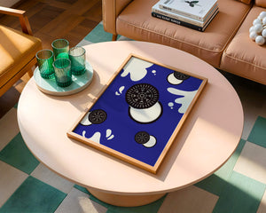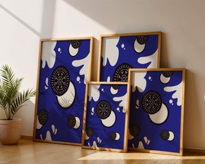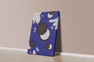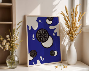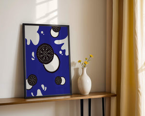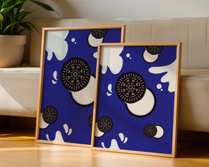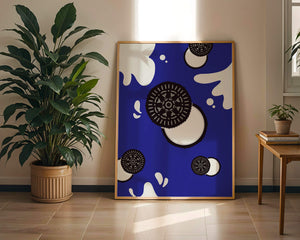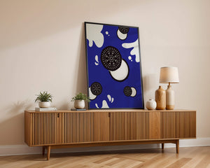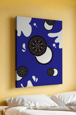 Изображение выделяет стилизованные печенья, представленные в виде концентрических черно-белых кругов, динамично распределённых по холсту. Они сочетаются с абстрактными белыми брызгами, напоминающими молоко, создавая захватывающую картину, которая смело выделяется на ярком синем фоне. Простота дизайна усилена богатством контрастных цветов, придавая произведению яркий визуальный эффект. Идеально подходит для оживления пространств, таких как кухни или столовые, этот графический дизайн гармонично сочетает элементы современности и игривости. Его смелый и художественный стиль не только добавляет причудливый штрих в декор, но и служит привлекающей внимание центральной точкой, что делает его отличным выбором для тех, кто хочет добавить немного веселья в своё интерьерное пространство.| Тип |
