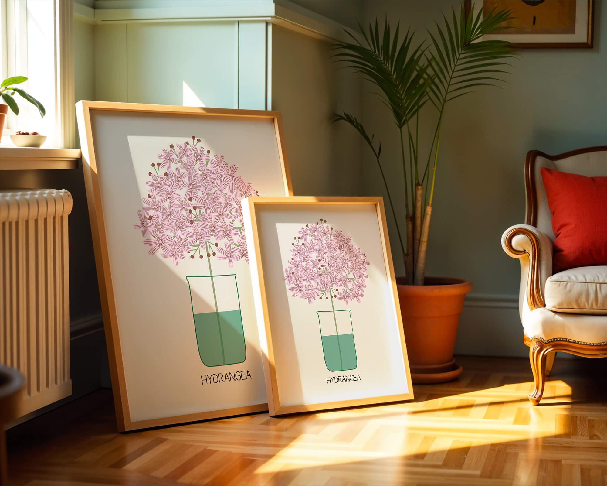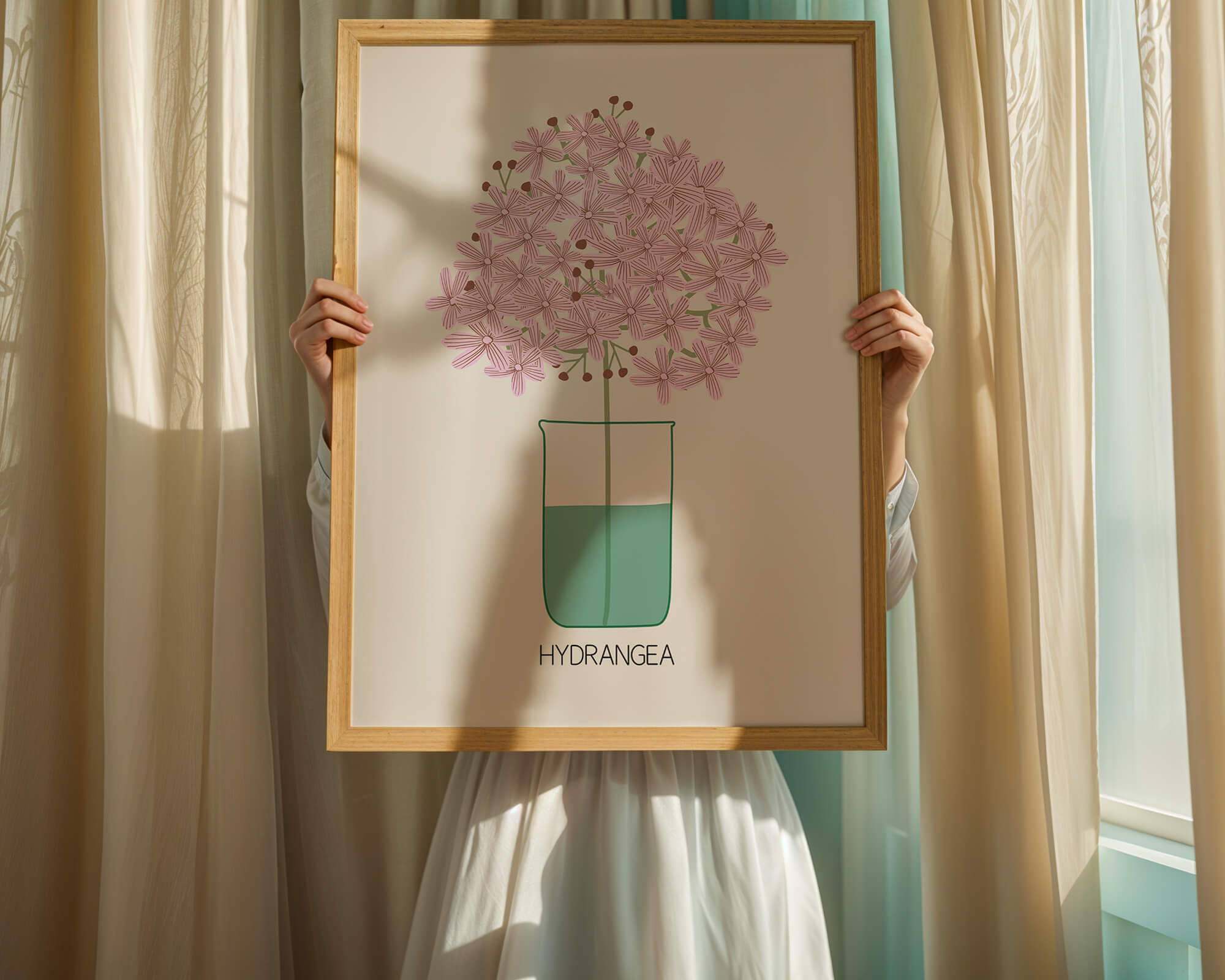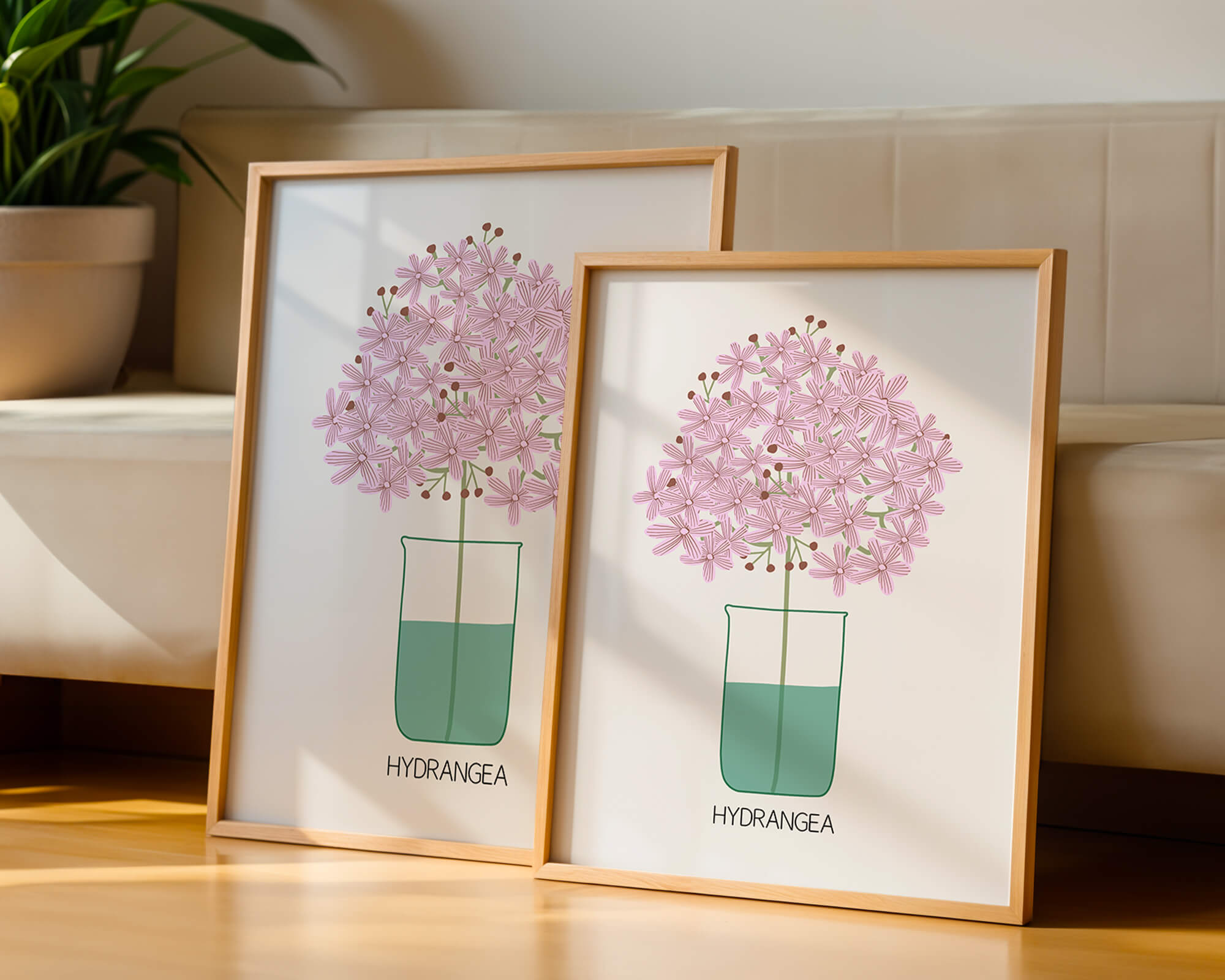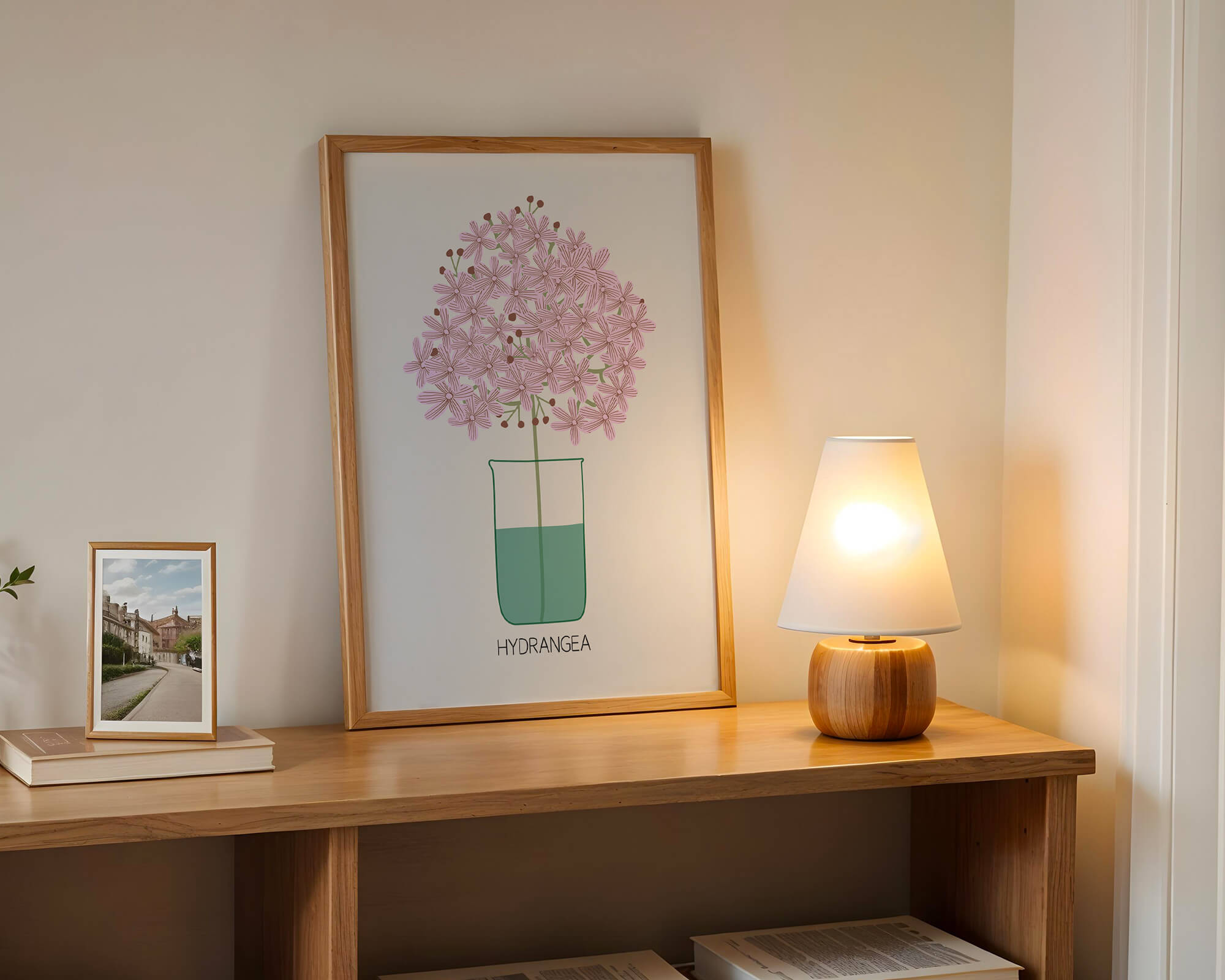 Цветы гортензии изображены с детальной проработкой линий, подчеркивающих их нежные лепестки и сложную структуру. Для соцветий используются оттенки розового, придающие им мягкий и привлекательный вид. Цветы расположены на нейтральном фоне, что позволяет их естественной красоте выделяться. Ваза выполнена в минималистичном стиле, с намёком на зелень, которая дополняет стебли цветов. Это изображение передает вечное очарование гортензий, делая его идеальным элементом для декора дома. Независимо от того, находится ли оно в гостиной или офисе, элегантность этого произведения добавляет штрих природного спокойствия в любое пространство.| Тип |