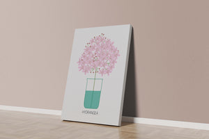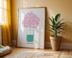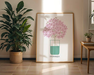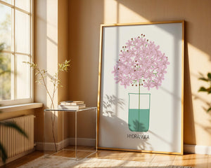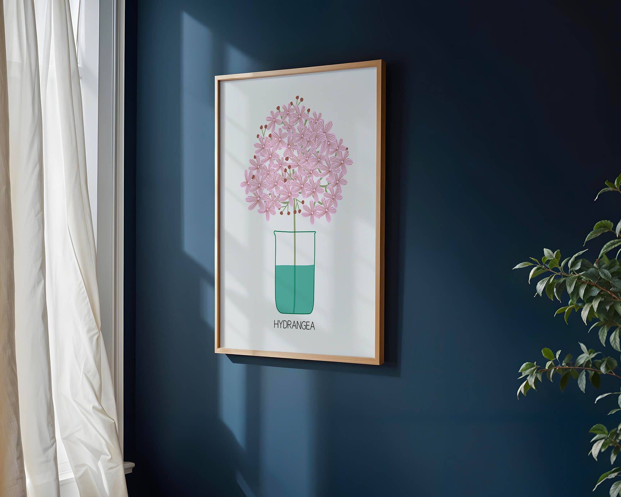 Это изображение представляет собой красивую иллюстрацию цветов гортензии, элегантно оформленных в простой вазе. Произведение искусства использует чистые линии и мягкие цвета, создавая спокойную и утонченную композицию.