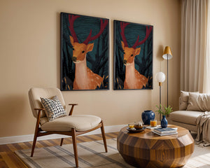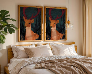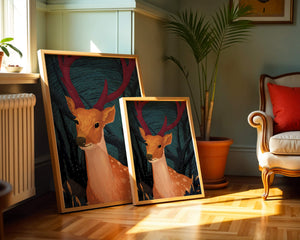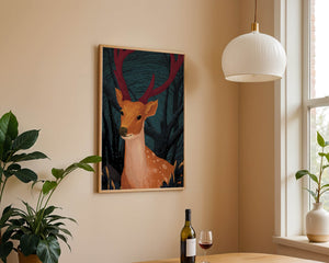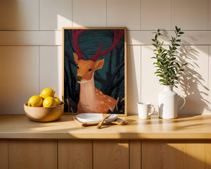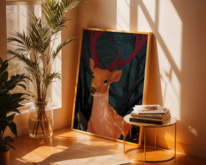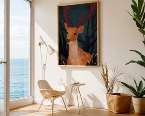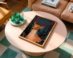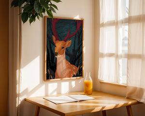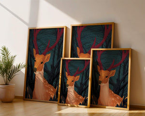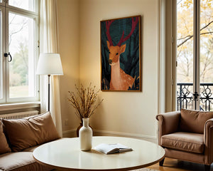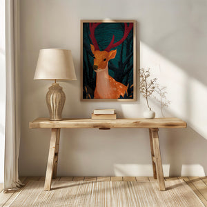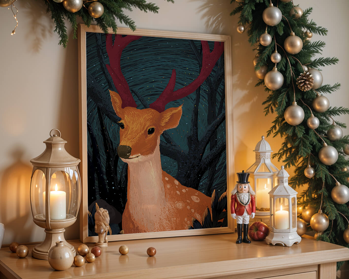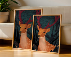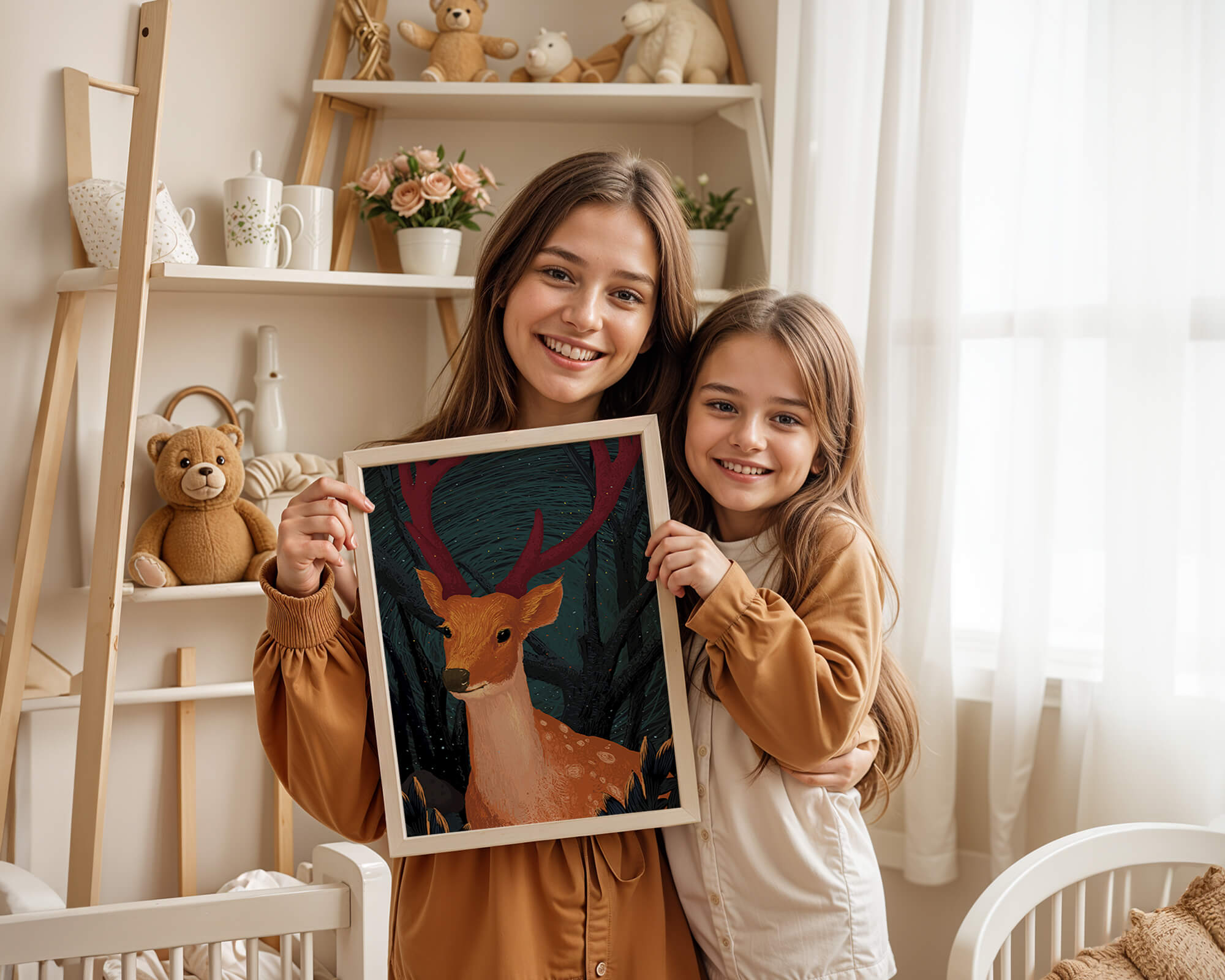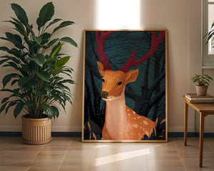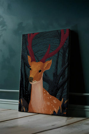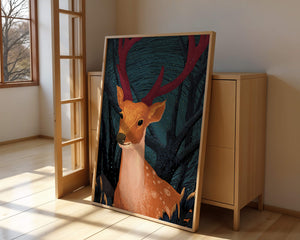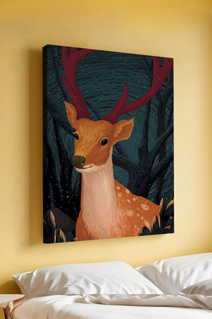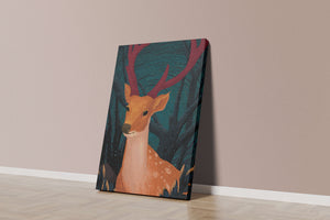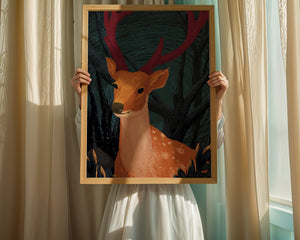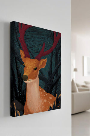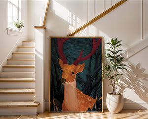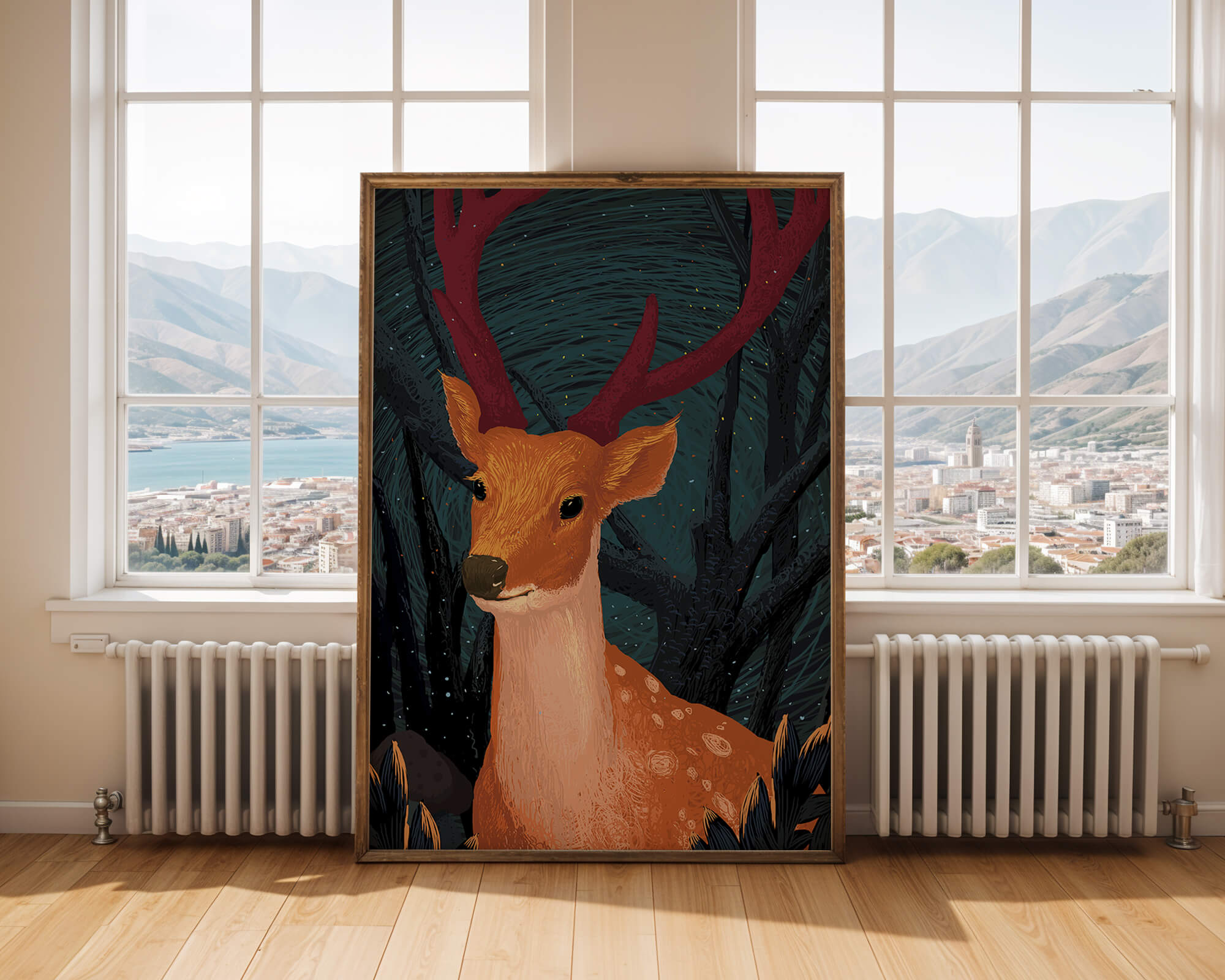Изображение запечатлевает очаровательное изображение оленя, стоящего среди мистического леса. Яркие цвета и детальная иллюстрация создают атмосферу чудес и фантазии.