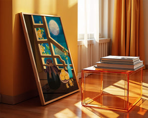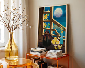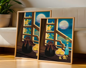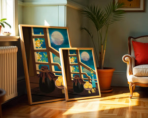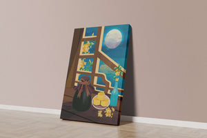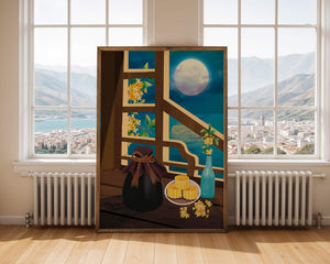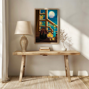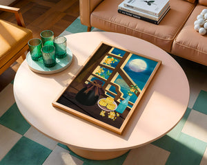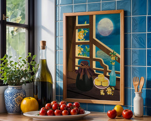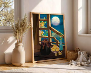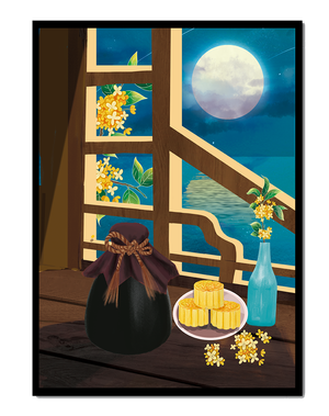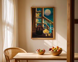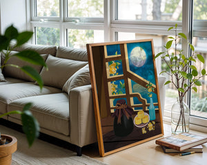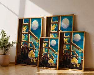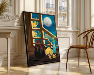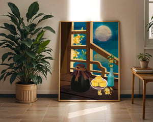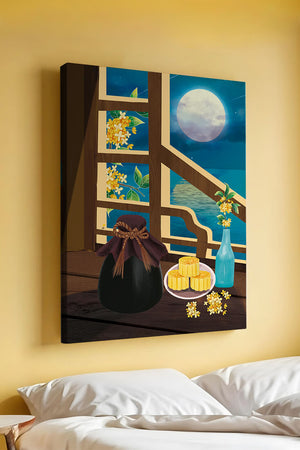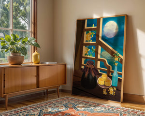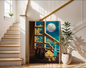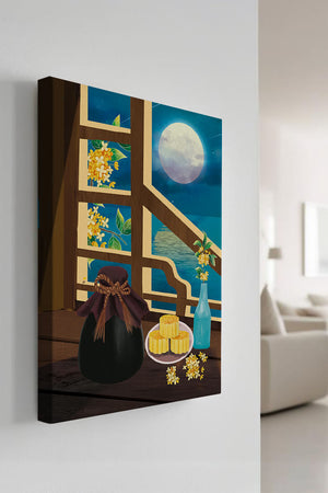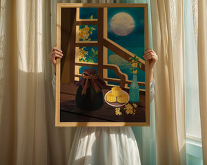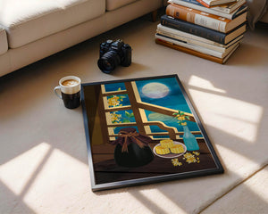 This image captures the essence of a tranquil night, where the full moon casts a gentle glow over the scene. Through the geometric patterns of the window, the moonlight dances across the waters, creating an atmosphere of peaceful reflection.