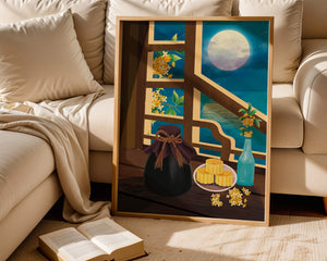 Home Moonlit Night with Mooncakes and Floral Decor on a Wooden Table