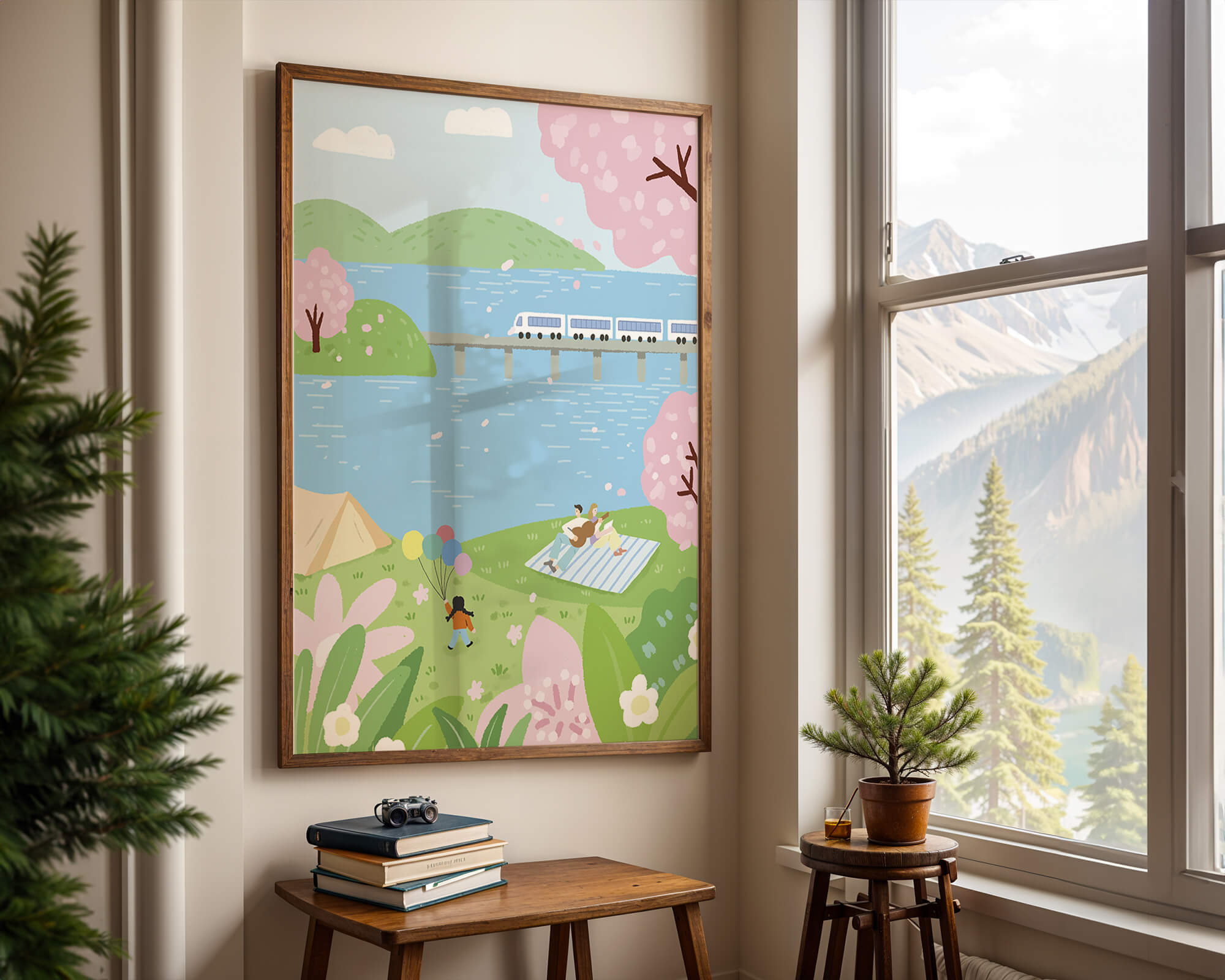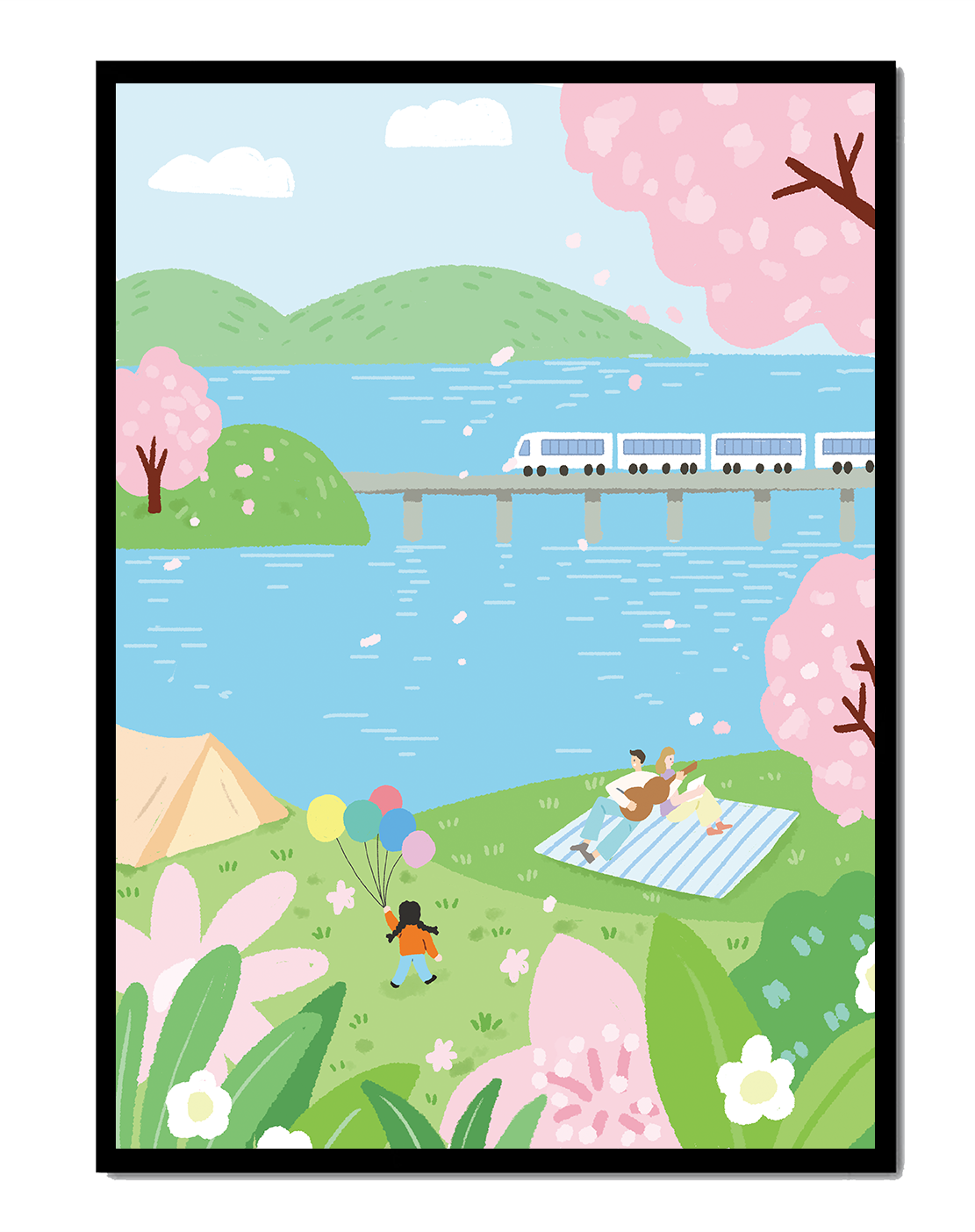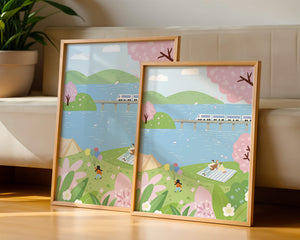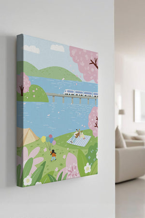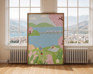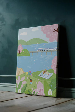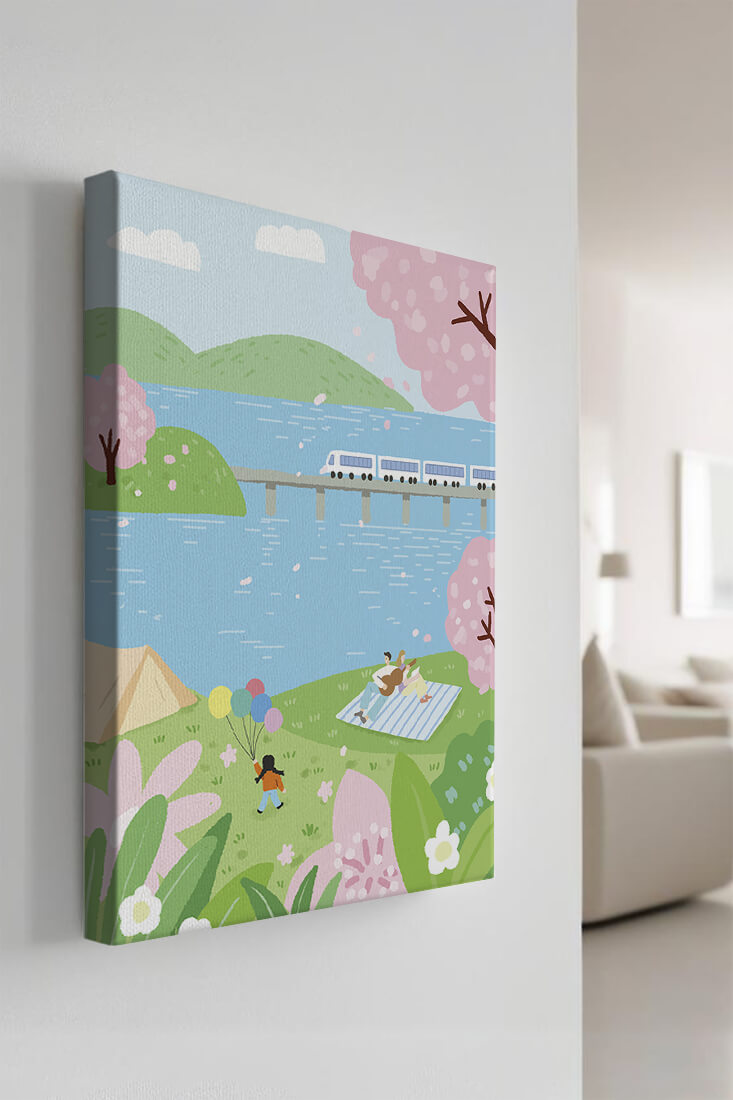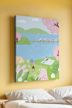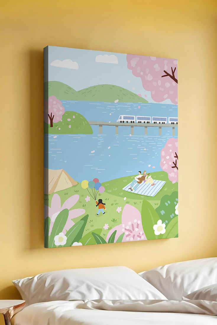 Эта иллюстрация передает суть весны с ее мягкими пастельными цветами и умиротворяющей атмосферой. Семья наслаждается пикником на травянистом холме рядом с прозрачным голубым озером, окруженным пышной зеленью и яркими вишневыми цветами. Присутствие ребенка с воздушными шарами добавляет композиции радостный элемент.Поезд грациозно пересекает мост на заднем плане, символизируя гармонию между природой и технологией. Эта сцена излучает ощущение расслабленности и простоты, делая ее идеальным представлением досуга и семейных моментов в живописной обстановке. Будь то в качестве произведения искусства для вашего дома или как вдохновение для спокойного дня на свежем воздухе, изображение прекрасно воплощает радости весны.