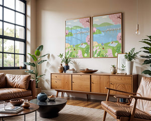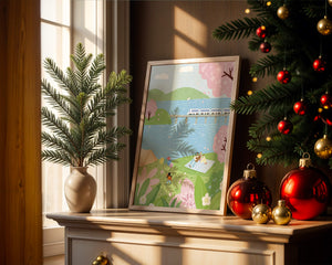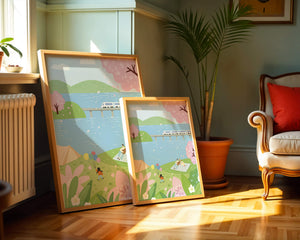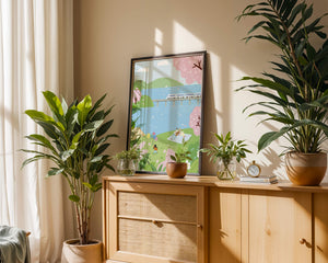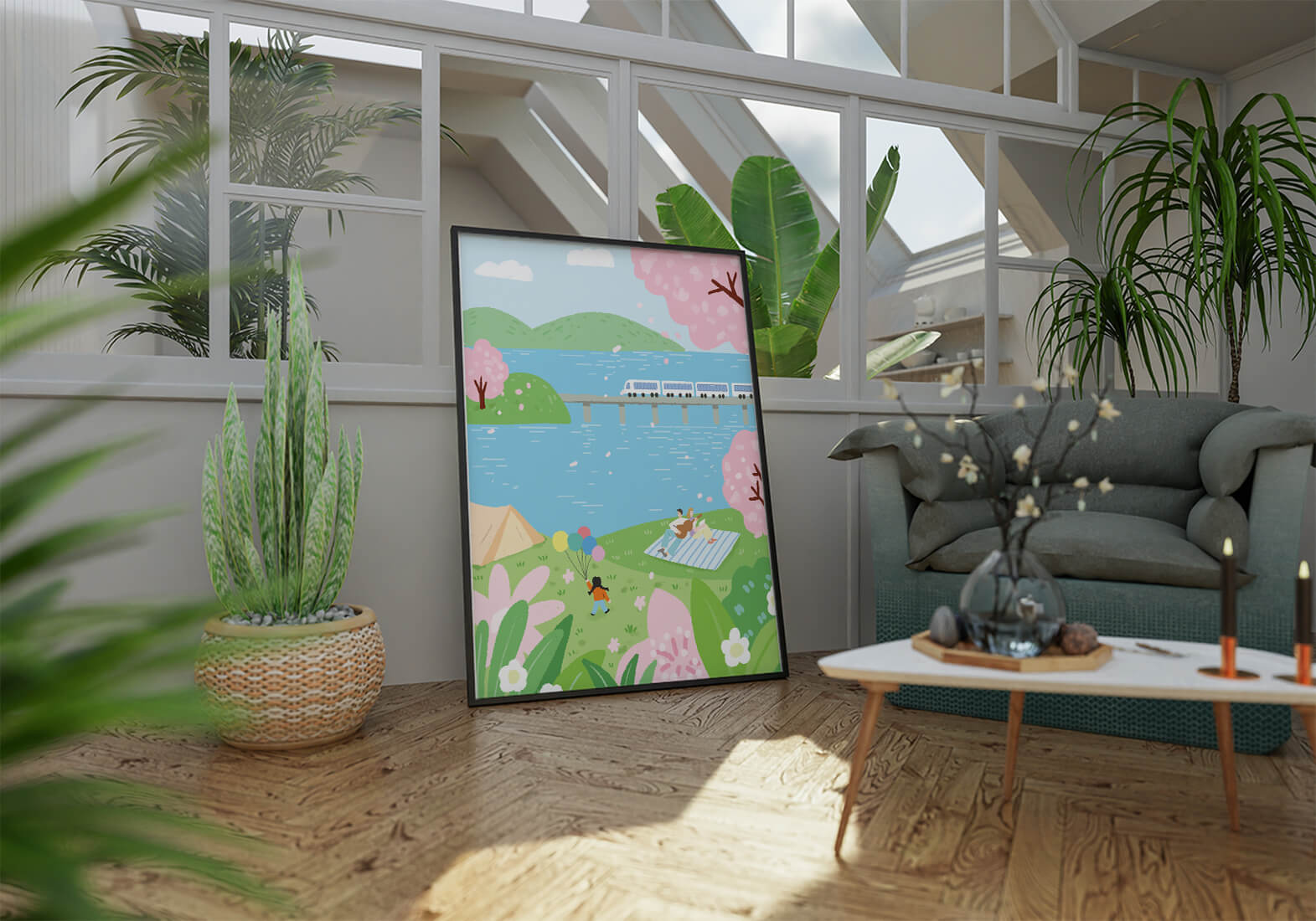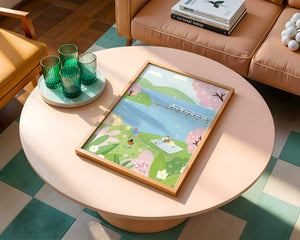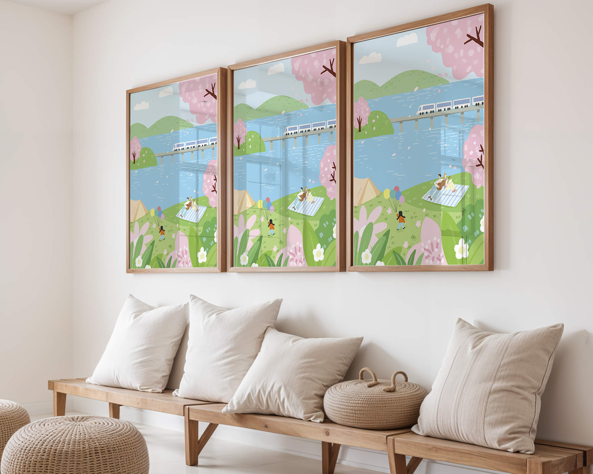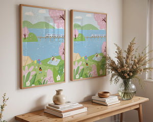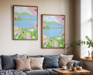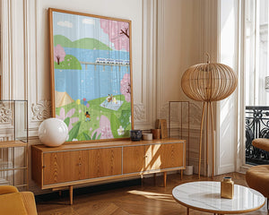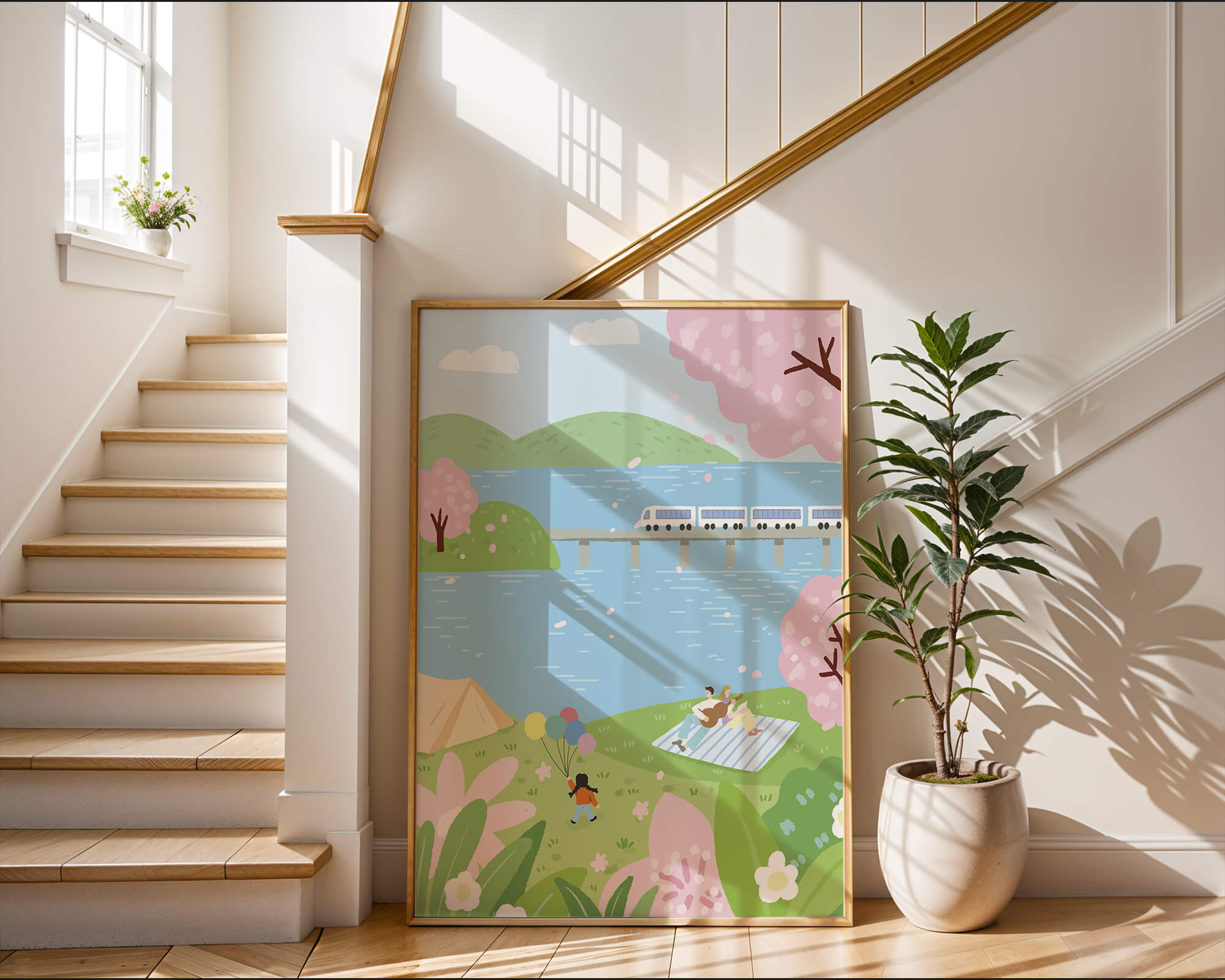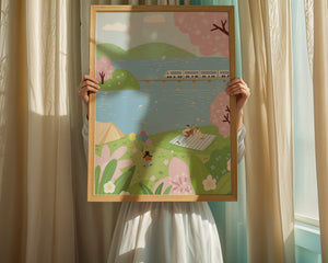 Эта иллюстрация передает суть весны с ее мягкими пастельными цветами и умиротворяющей атмосферой. Семья наслаждается пикником на травянистом холме рядом с прозрачным голубым озером, окруженным пышной зеленью и яркими вишневыми цветами. Присутствие ребенка с воздушными шарами добавляет композиции радостный элемент.Поезд грациозно пересекает мост на заднем плане, символизируя гармонию между природой и технологией. Эта сцена излучает ощущение расслабленности и простоты, делая ее идеальным представлением досуга и семейных моментов в живописной обстановке. Будь то в качестве произведения искусства для вашего дома или как вдохновение для спокойного дня на свежем воздухе, изображение прекрасно воплощает радости весны.