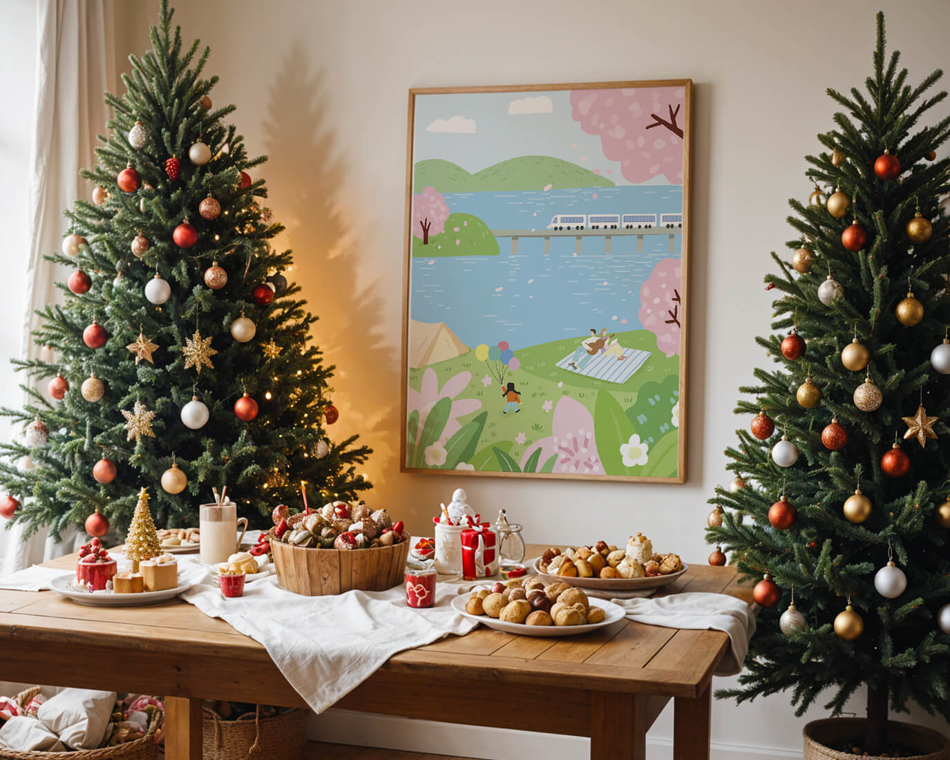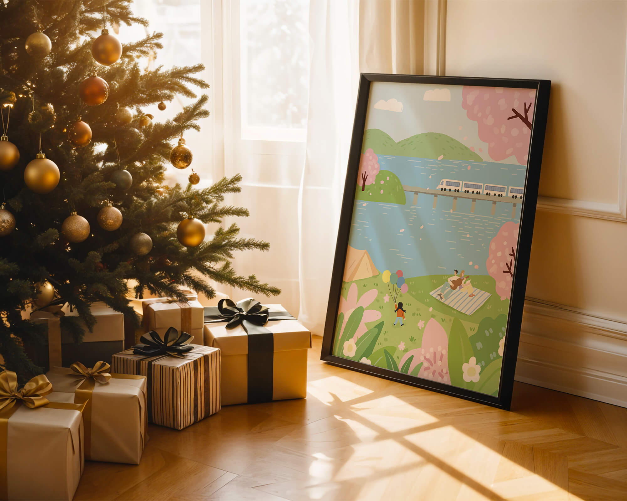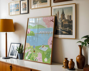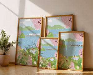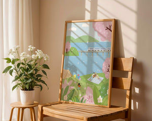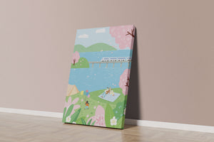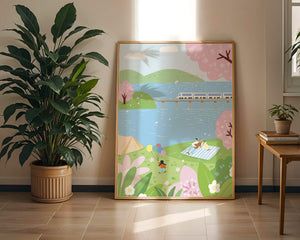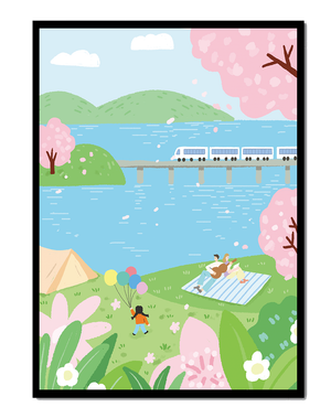 Спокойная сцена, изображающая пикник у озера, окруженный цветущими вишневыми деревьями. На заднем плане поезд проходит по мосту, добавляя современность к спокойной природной среде.