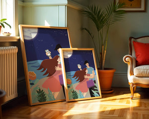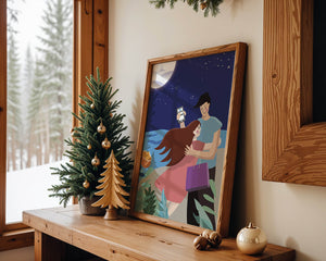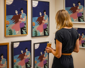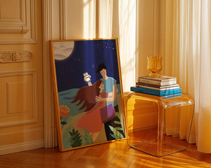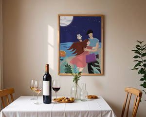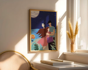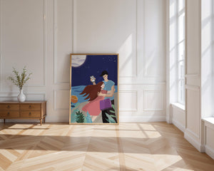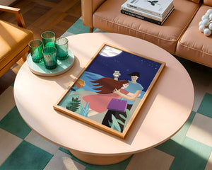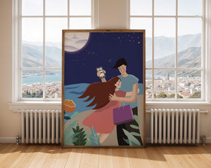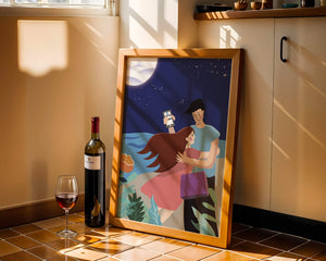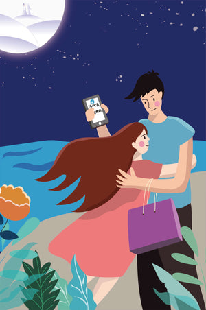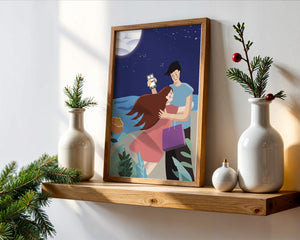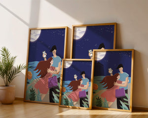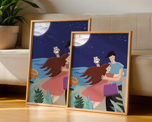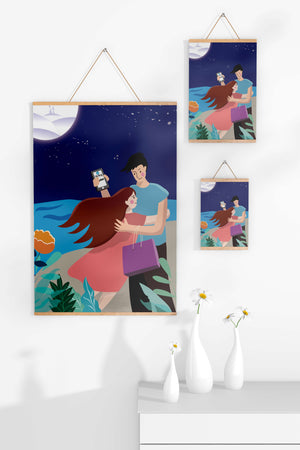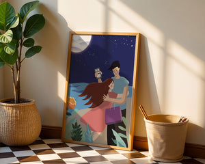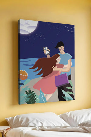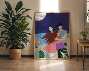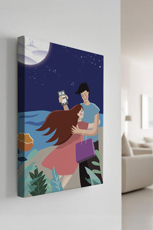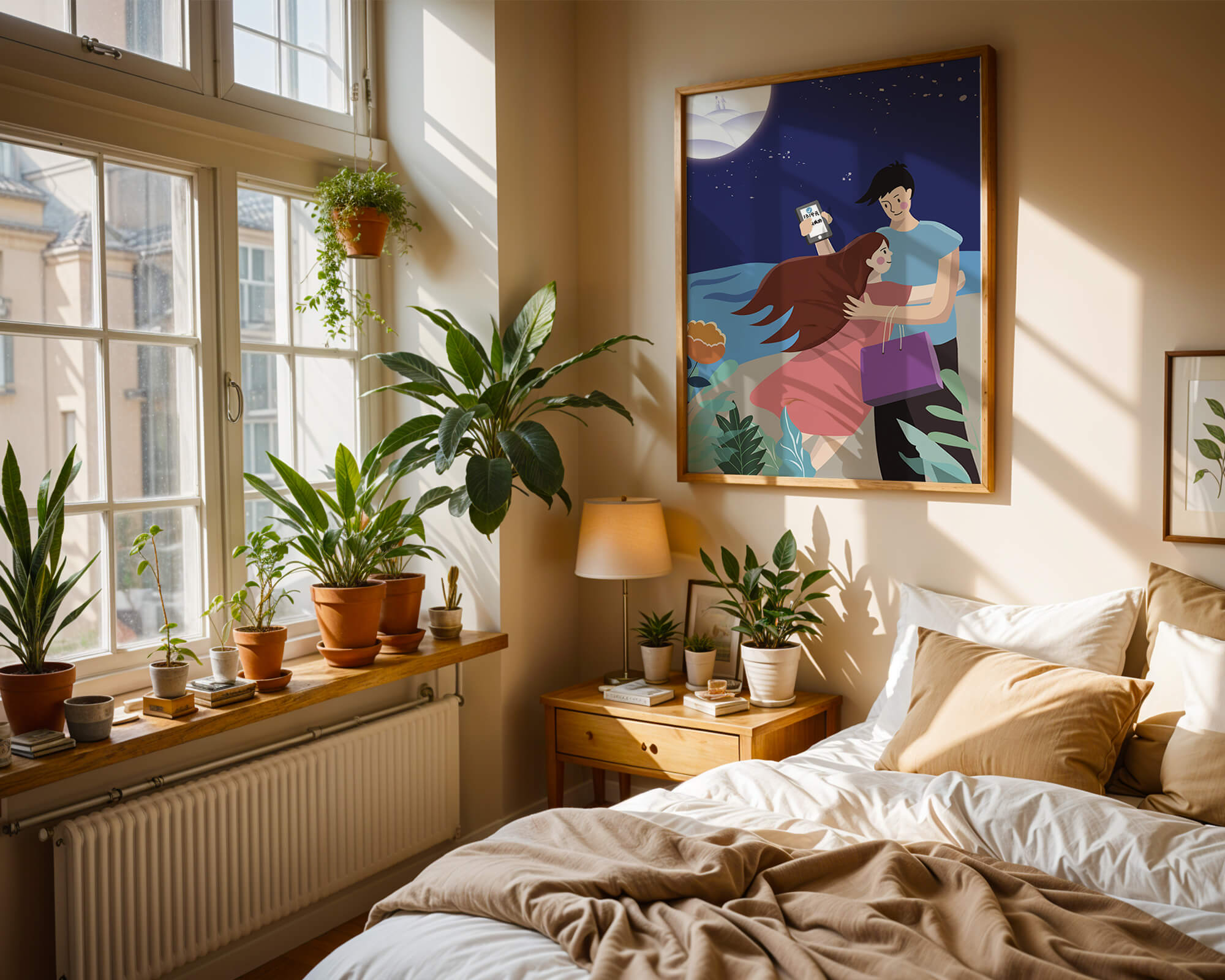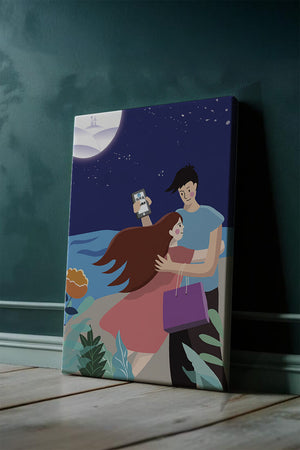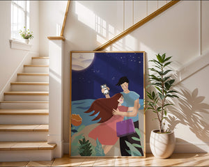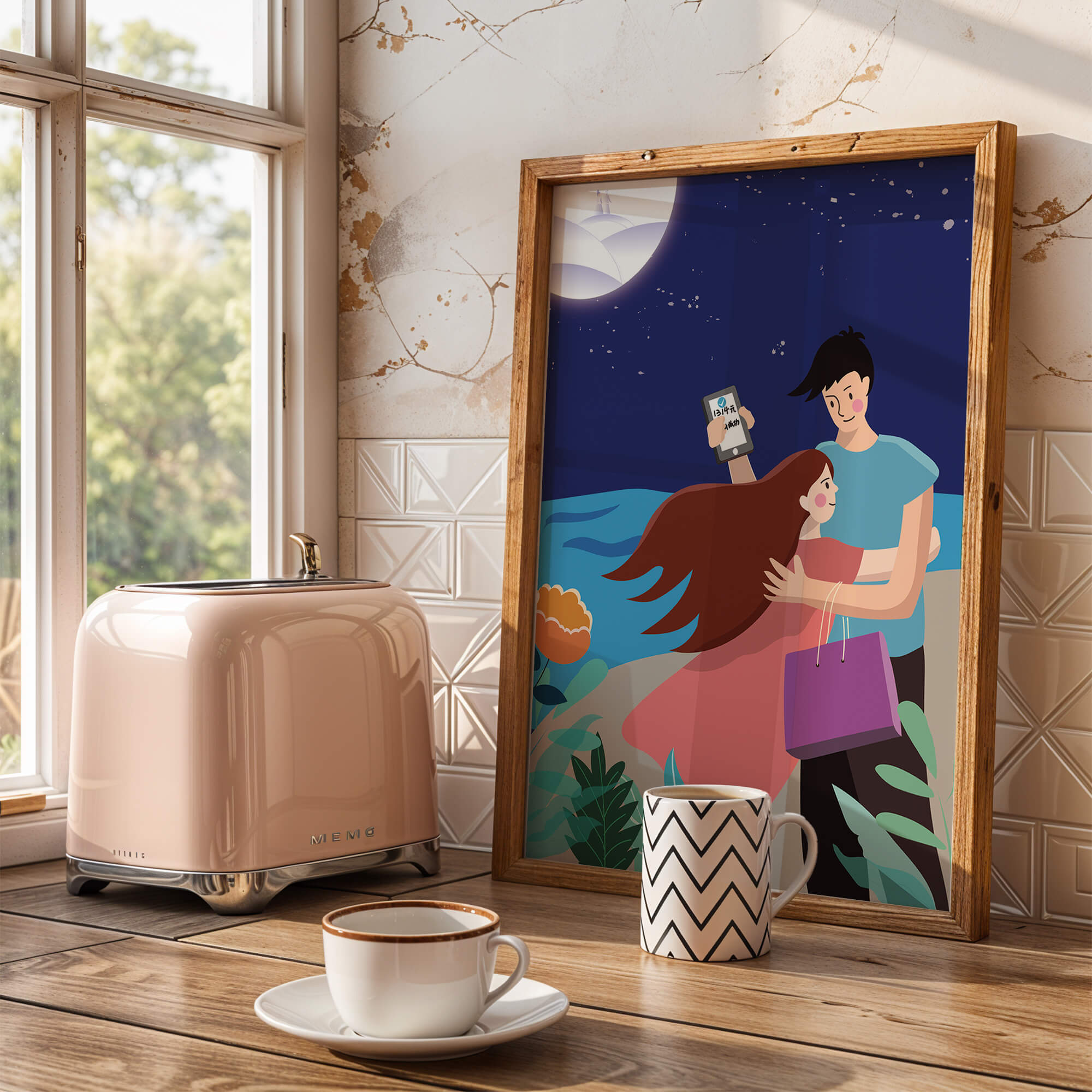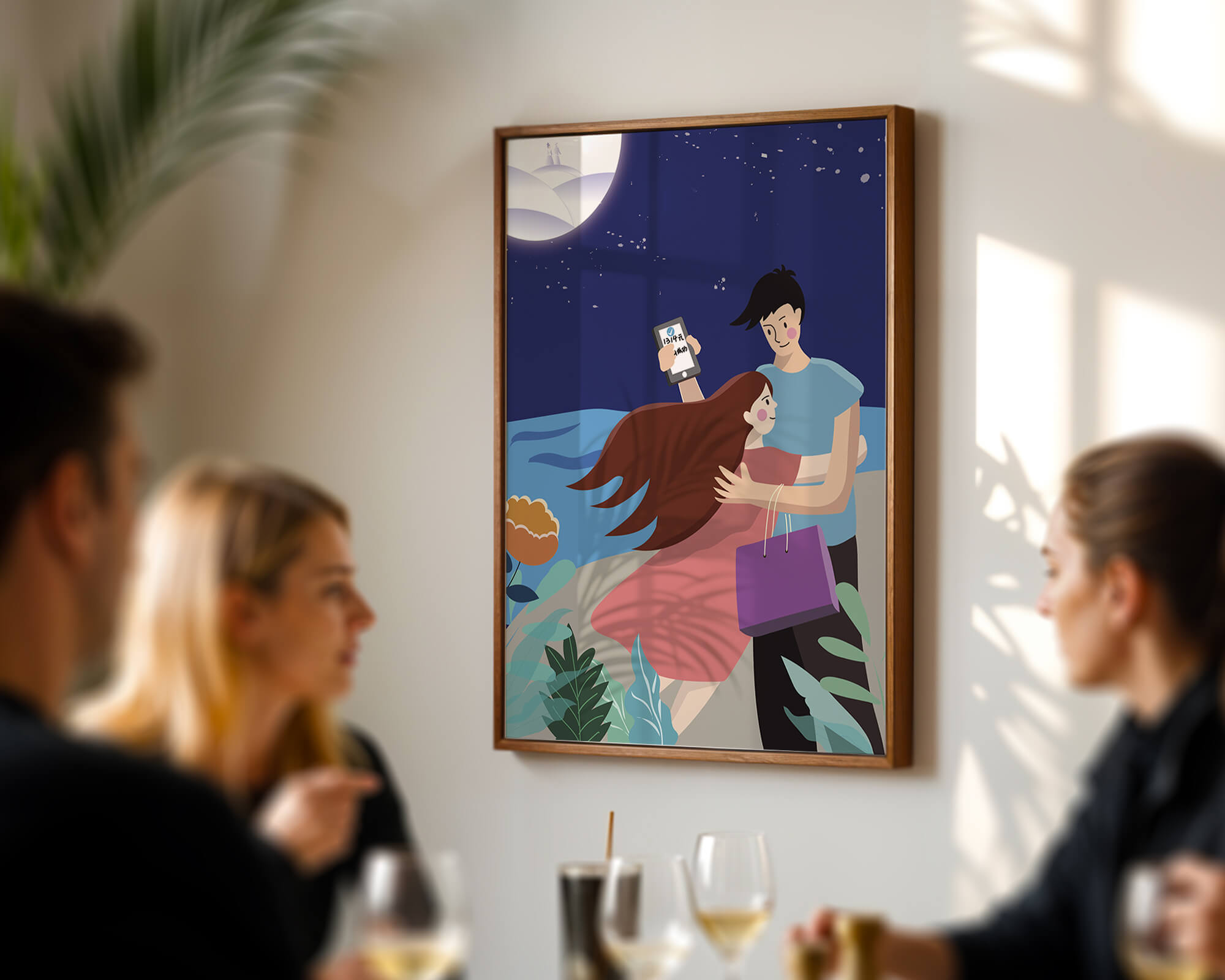 На изображении пара стоит у океана, окруженные пышной зеленью и под звездным ночным небом. Рука мужчины, обнимающая женщину, символизирует тепло и привязанность. Она держит в руках фиолетовый пакет с покупками, что намекает на недавнюю прогулку или обмен подарками. Показ экрана смартфона добавляет современный штрих к сцене, предполагая цифровую связь на фоне природы. Насыщенные яркие цвета способствуют мечтательной, романтической атмосфере. Художественные элементы, такие как нежные цветы и мистическая полная луна, создают спокойный фон. Эта иллюстрация, с ее уникальным сочетанием искусства и эмоций, станет отличным дополнением к любому пространству, стремящемуся выразить любовь и связь.| Тип |