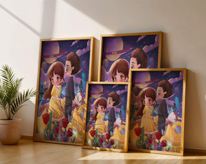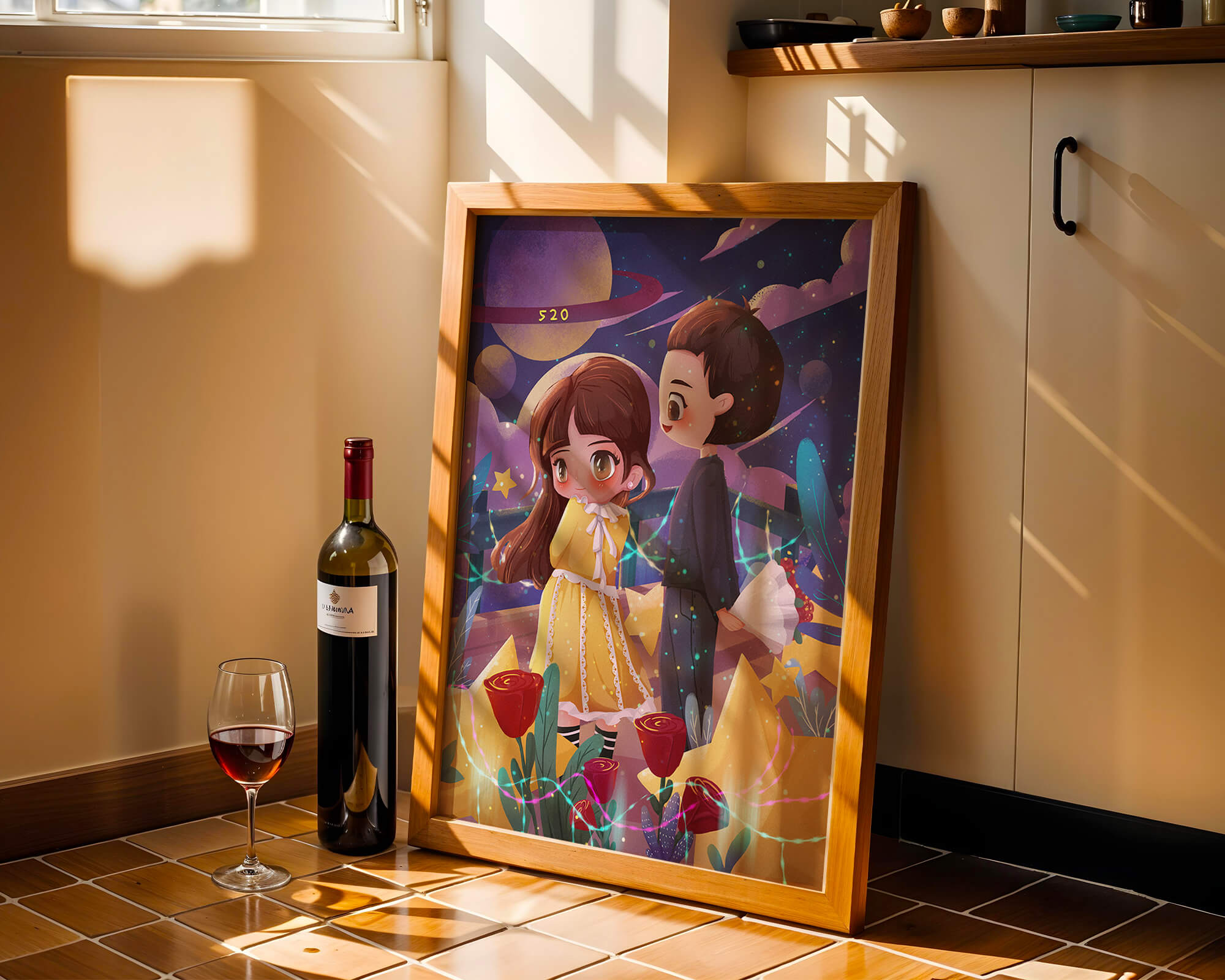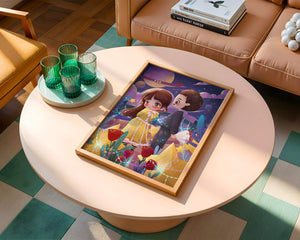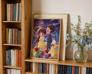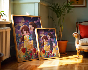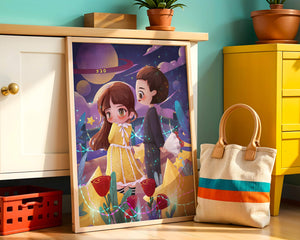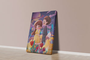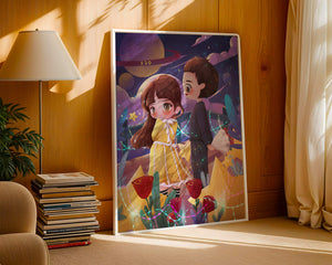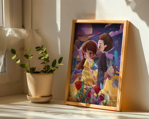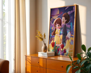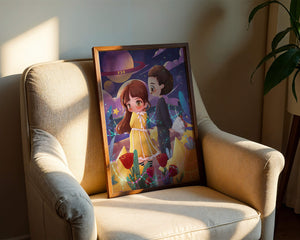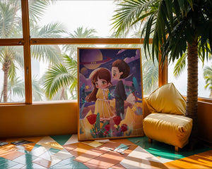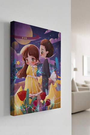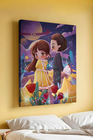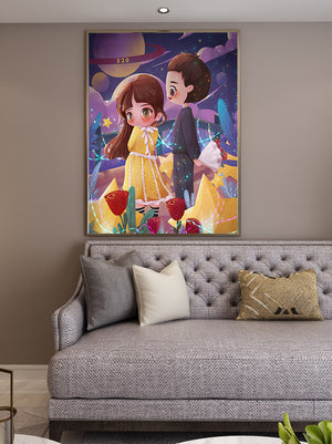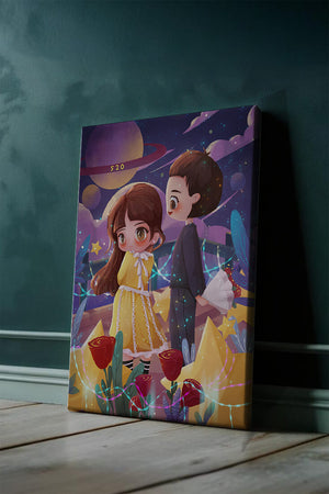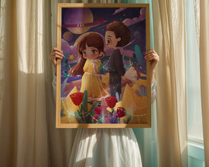 Молодая пара стоит на фоне фантастического небесного чуда. Девушка в очаровательном желтом платье с нежным кружевом излучает сладкую невинность, в то время как юноша дарит букет, добавляя элемент романтики. Сцена украшена яркими красными розами, искрящимися звездами и парящими планетами, создавая магическую ауру их тихого момента. Ночное небо оживает цветом и блеском, а созвездия света окутывают пару, создавая гобелен мечтаний и возможностей. Это произведение искусства запечатлевает суть молодой любви и фантазии, делая его идеальным дополнением к пространствам, которые празднуют тепло и причудливость.| Тип |