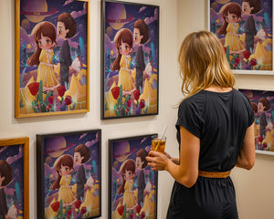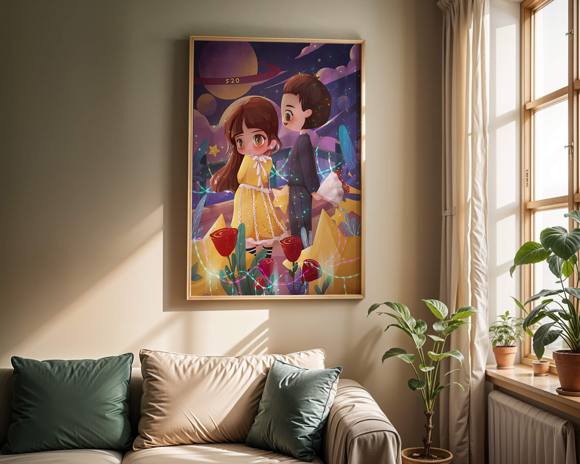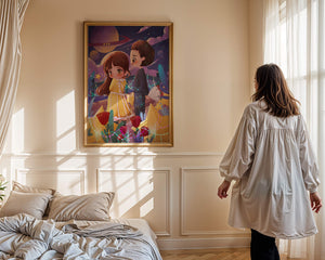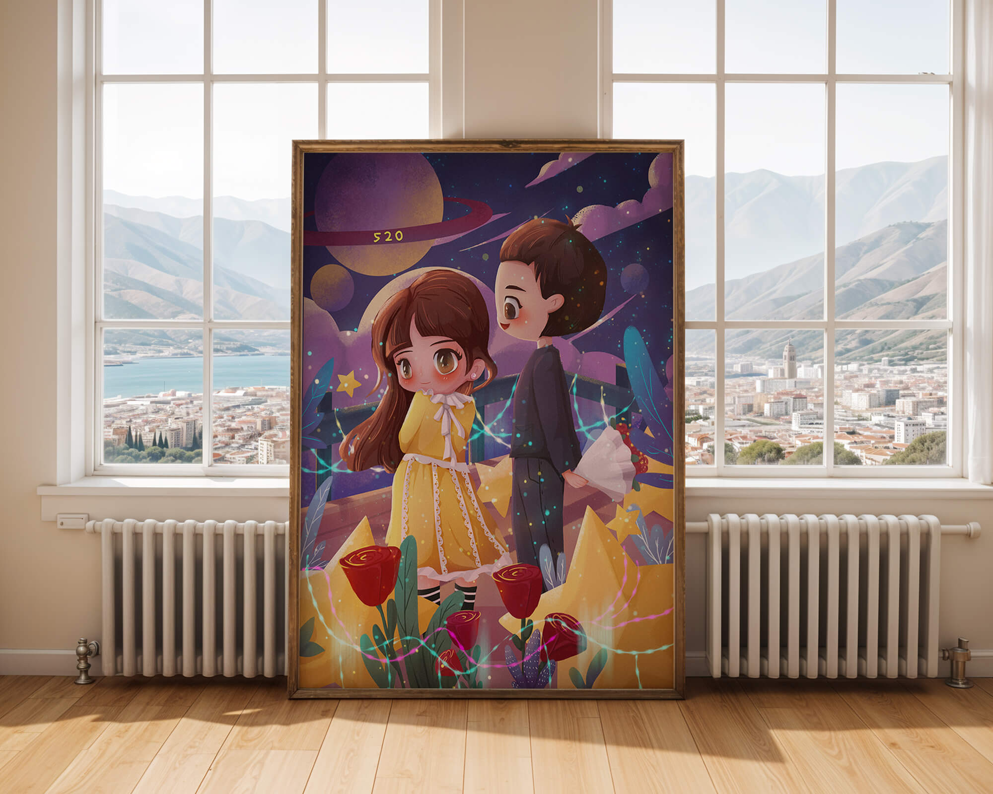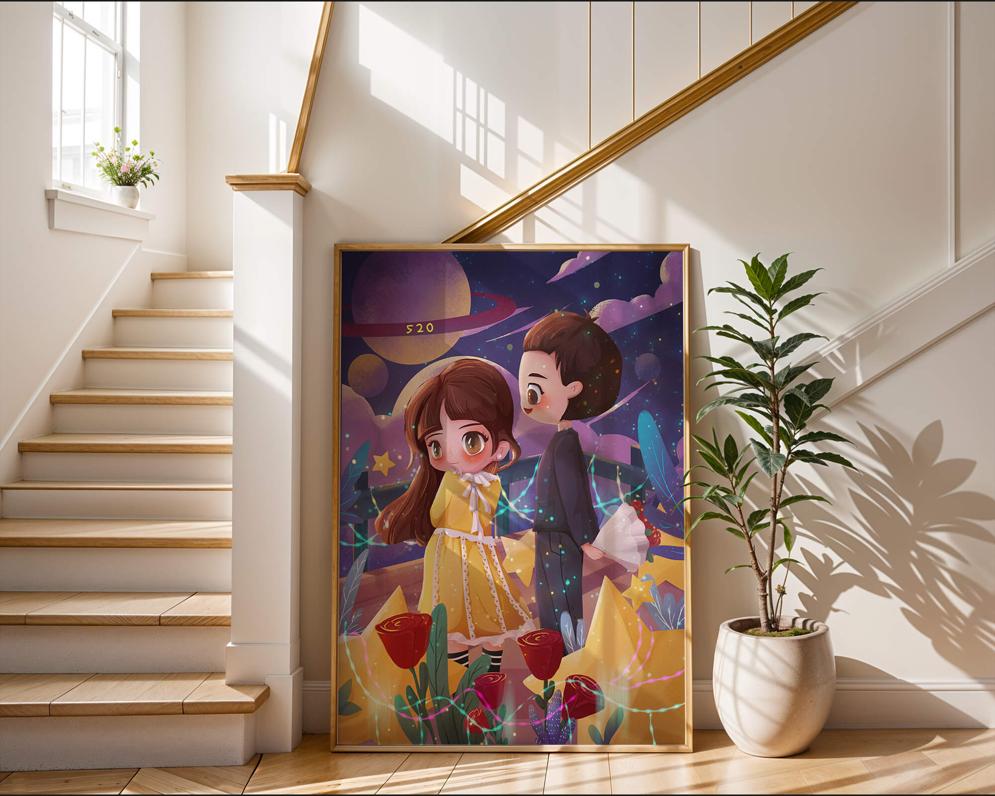Молодая пара стоит на фоне фантастического небесного чуда. Девушка в очаровательном желтом платье с нежным кружевом излучает сладкую невинность, в то время как юноша дарит букет, добавляя элемент романтики. Сцена украшена яркими красными розами, искрящимися звездами и парящими планетами, создавая магическую ауру их тихого момента. Ночное небо оживает цветом и блеском, а созвездия света окутывают пару, создавая гобелен мечтаний и возможностей. Это произведение искусства запечатлевает суть молодой любви и фантазии, делая его идеальным дополнением к пространствам, которые празднуют тепло и причудливость.| Тип |