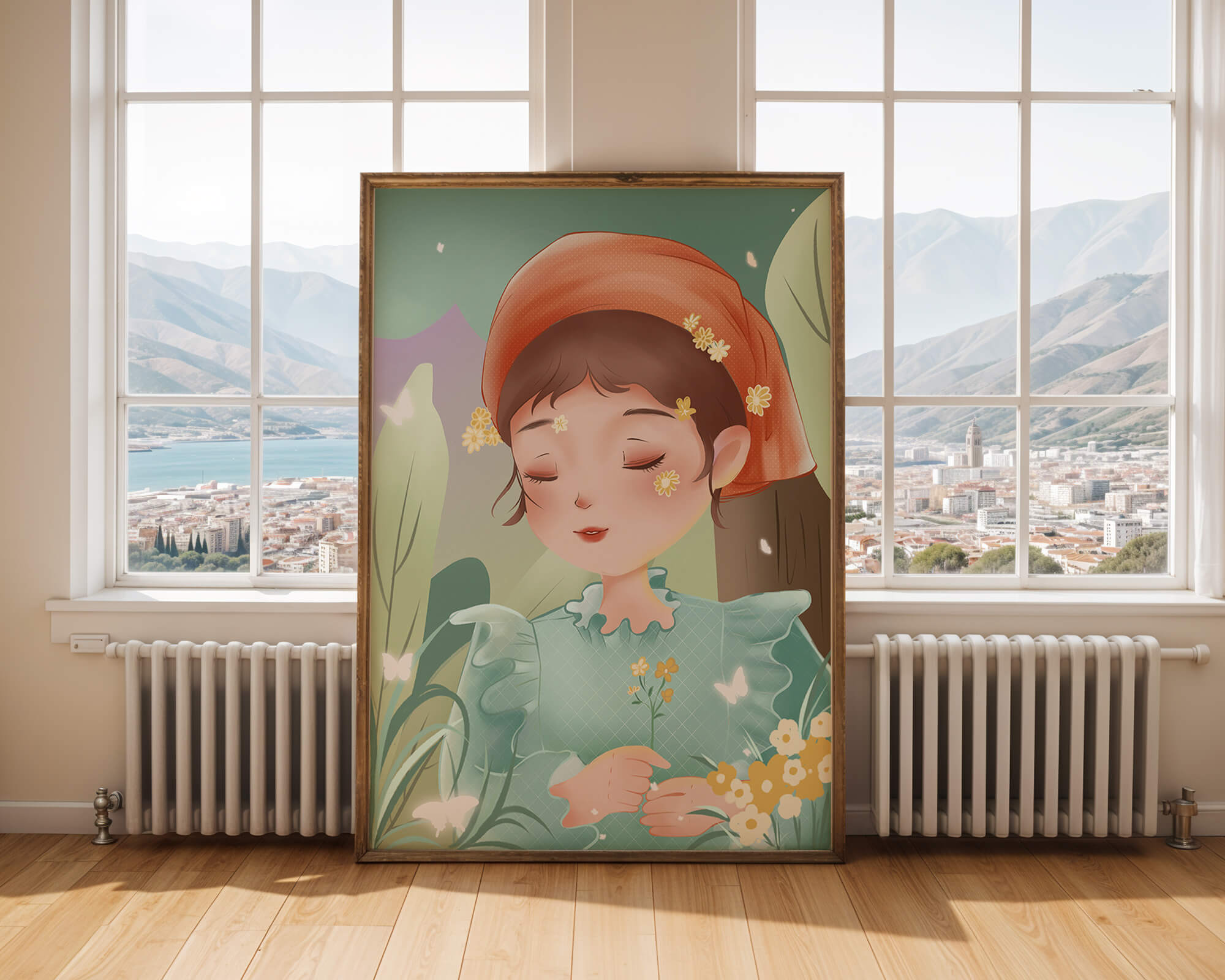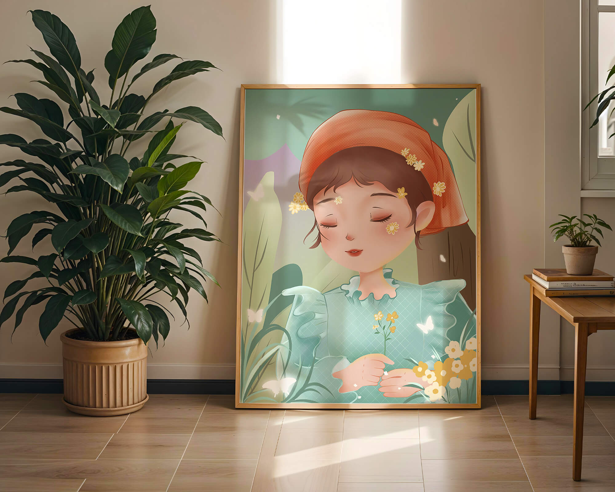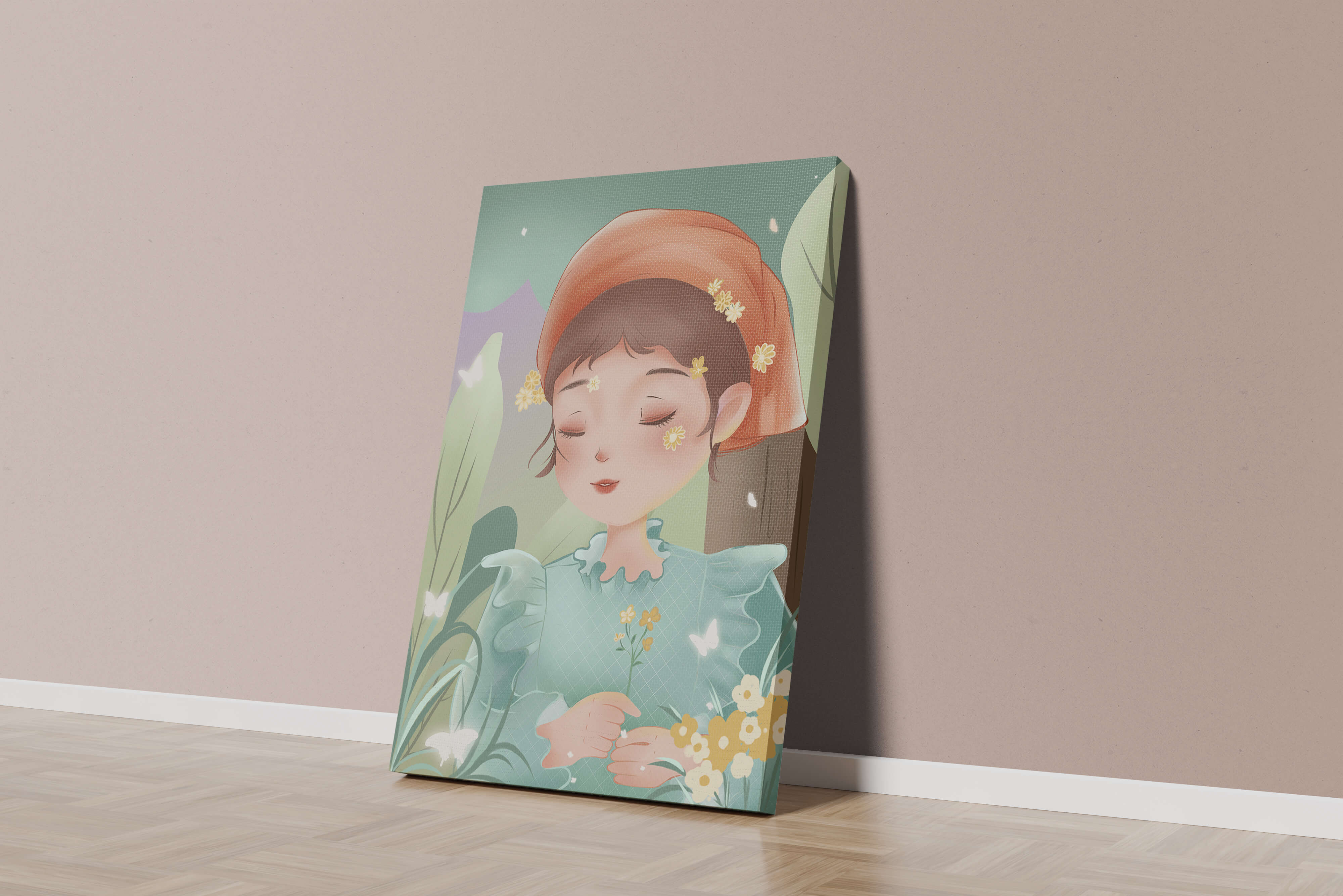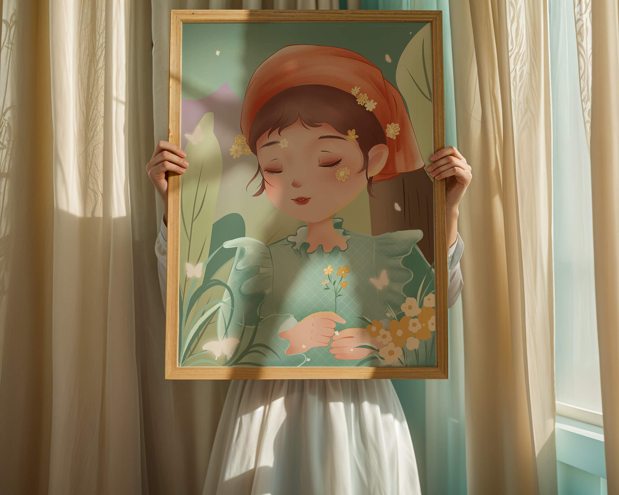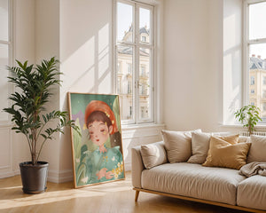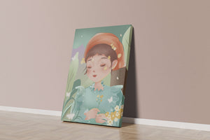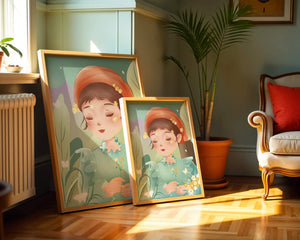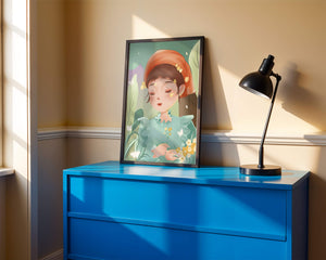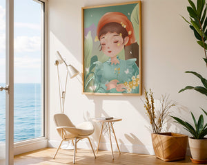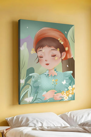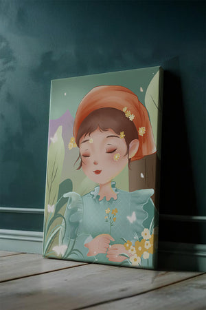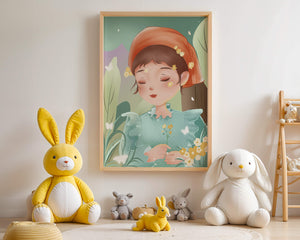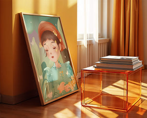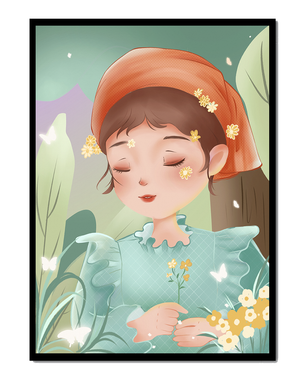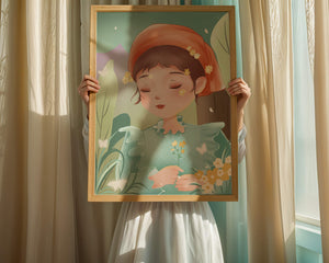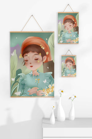 Наряд девочки — мягкое голубое платье с оборками — добавляет сцене нотку причудливости, идеально сочетаясь с её красным шарфом, украшенным маленькими жёлтыми цветочками. Порхание бабочек усиливает мечтательное ощущение изображения, создавая чувство спокойствия и удовлетворения. Пастельная палитра, использованная в иллюстрации, передаёт нежную и успокаивающую атмосферу, делая её идеальной для помещений, которые стремятся привнести нотку умиротворённости и покоя. Это произведение искусства без труда сможет украсить спальню или детскую комнату, предоставляя визуальный побег в мир тихой красоты.| Тип |