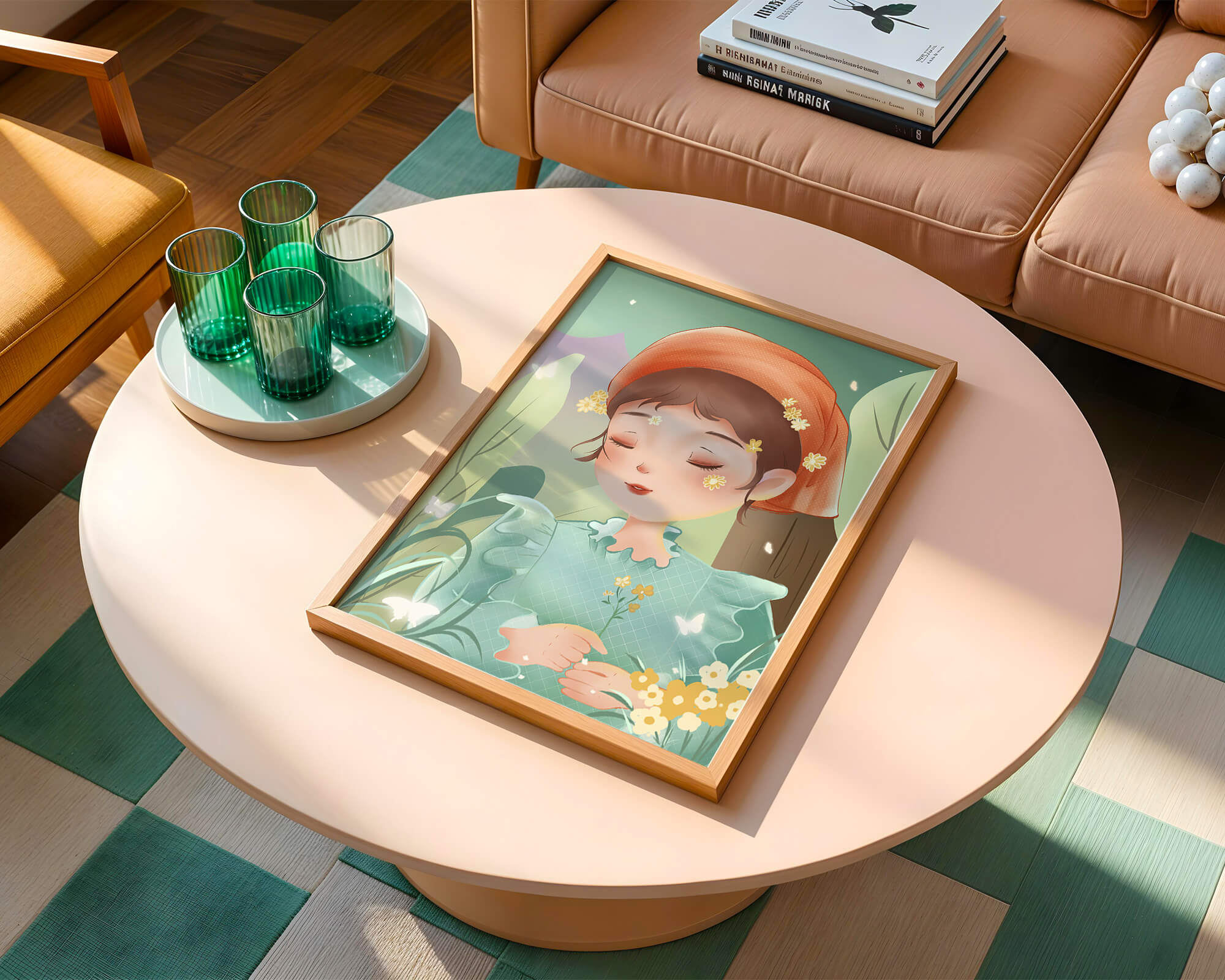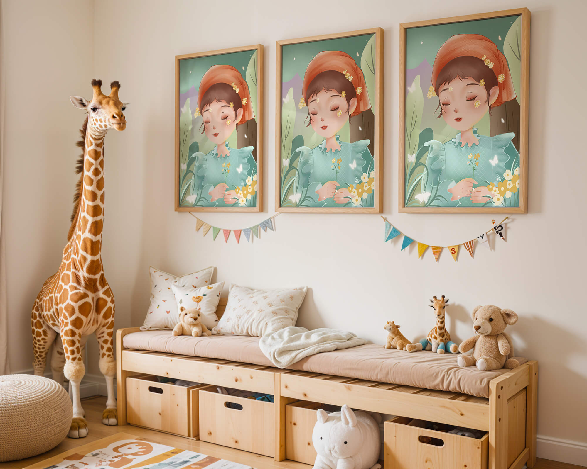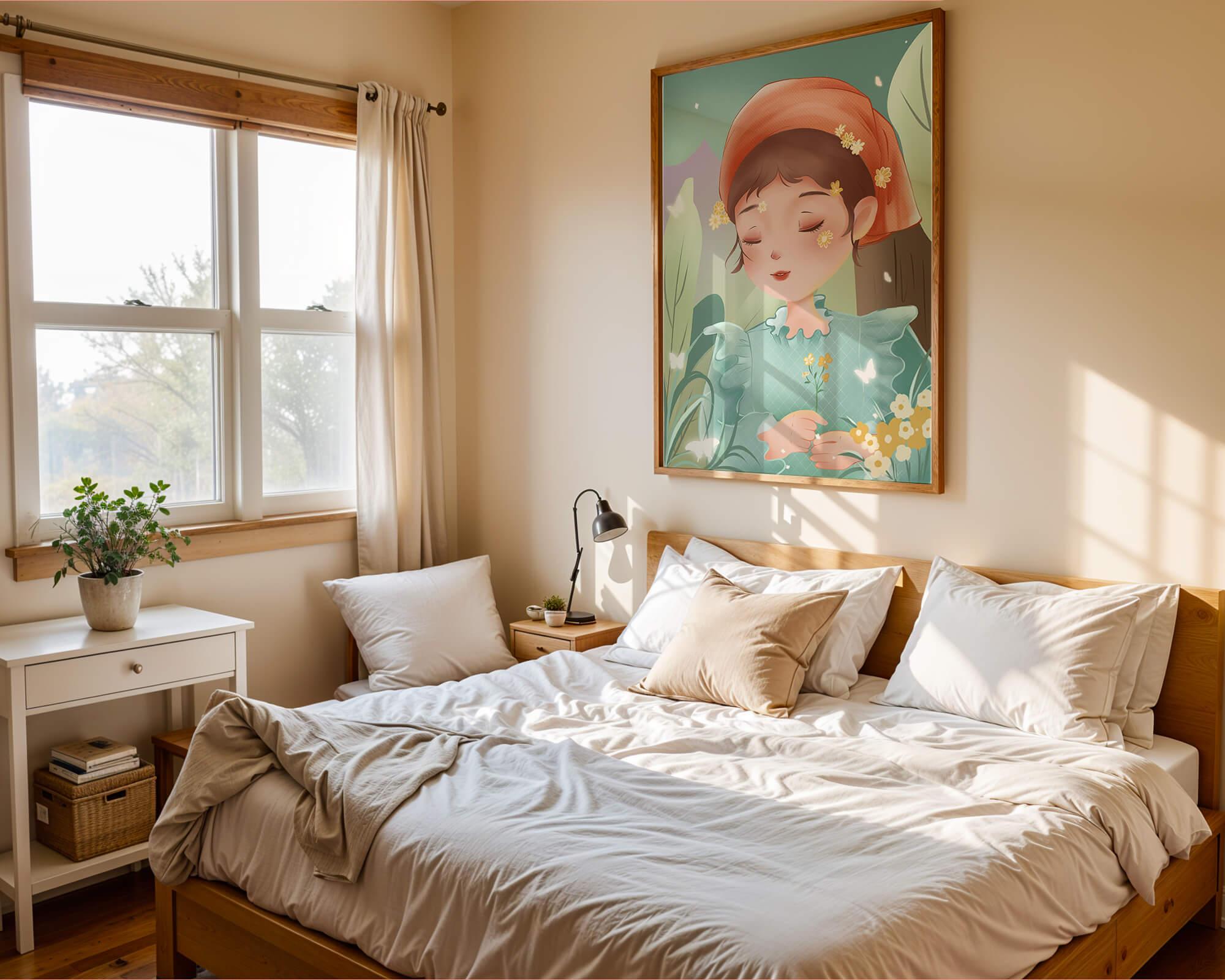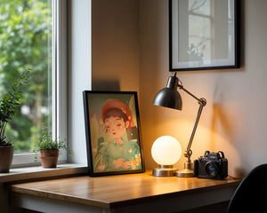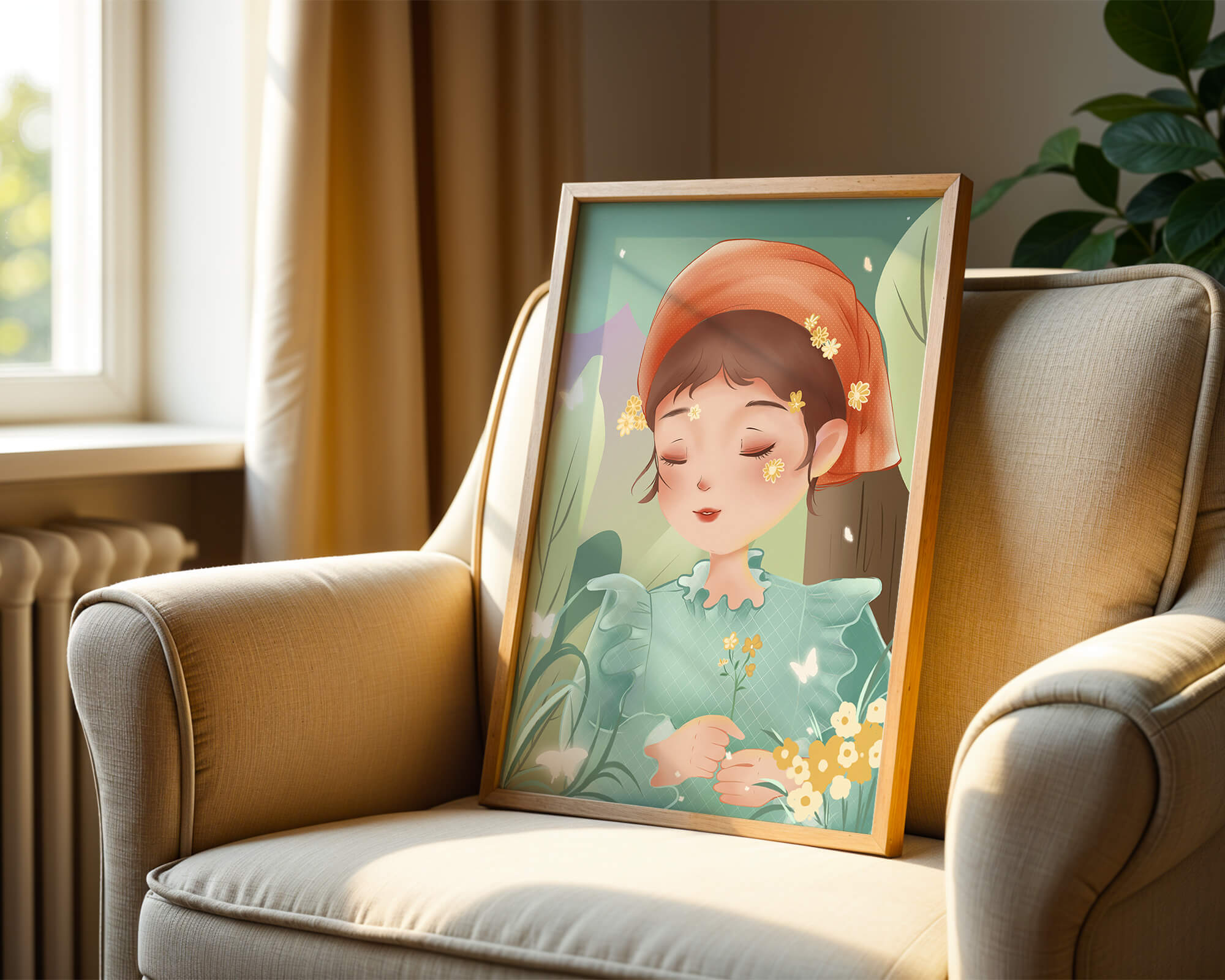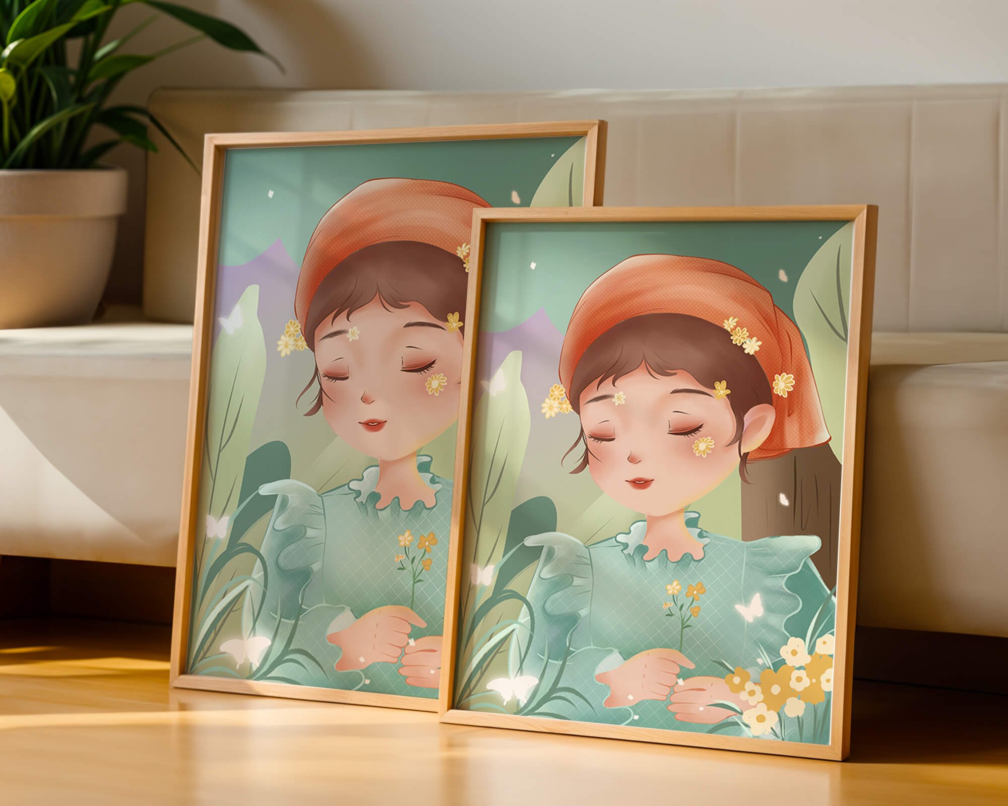 Наряд девочки — мягкое голубое платье с оборками — добавляет сцене нотку причудливости, идеально сочетаясь с её красным шарфом, украшенным маленькими жёлтыми цветочками. Порхание бабочек усиливает мечтательное ощущение изображения, создавая чувство спокойствия и удовлетворения. Пастельная палитра, использованная в иллюстрации, передаёт нежную и успокаивающую атмосферу, делая её идеальной для помещений, которые стремятся привнести нотку умиротворённости и покоя. Это произведение искусства без труда сможет украсить спальню или детскую комнату, предоставляя визуальный побег в мир тихой красоты.| Тип |
