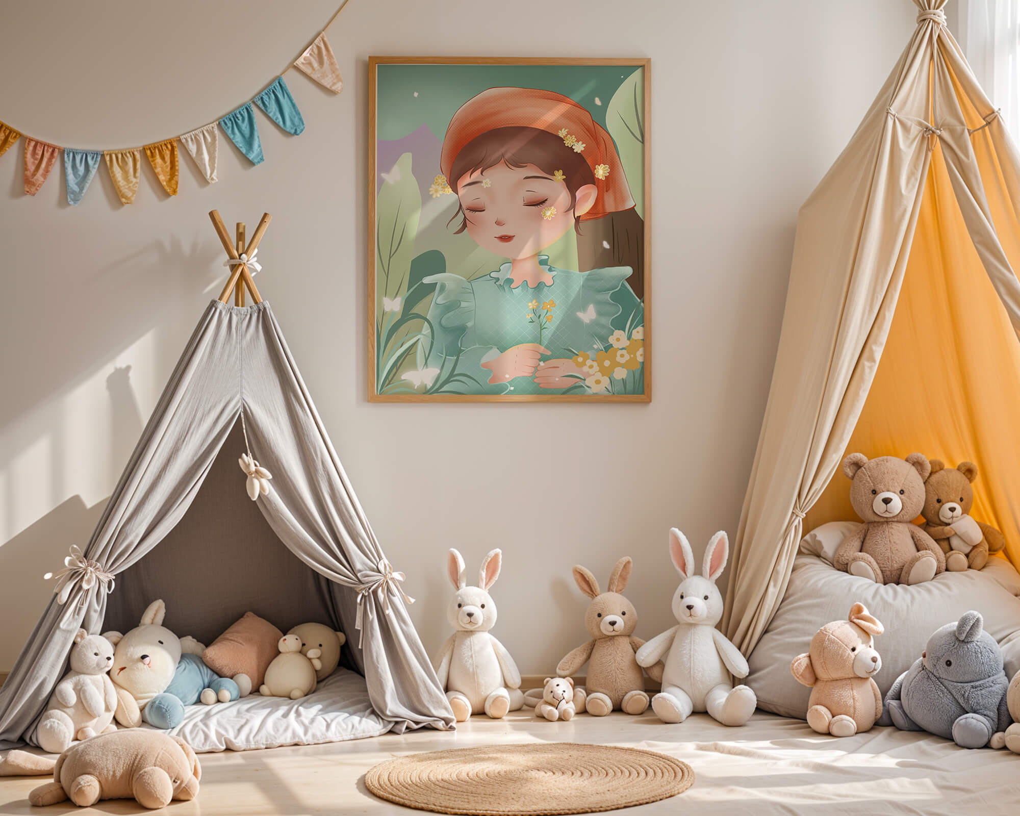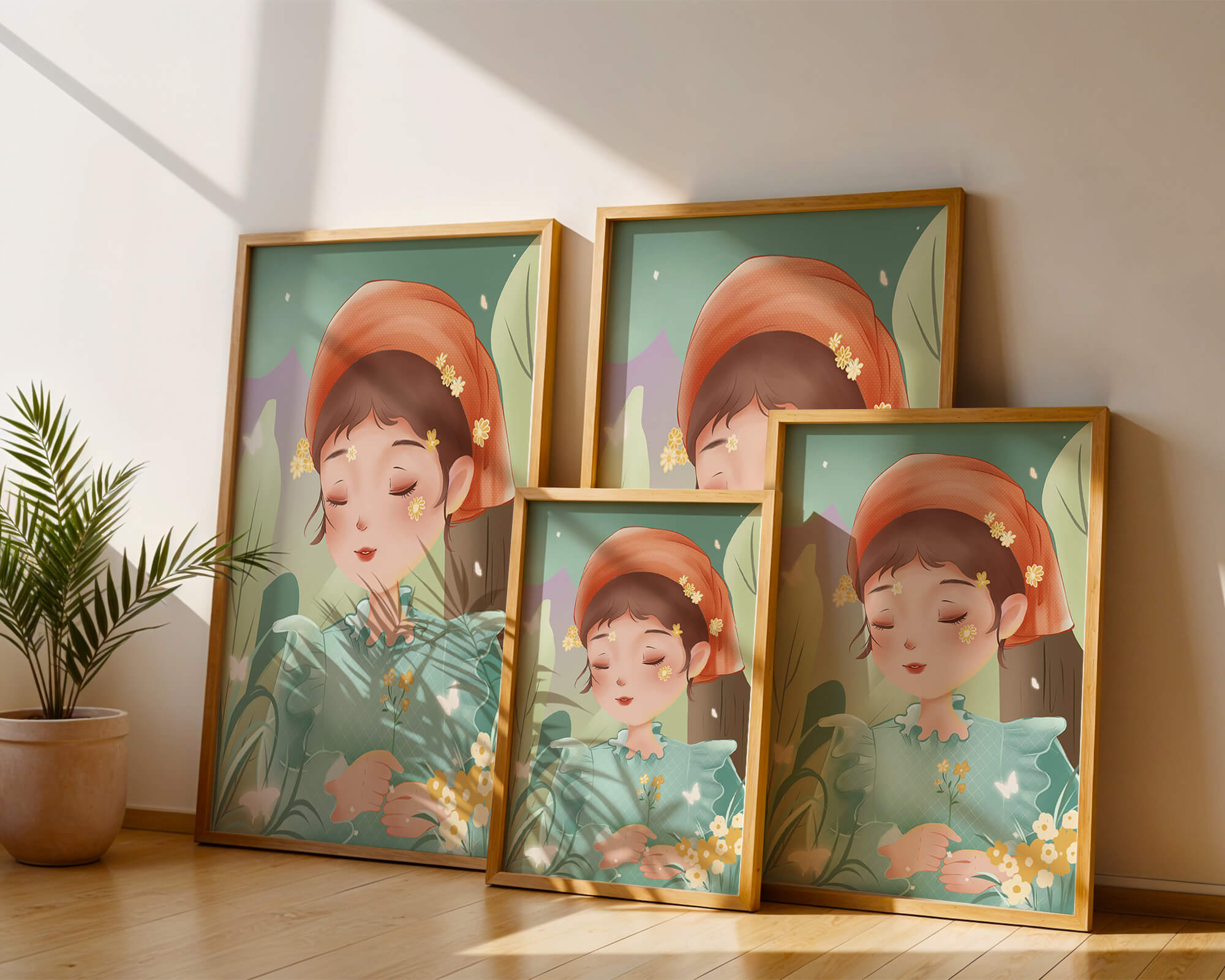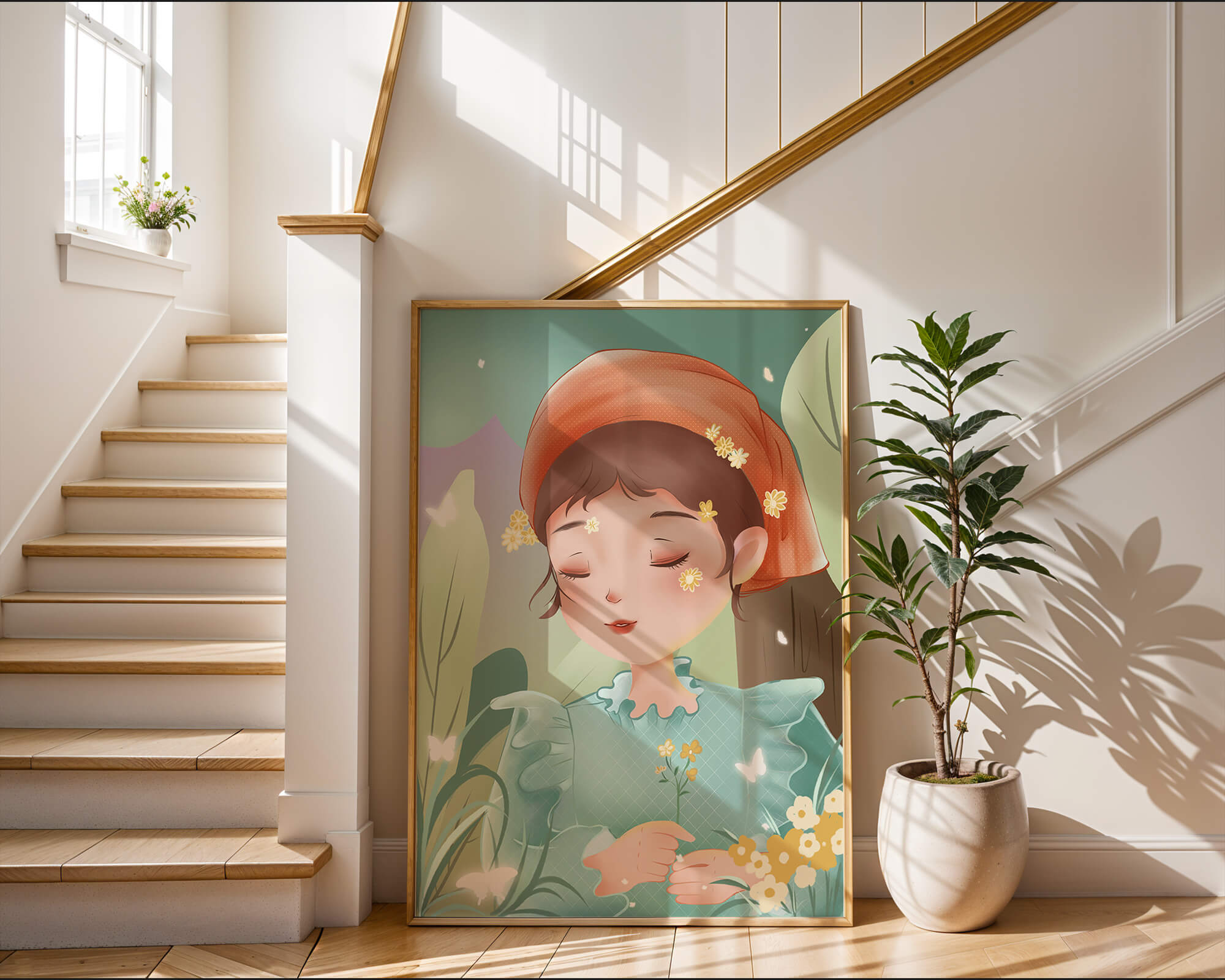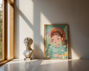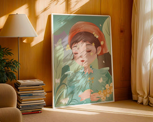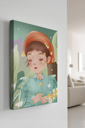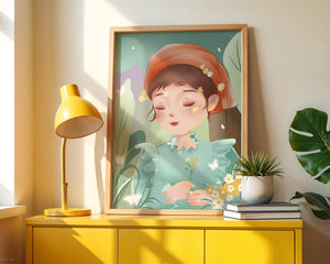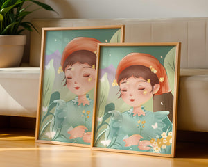 Эта очаровательная иллюстрация запечатлевает спокойный момент молодой девочки, погружённой в природу. Слегка закрытыми глазами и лёгкой улыбкой на губах она излучает умиротворение, окружённая пышной зеленью и нежными цветами.