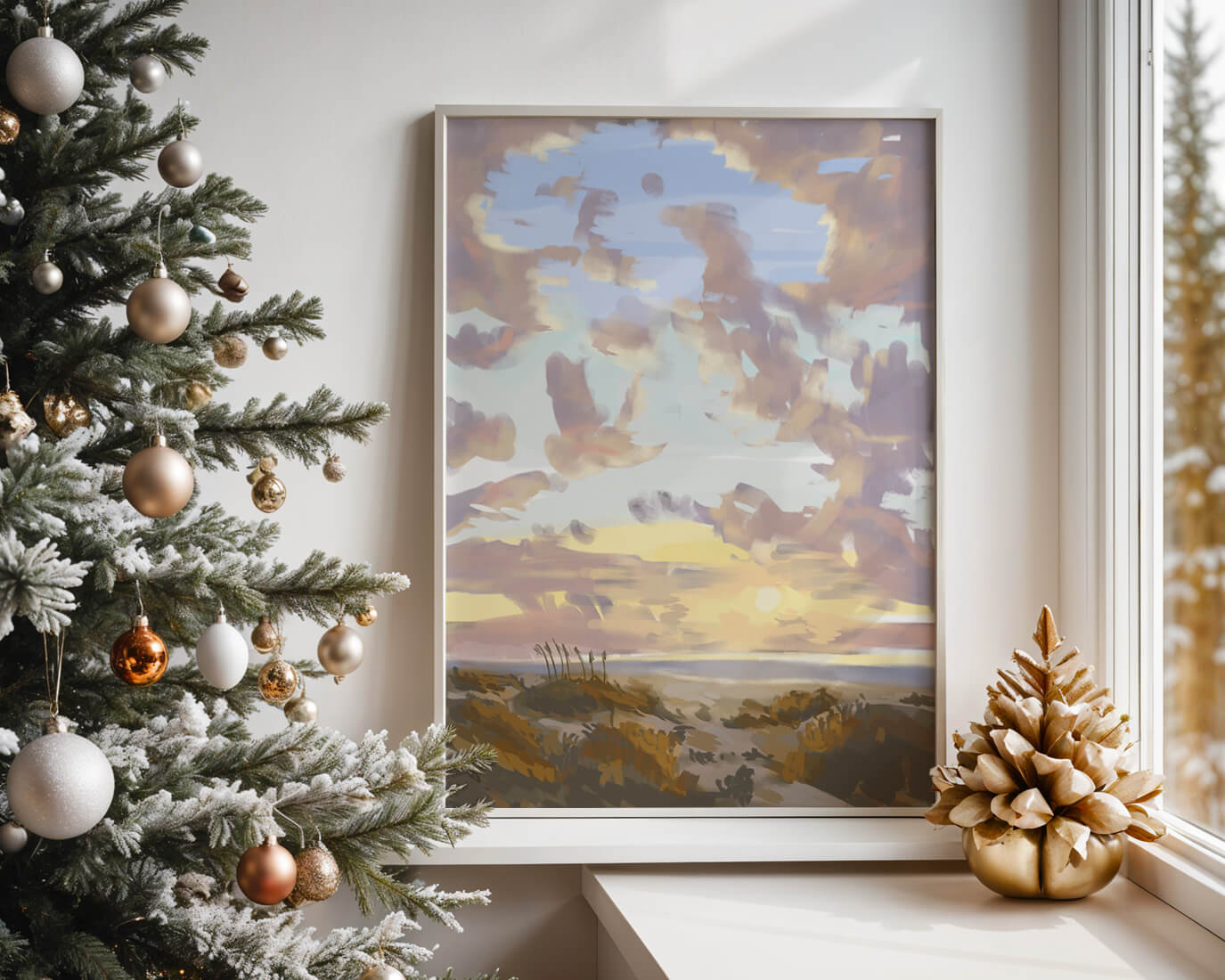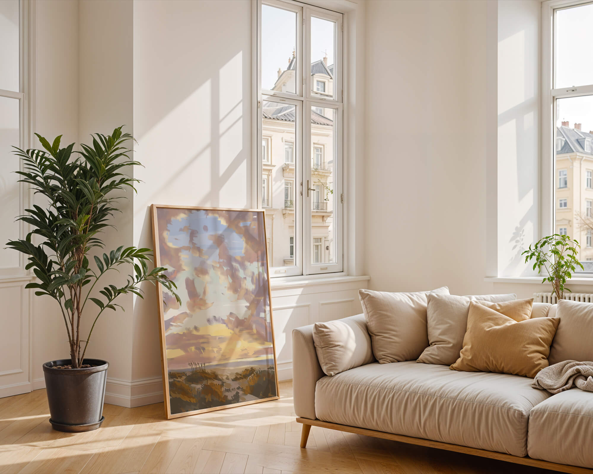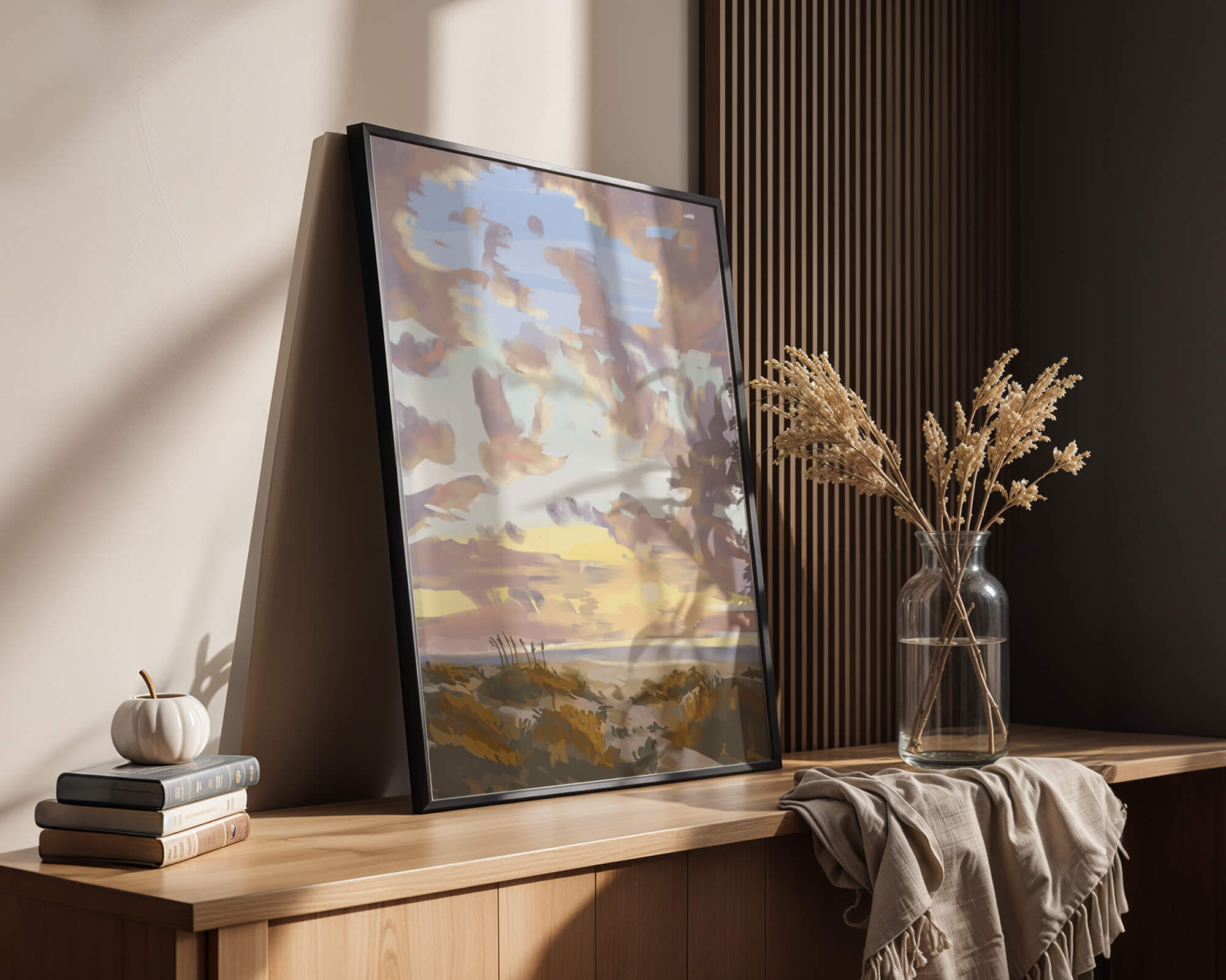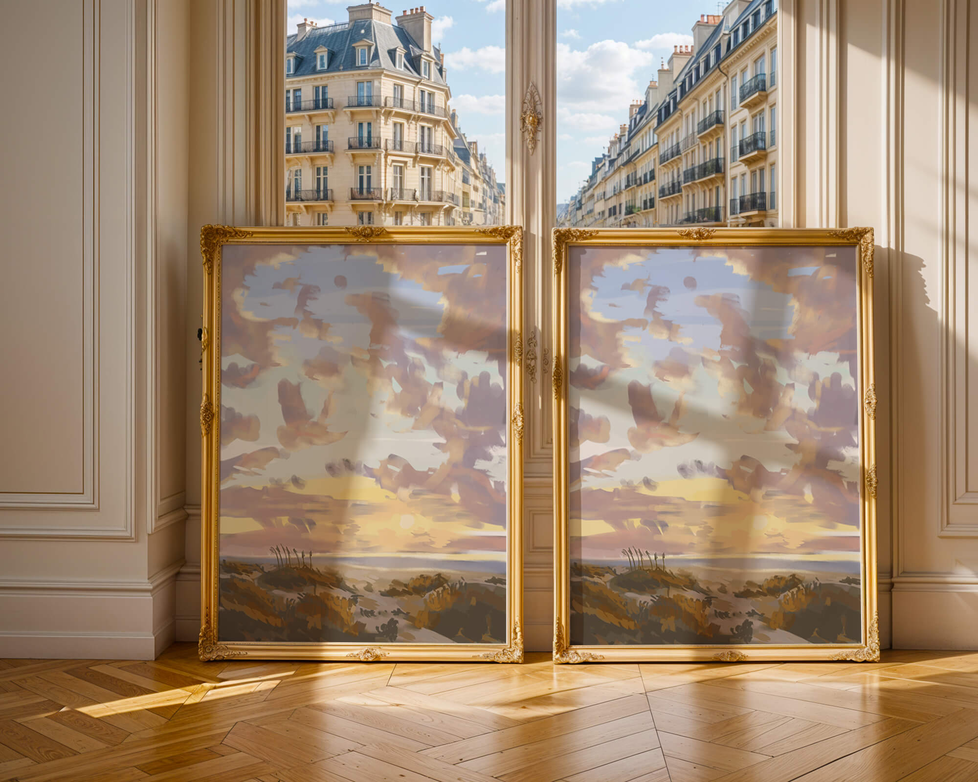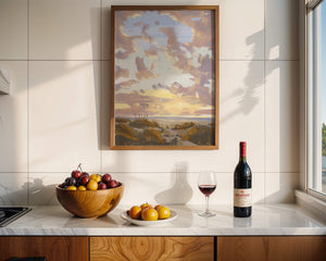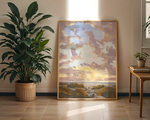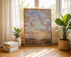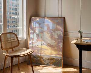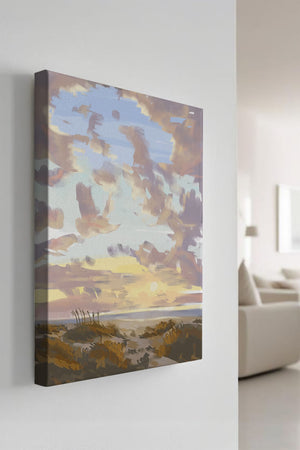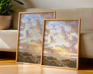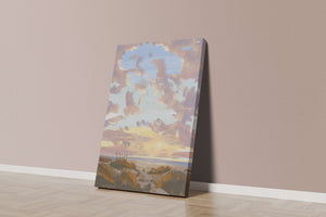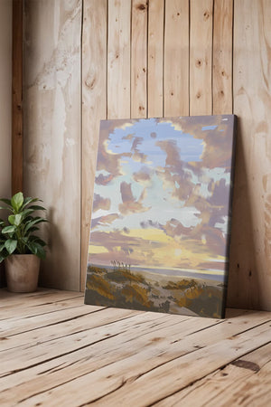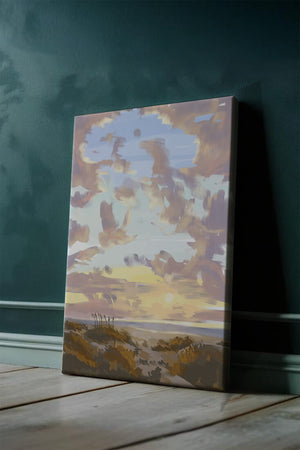 Этот живописный произведение искусства демонстрирует безмятежный пейзаж с утренним небом, заполненным мягкими облаками, и открытым полем, простирающимся к горизонту. Нежные мазки кисти создают атмосферу спокойствия и мира, делая его идеальным для создания умиротворяющей обстановки.