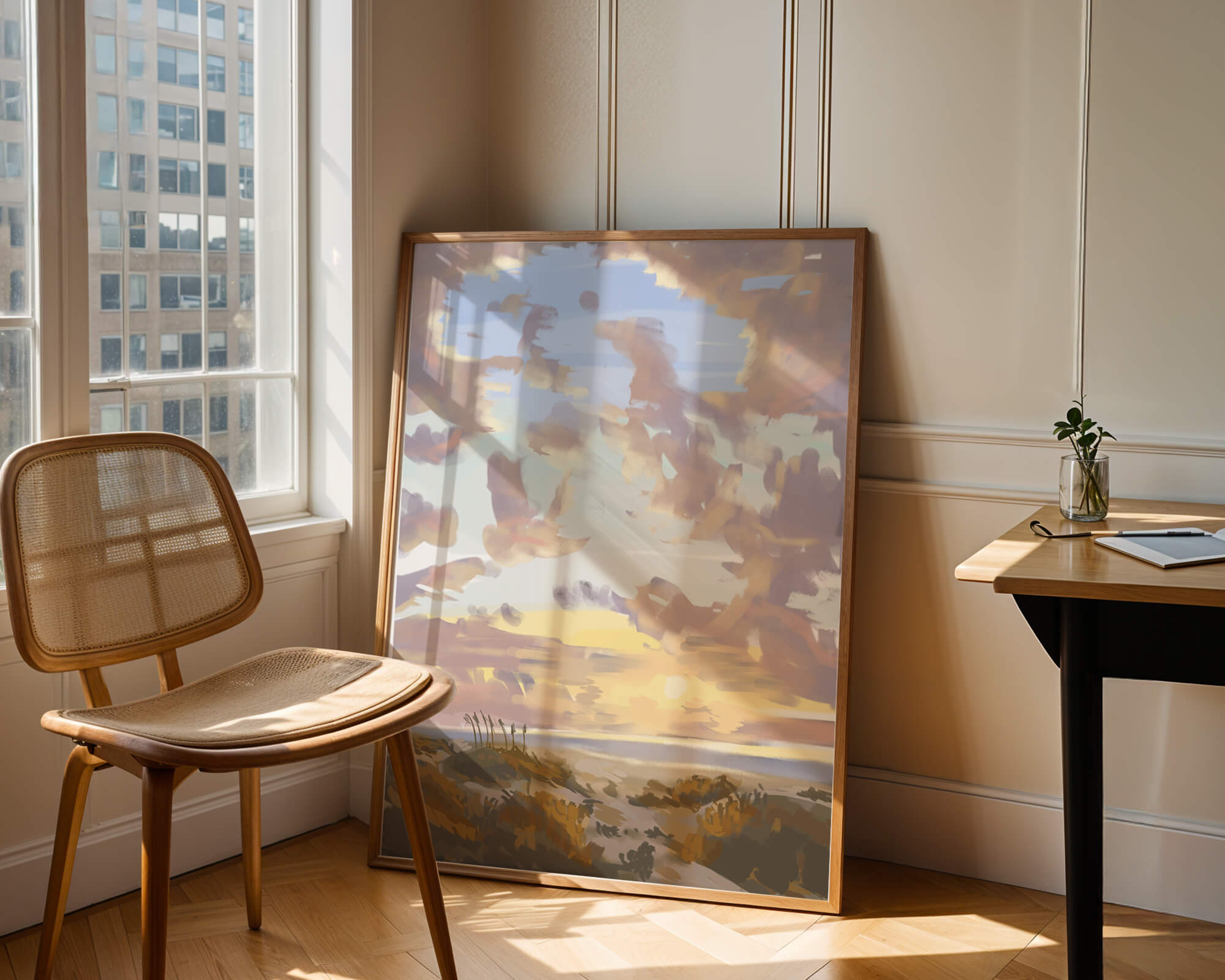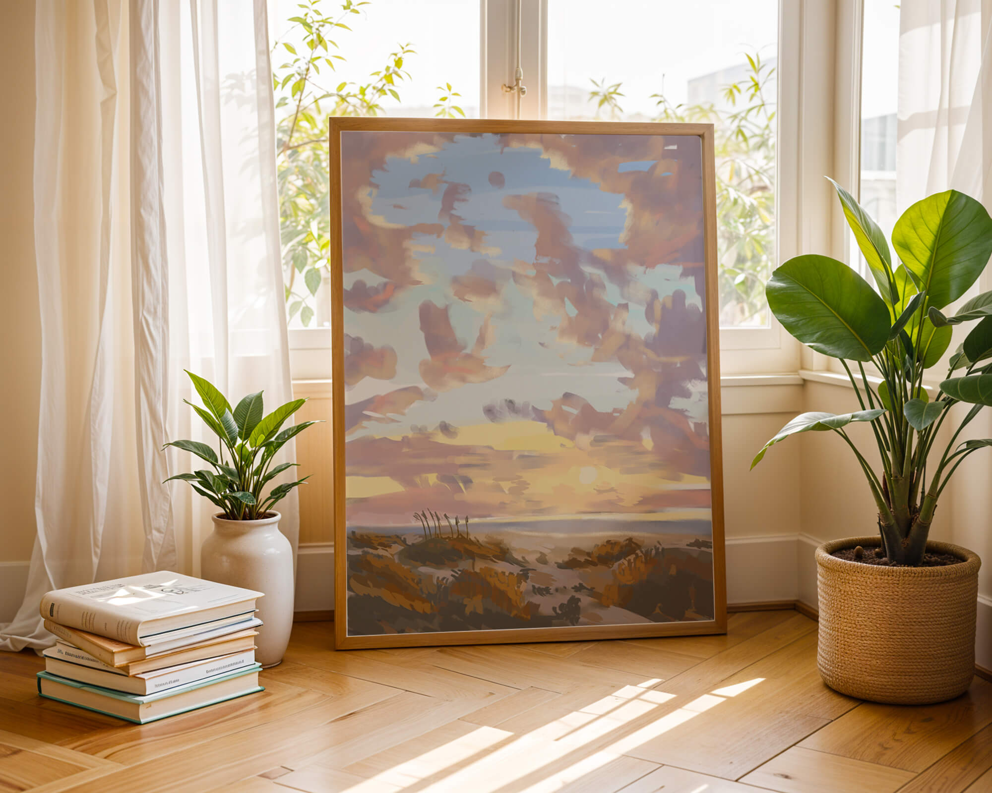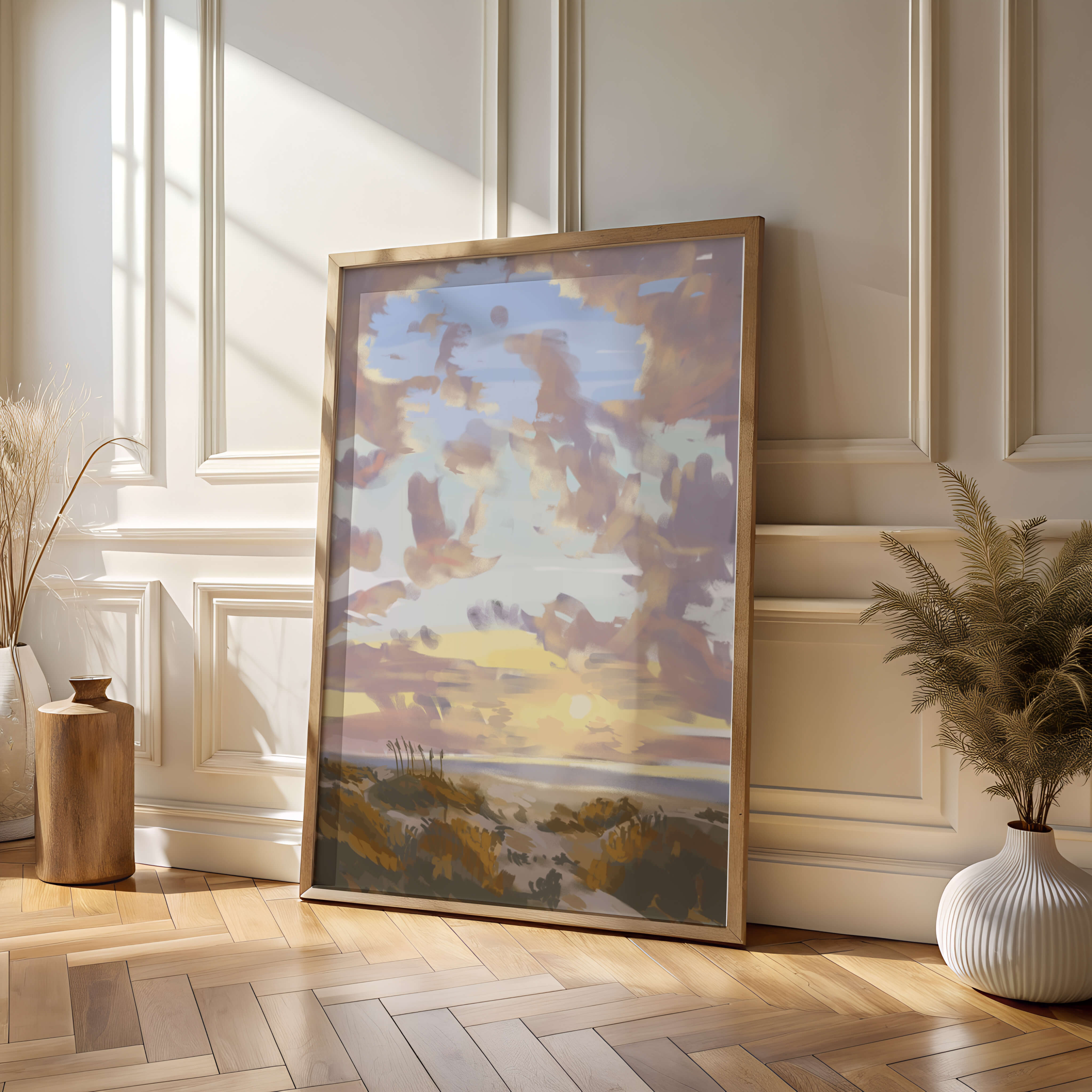 Изображение содержит прекрасно расписанное небо с пастельными цветами, плавно смешивающимися и подчеркивающими раннее утреннее солнце, выглядывающее через облака. Игра света и тени создает завораживающий вид природы, просыпающейся к новому дню. На переднем плане открытые поля изображены артистично, с тонкими деталями, передающими сущность природной красоты. Этот сюжет добавляет гармонии в любое пространство, предлагая момент отдыха и напоминание о безмятежной красоте природного мира.| Тип |
