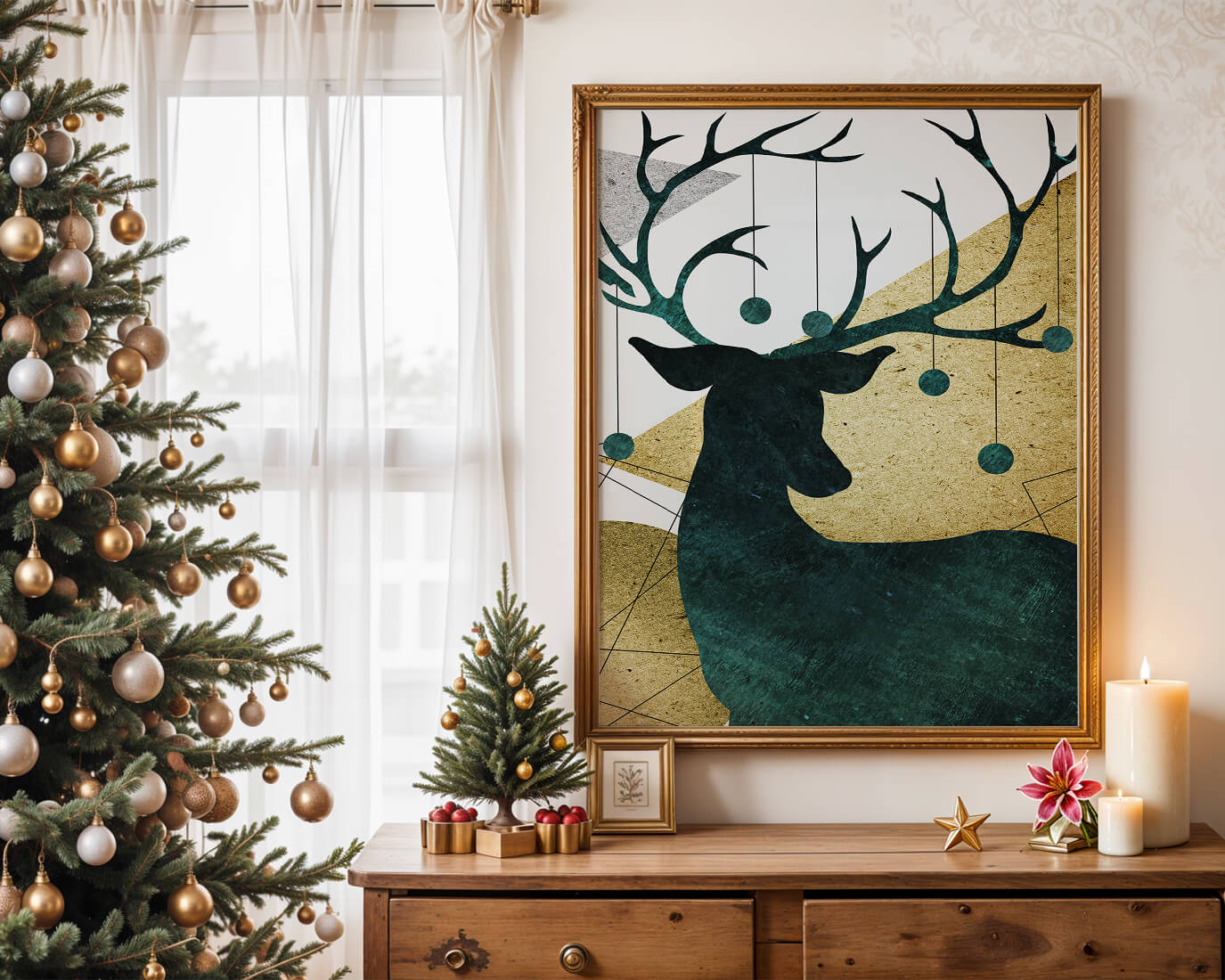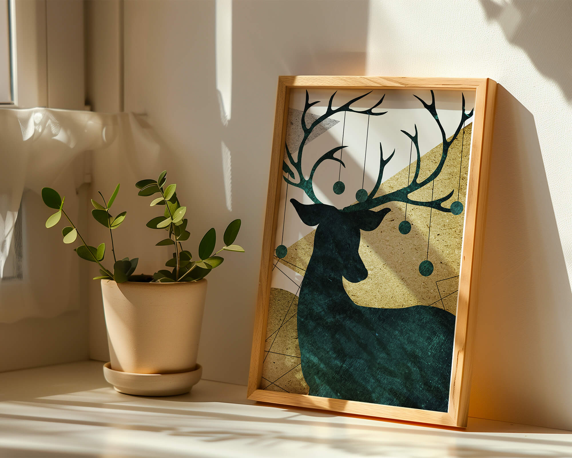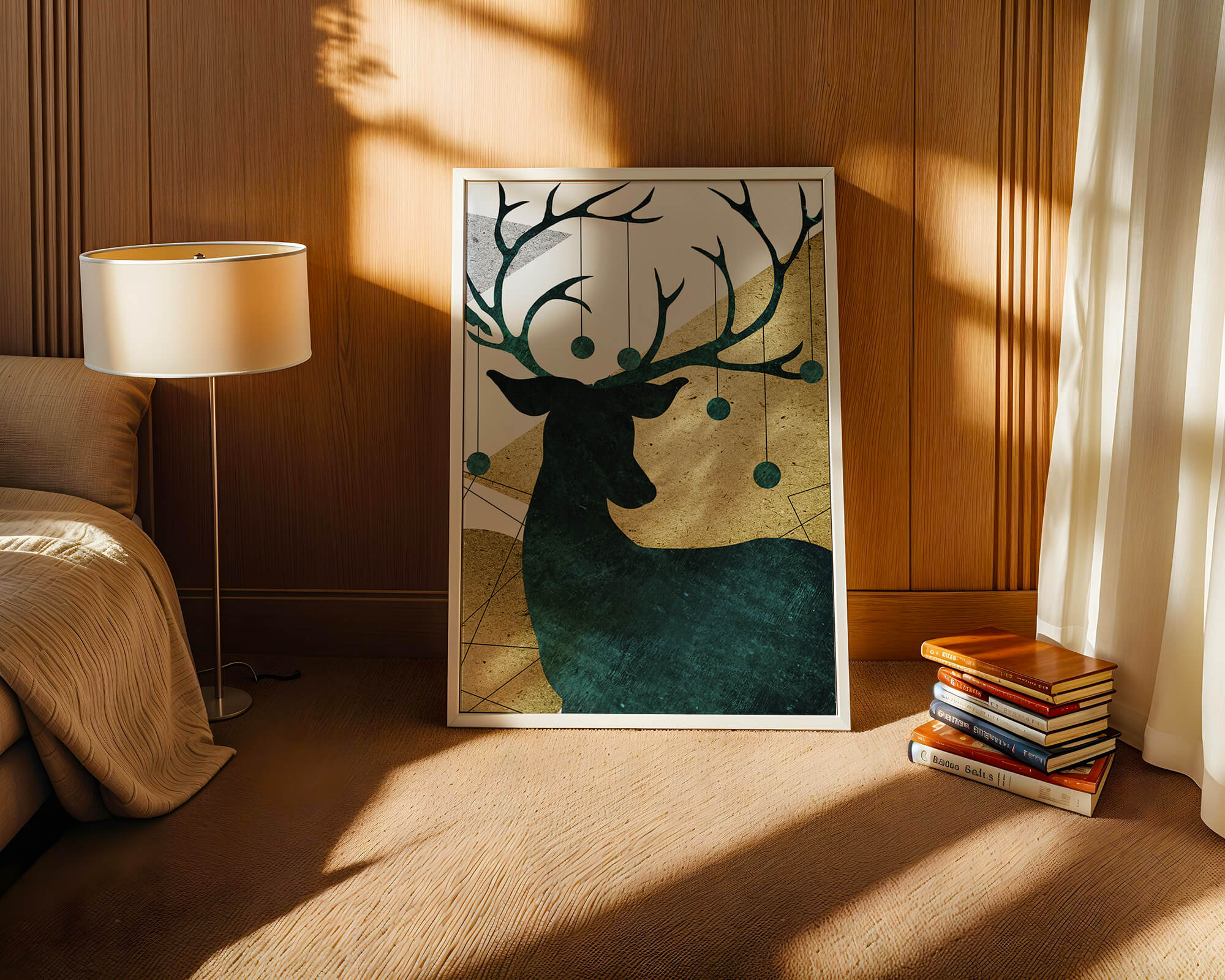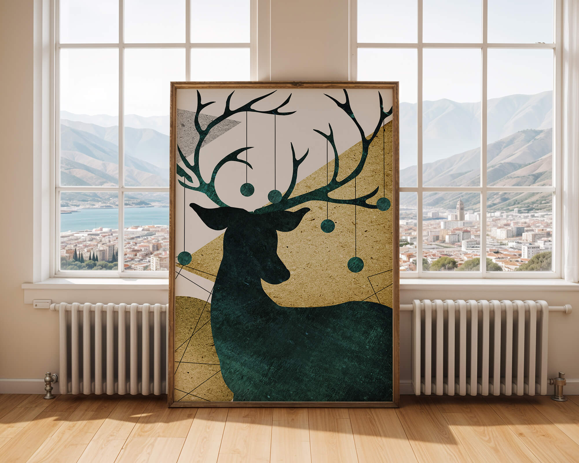 Это изображение представляет собой увлекательное сочетание природы и современного искусства. Силуэт оленя с элегантно разветвленными рогами выделяется на фоне текстурированного золотого фона. Висящие сферы с рогов добавляют в композицию игривый, но структурированный элемент, усиливая общий абстрактный характер. Геометрические линии и формы пересекают фон, добавляя глубину и интерес к дизайну. Сочетание зеленого и золота создает роскошную и утонченную эстетику, делая эту работу идеальным декоративным элементом для современных интерьеров.| Тип |