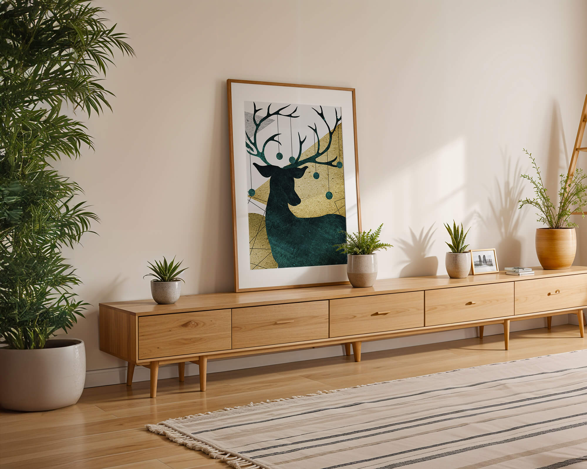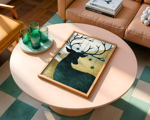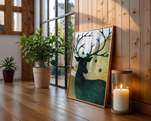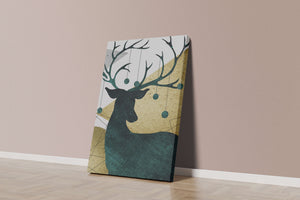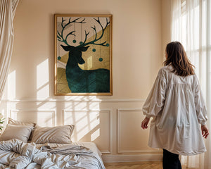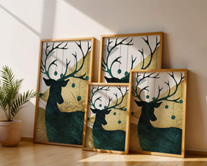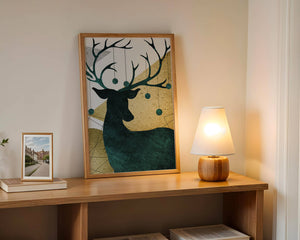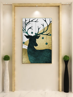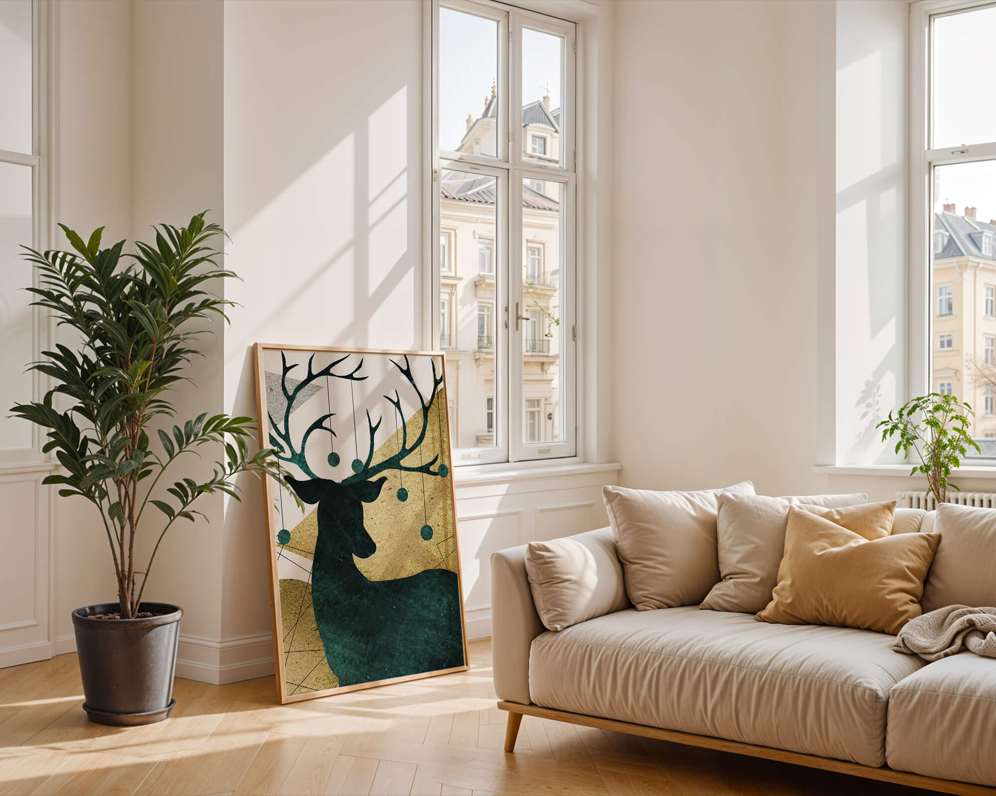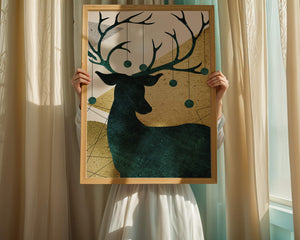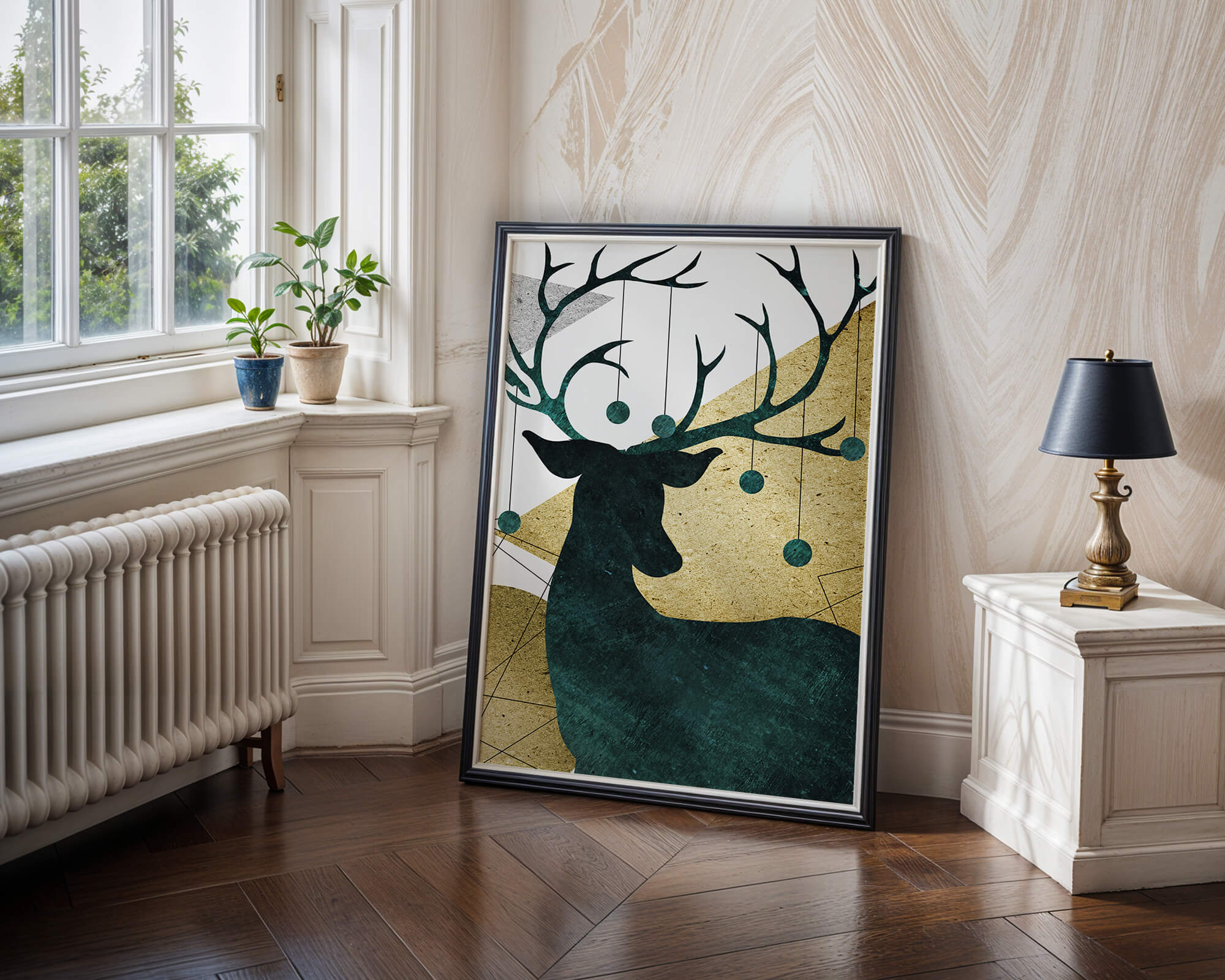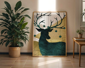Это изображение представляет собой увлекательное сочетание природы и современного искусства. Силуэт оленя с элегантно разветвленными рогами выделяется на фоне текстурированного золотого фона. Висящие сферы с рогов добавляют в композицию игривый, но структурированный элемент, усиливая общий абстрактный характер. Геометрические линии и формы пересекают фон, добавляя глубину и интерес к дизайну. Сочетание зеленого и золота создает роскошную и утонченную эстетику, делая эту работу идеальным декоративным элементом для современных интерьеров.| Тип |