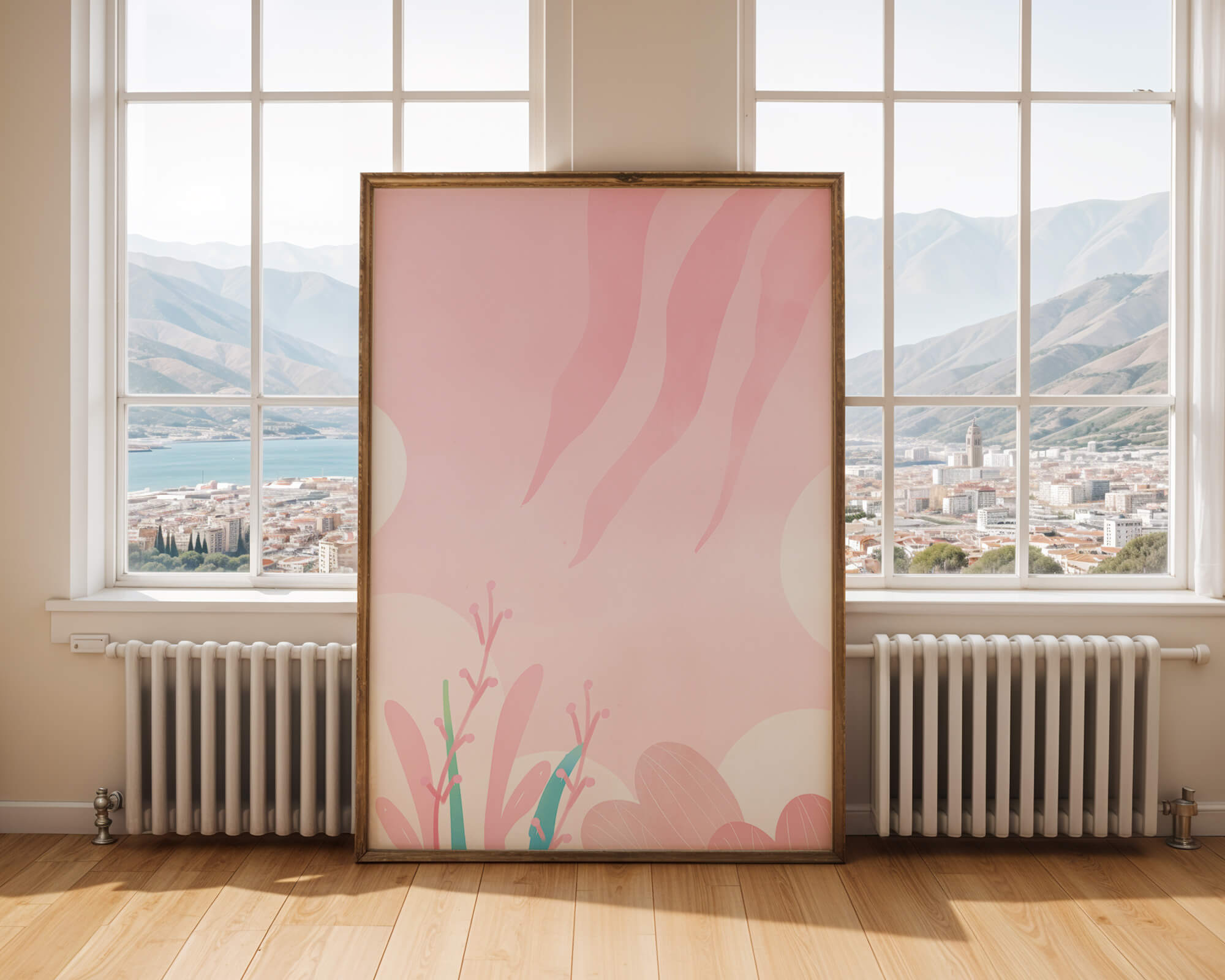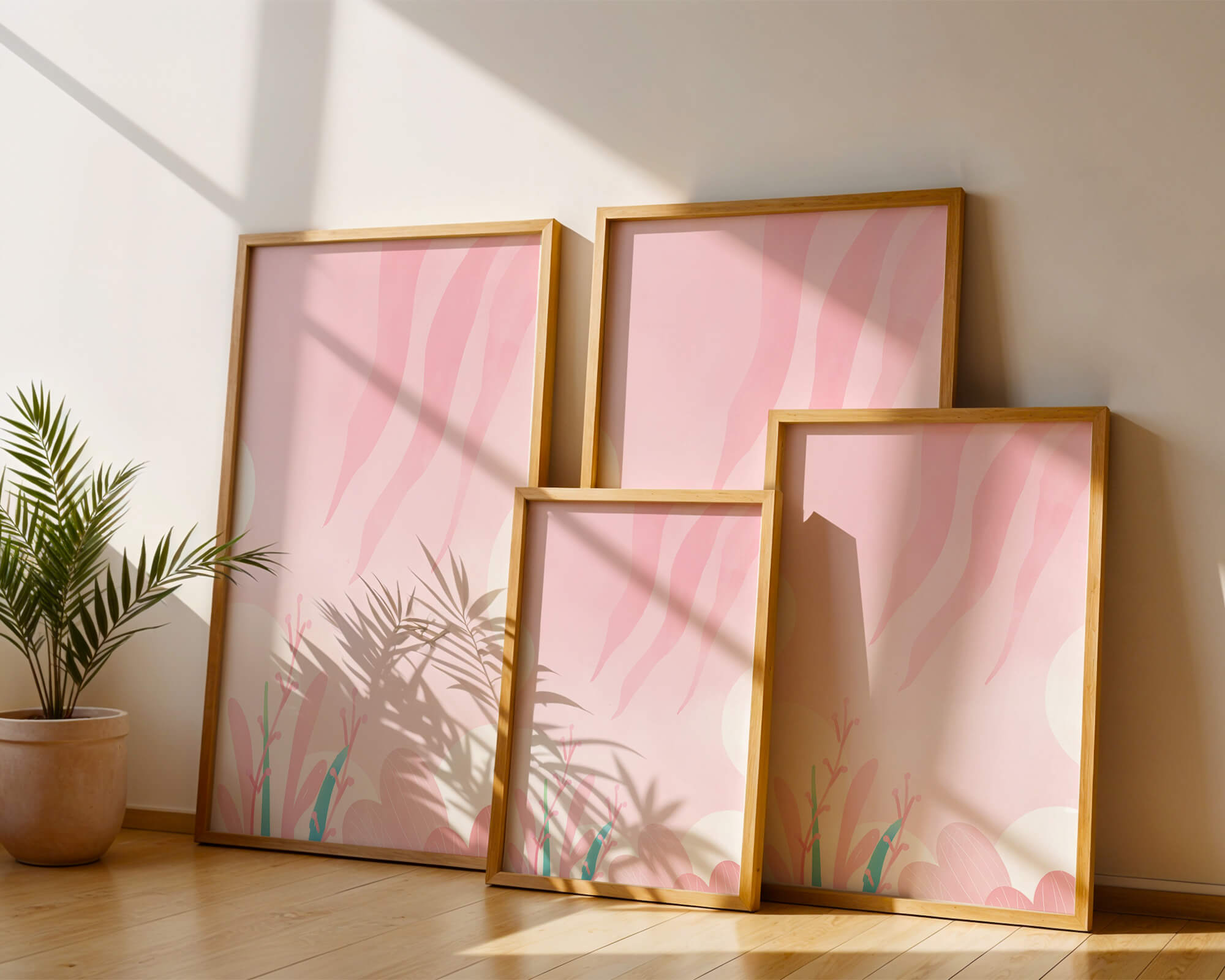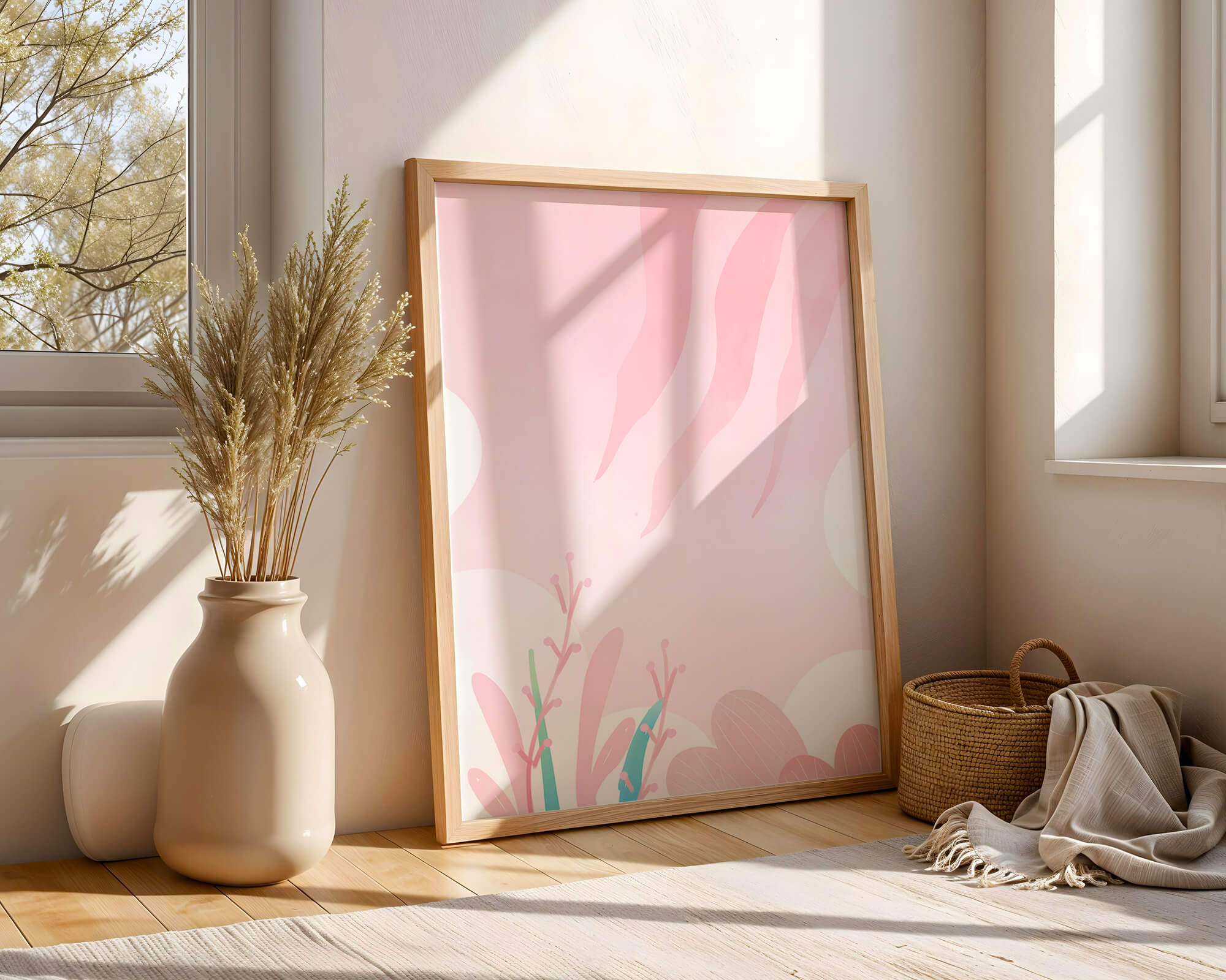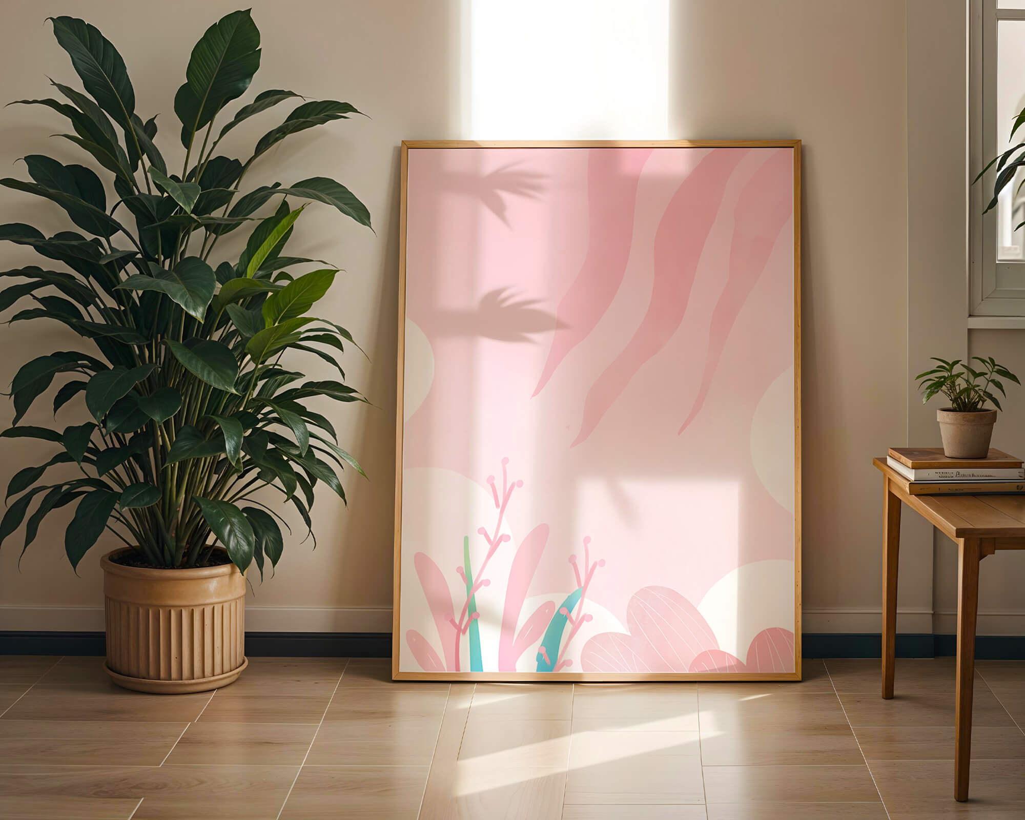 Палитра этой иллюстрации сочетает различные оттенки розового, придавая ей пастельное и воздушное ощущение. Листья и цветочные мотивы как бы парят в рамках, выглядя живыми и динамичными. Минималистичный дизайн позволяет воображению зрителя блуждать, вызывая мысли о природе и спокойствии. Это произведение идеально для тех, кто ищет декоративное искусство, которое сочетает природную красоту с современным дизайном. Его мягкие, плавные линии и гармоничная цветовая гамма делают его идеальным выбором для улучшения любого пространства с ноткой изящества и прихоти.| Тип |