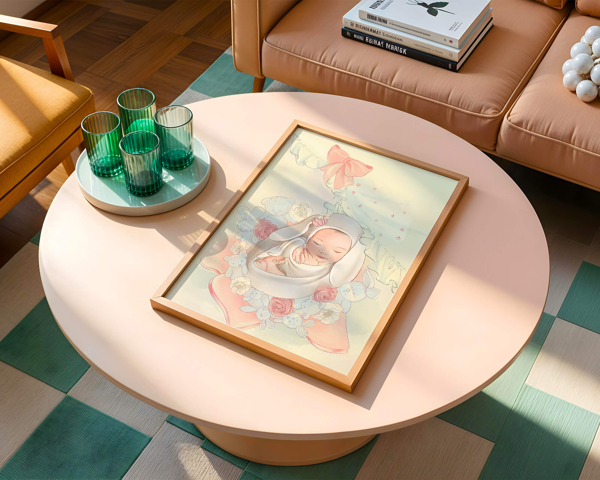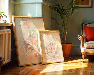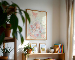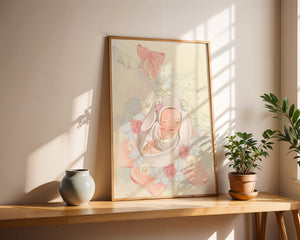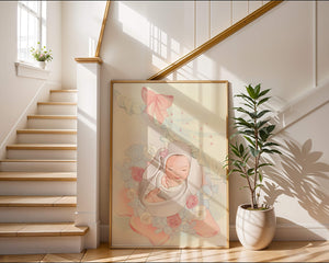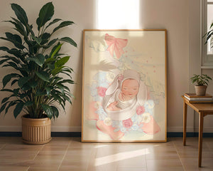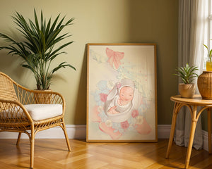 Очаровательное и спокойное изображение представляет спящего младенца, уютно устроенного в комфортной обстановке. Окружающая среда наполнена пастельными цветами, мягкими игрушками и нежными цветочными элементами, создающими атмосферу тепла и спокойствия.