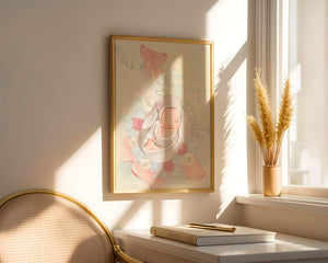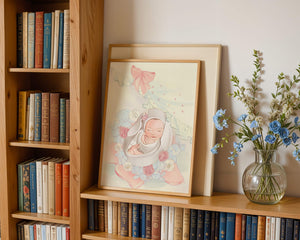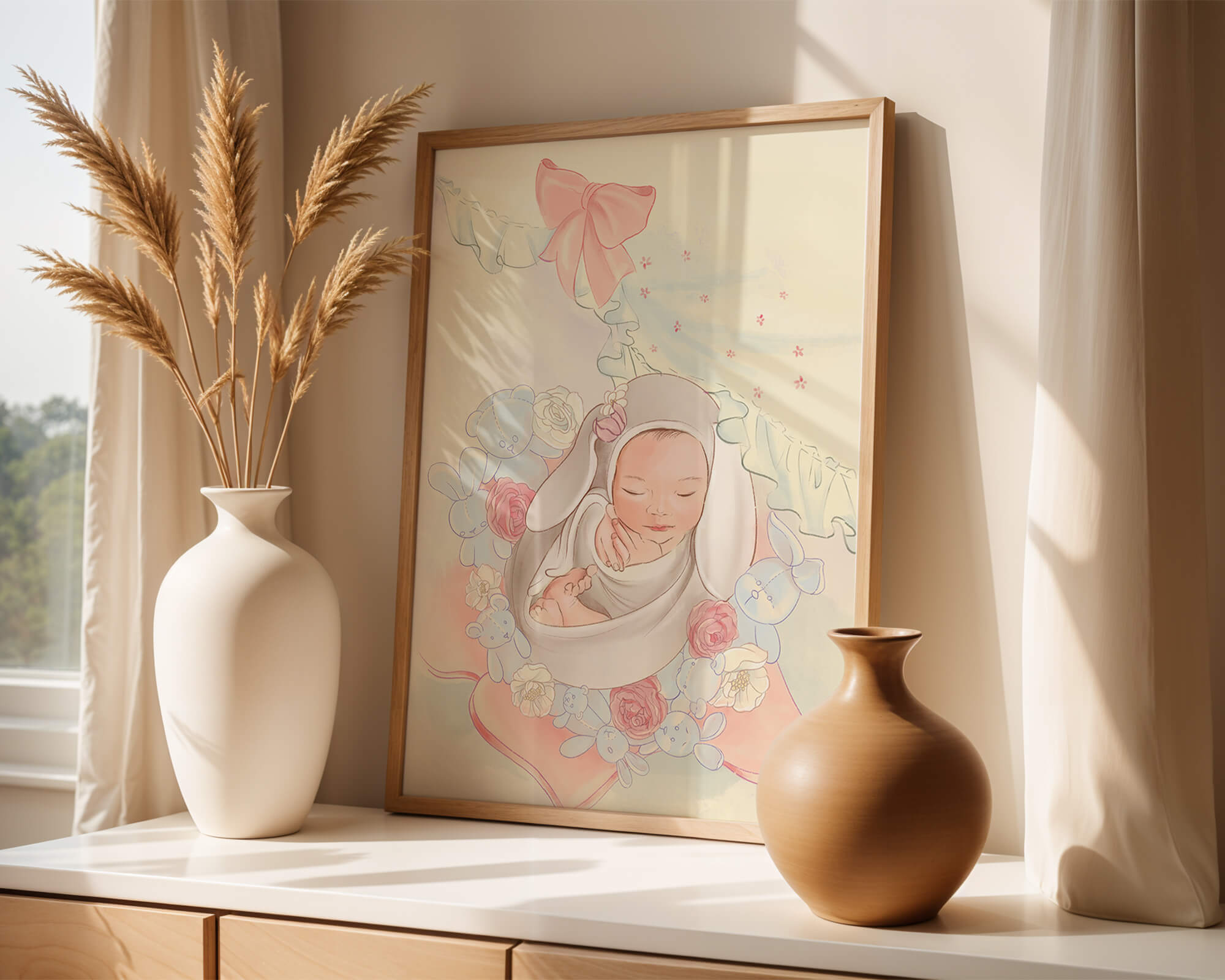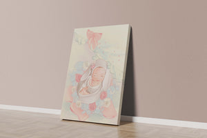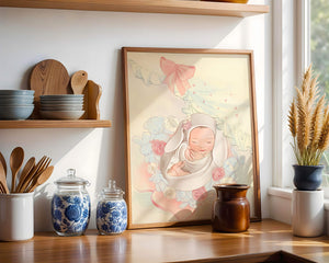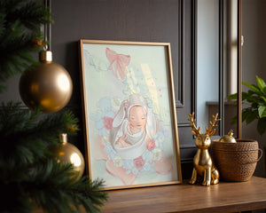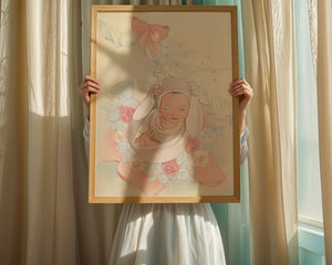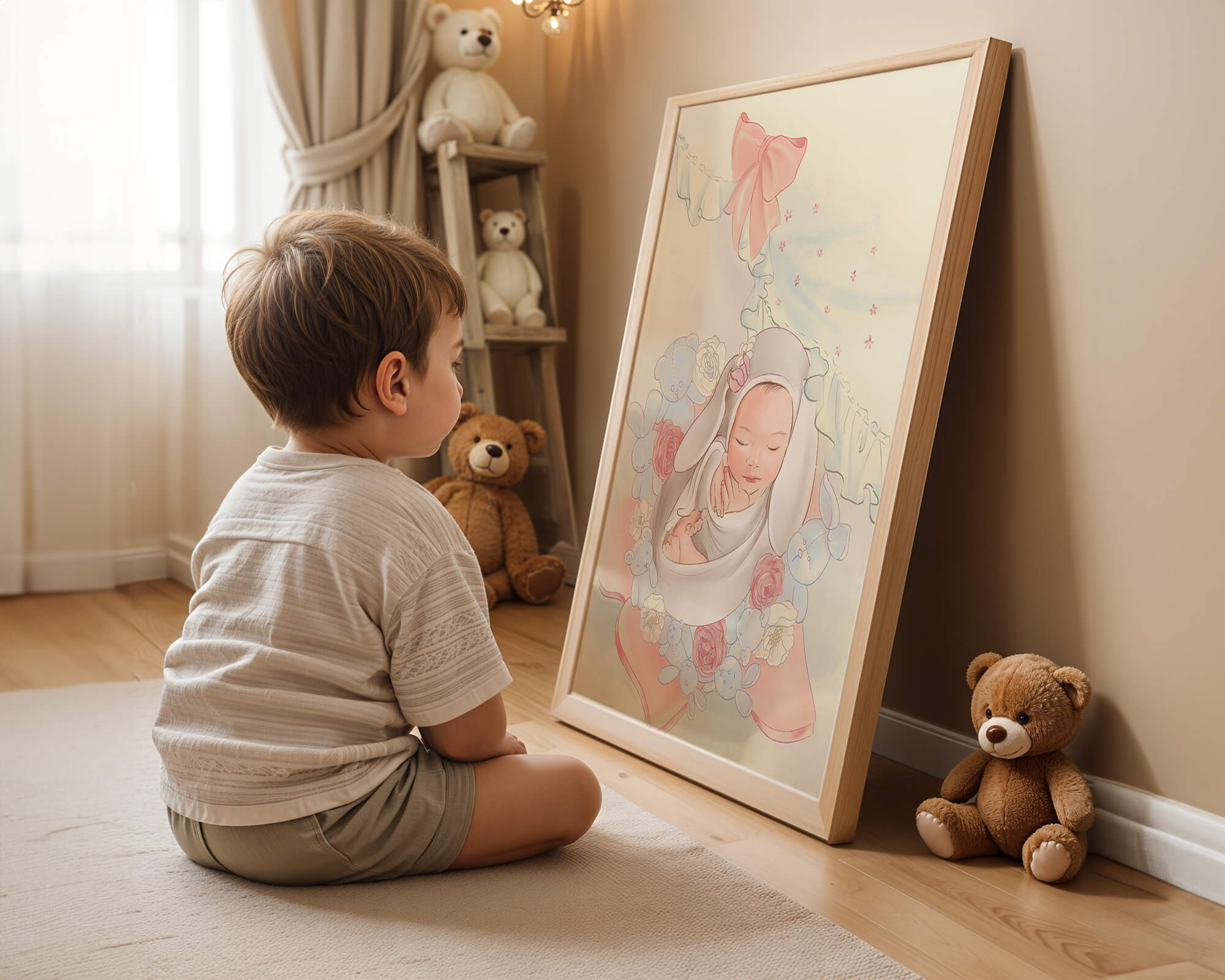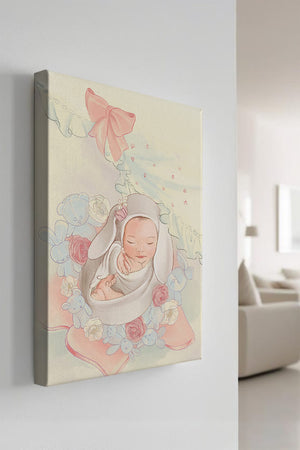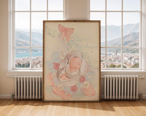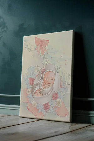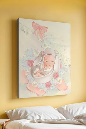 В этой волшебной сцене младенец укутан в легкую, мягкую ткань и мирно дремлет. Большой, элегантный бант сверху и рюши по краям одеяла обрамляют младенца, придавая изображению мечтательное и сказочное качество. Сочетание голубых и розовых оттенков усиливает нежное, теплое настроение обстановки. Присутствие очаровательных голубых медвежат и игривых зайчиков добавляет игривую, но спокойную атмосферу, делая его идеальным для детской или комнаты ребенка. Розы и нежные цветы разбросаны вокруг, принося нотки природы и невинности в мирную композицию.| Тип |