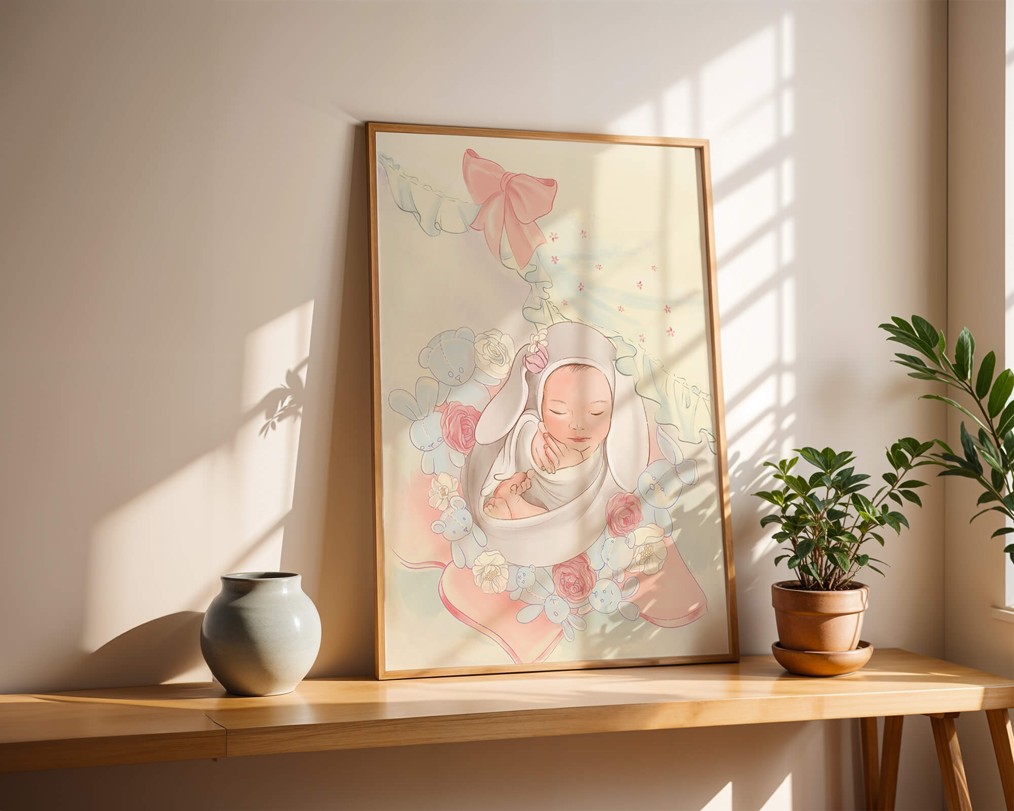 Bebé durmiendo dulcemente rodeado de suaves decoraciones en tonos pastel