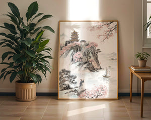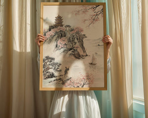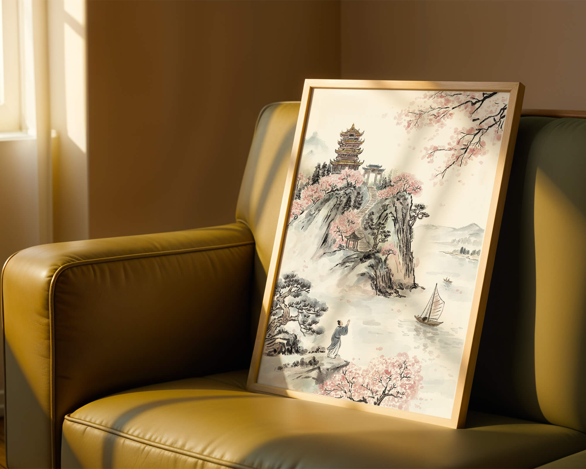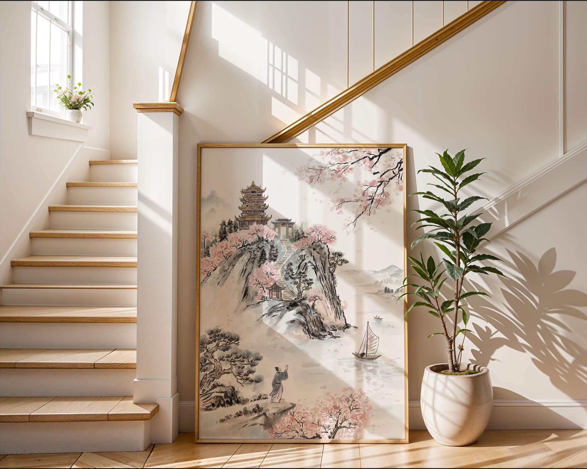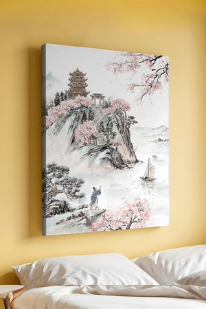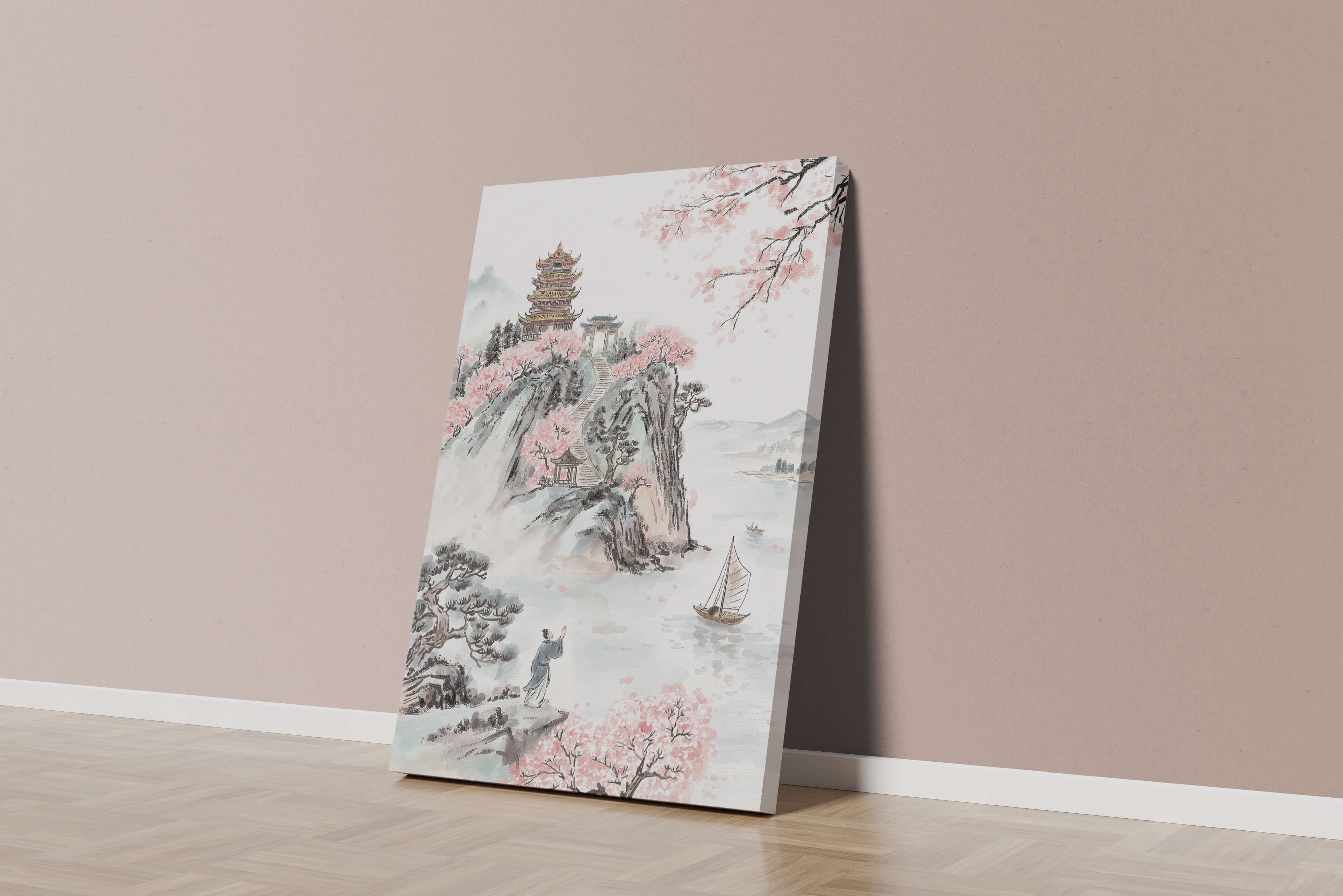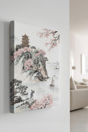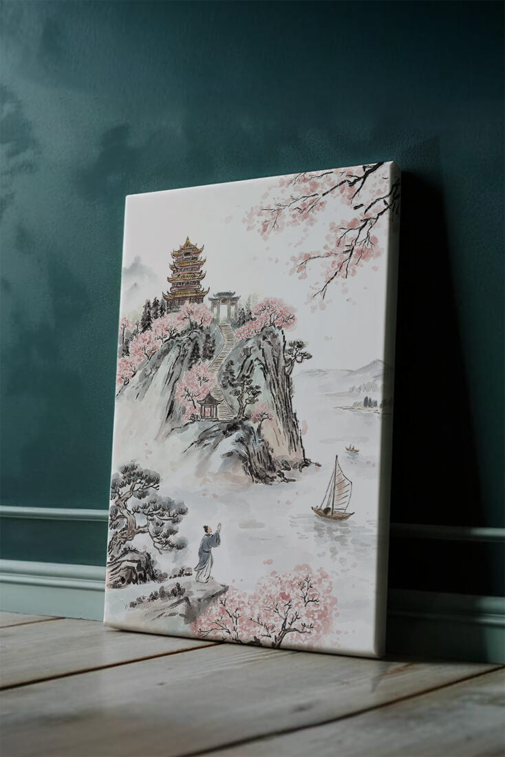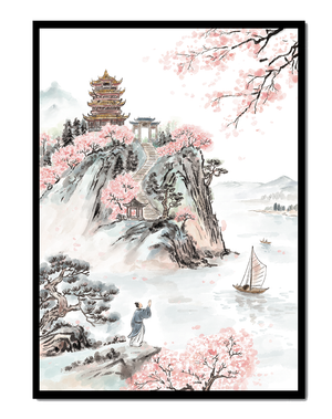 This artwork captures the essence of an idyllic location, blending natural beauty with cultural architecture. The striking pagoda stands majestically atop a hill, surrounded by a sea of pink cherry blossoms. The path leading up to the structure highlights the seamless connection between manmade and natural splendor. In the foreground, a lone figure stands near the edge, gazing at the serene boat gliding smoothly across the water. The soft pastel palette and serene imagery encapsulate the transcendent stillness found in traditional Eastern landscapes, inviting viewers to a place of peace and reflection.