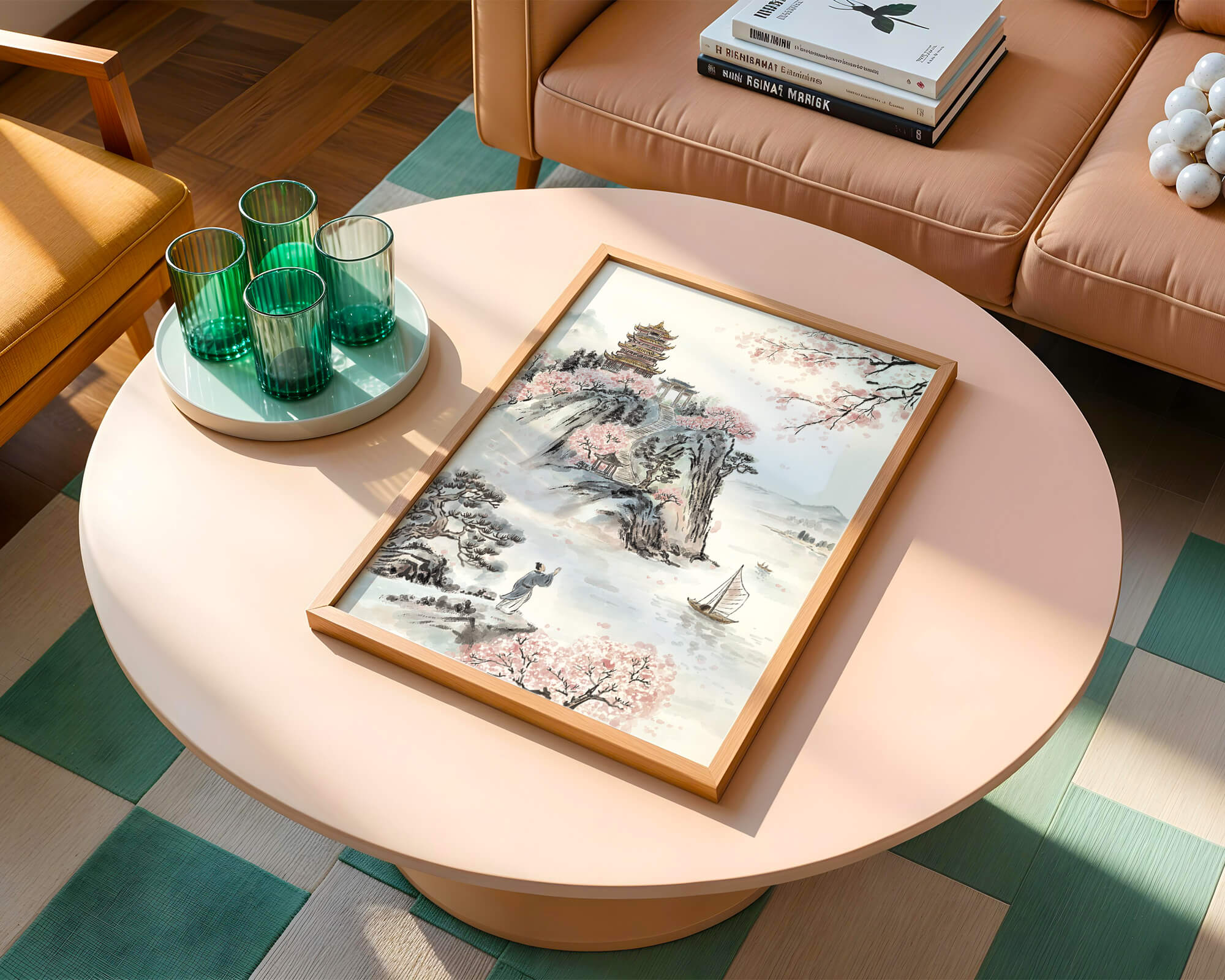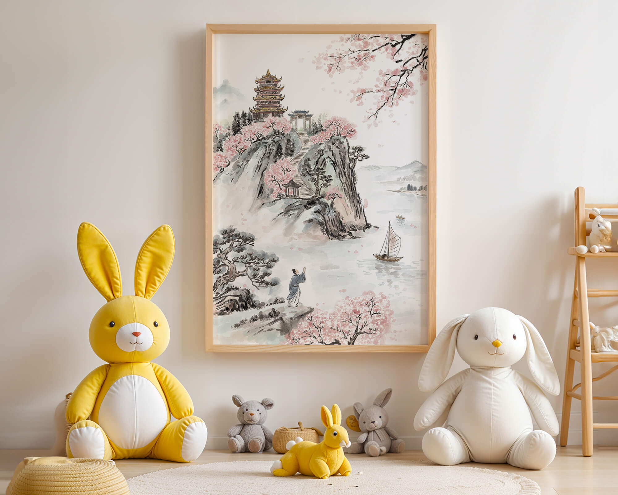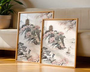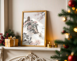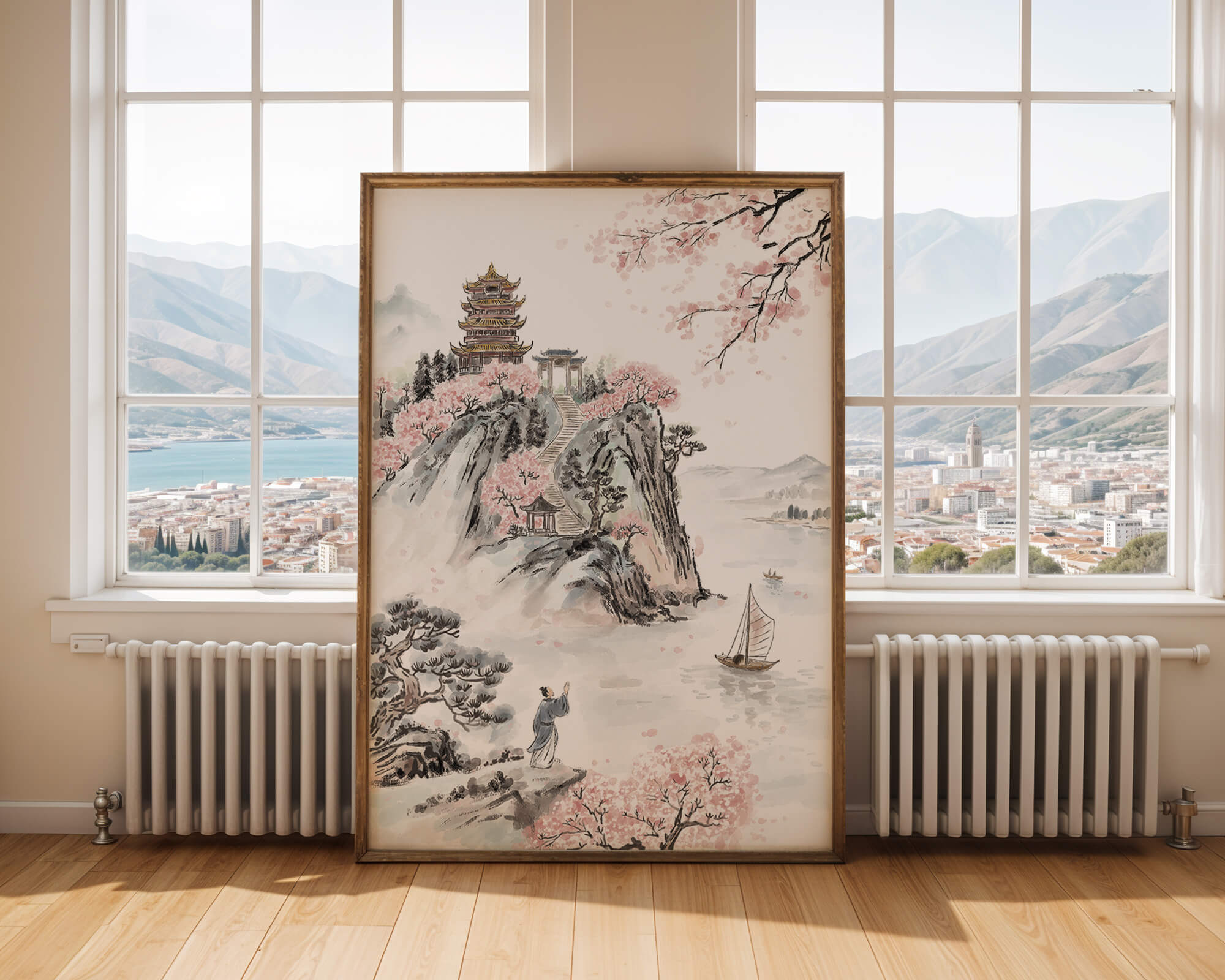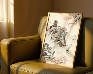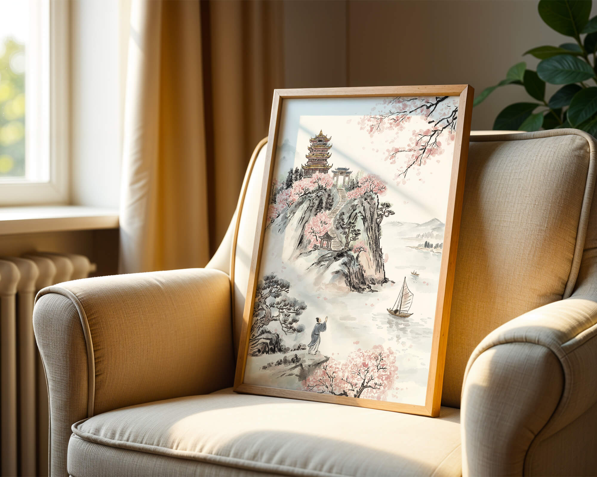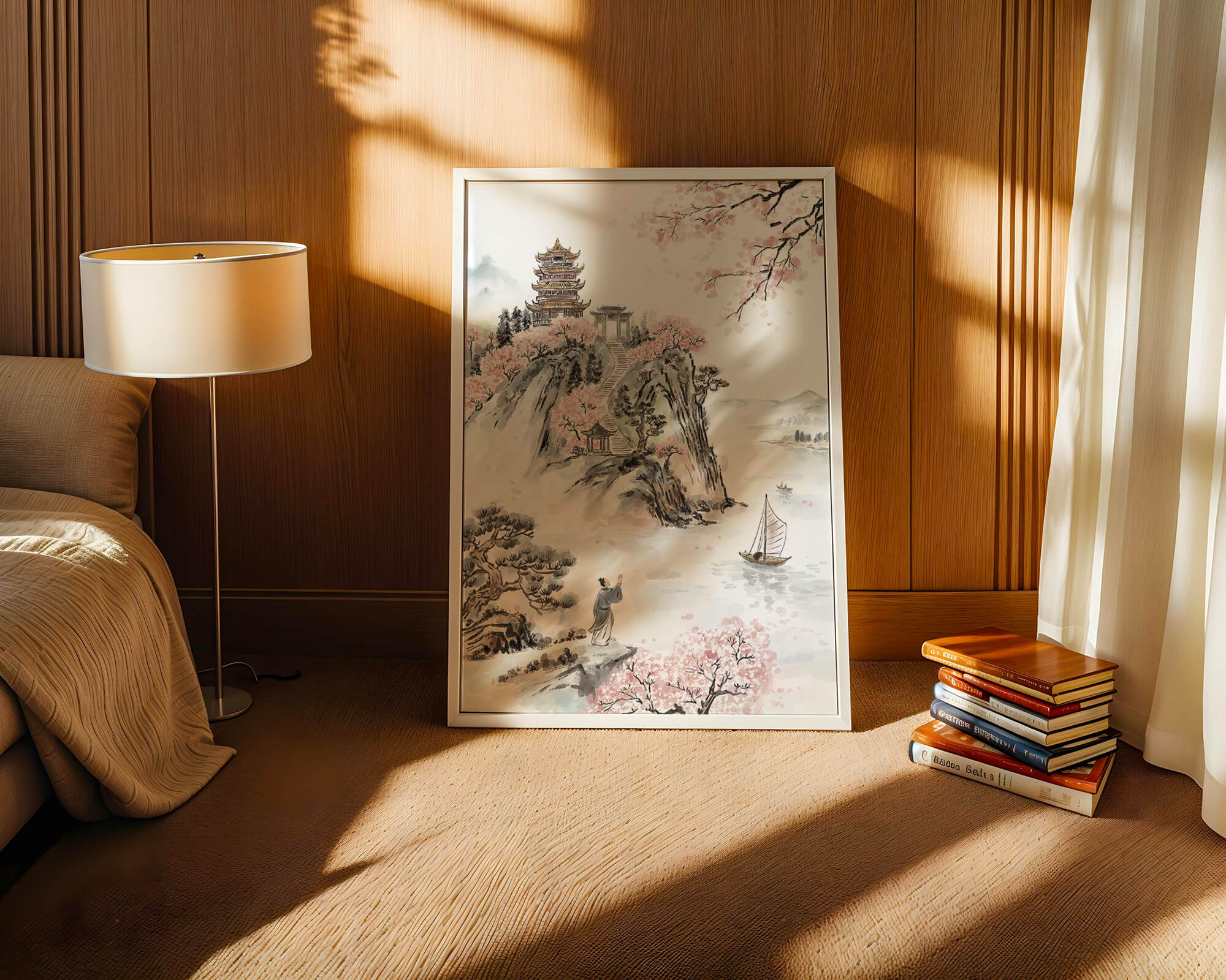This artwork captures the essence of an idyllic location, blending natural beauty with cultural architecture. The striking pagoda stands majestically atop a hill, surrounded by a sea of pink cherry blossoms. The path leading up to the structure highlights the seamless connection between manmade and natural splendor. In the foreground, a lone figure stands near the edge, gazing at the serene boat gliding smoothly across the water. The soft pastel palette and serene imagery encapsulate the transcendent stillness found in traditional Eastern landscapes, inviting viewers to a place of peace and reflection.
