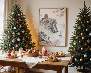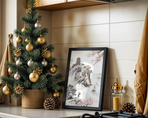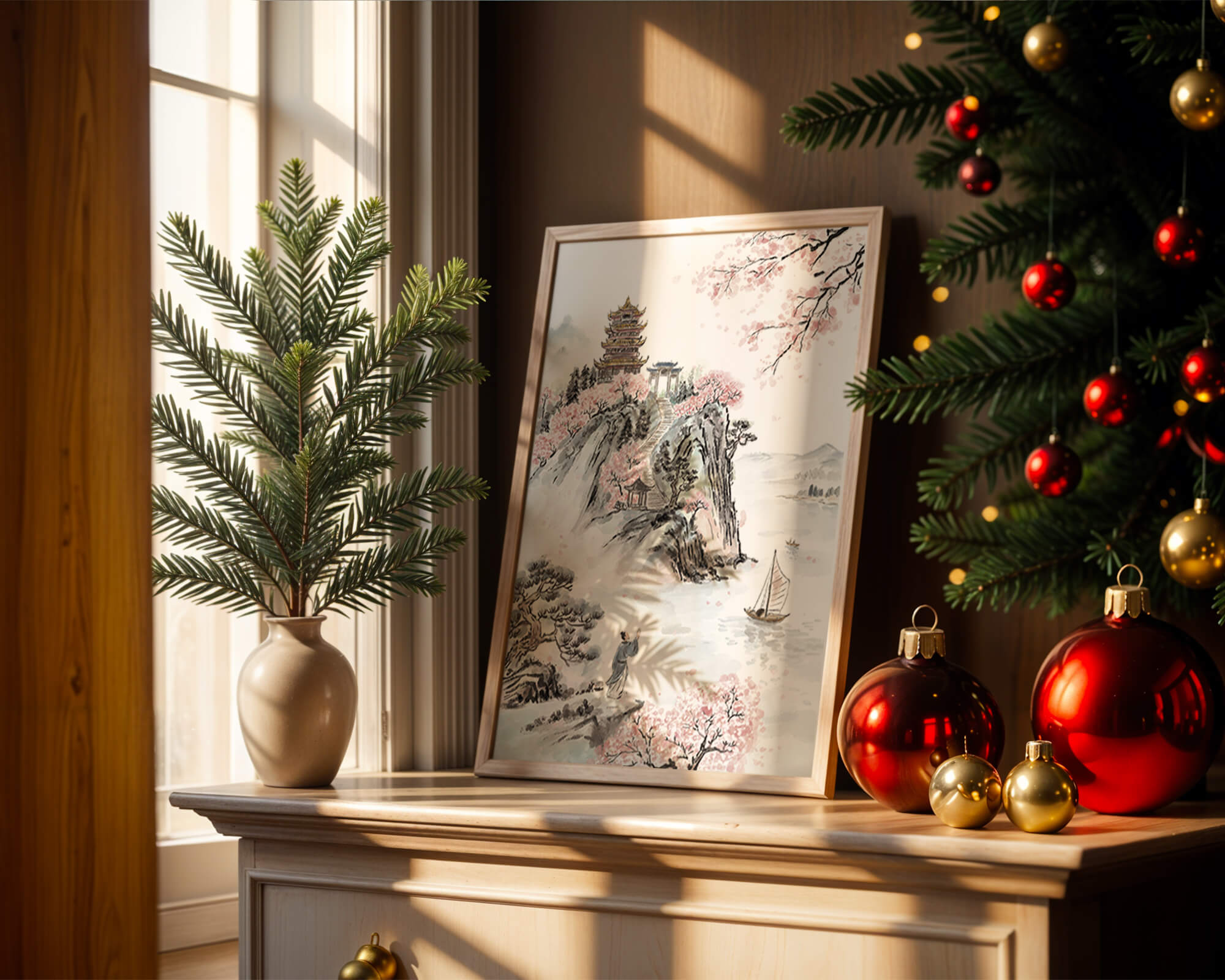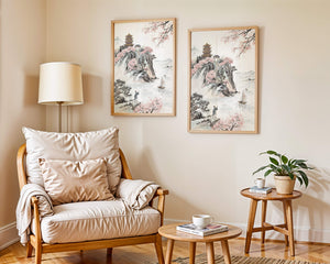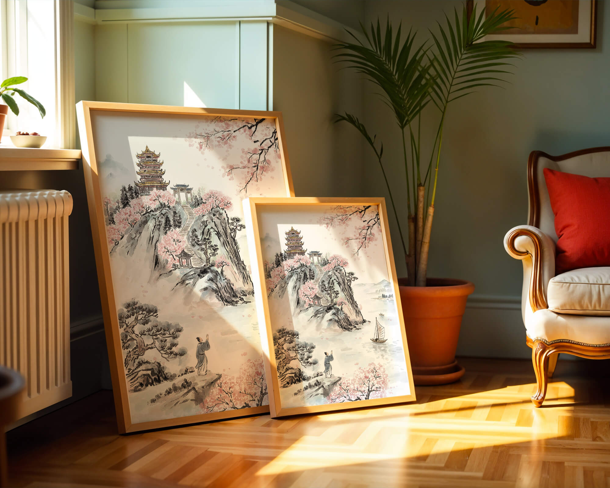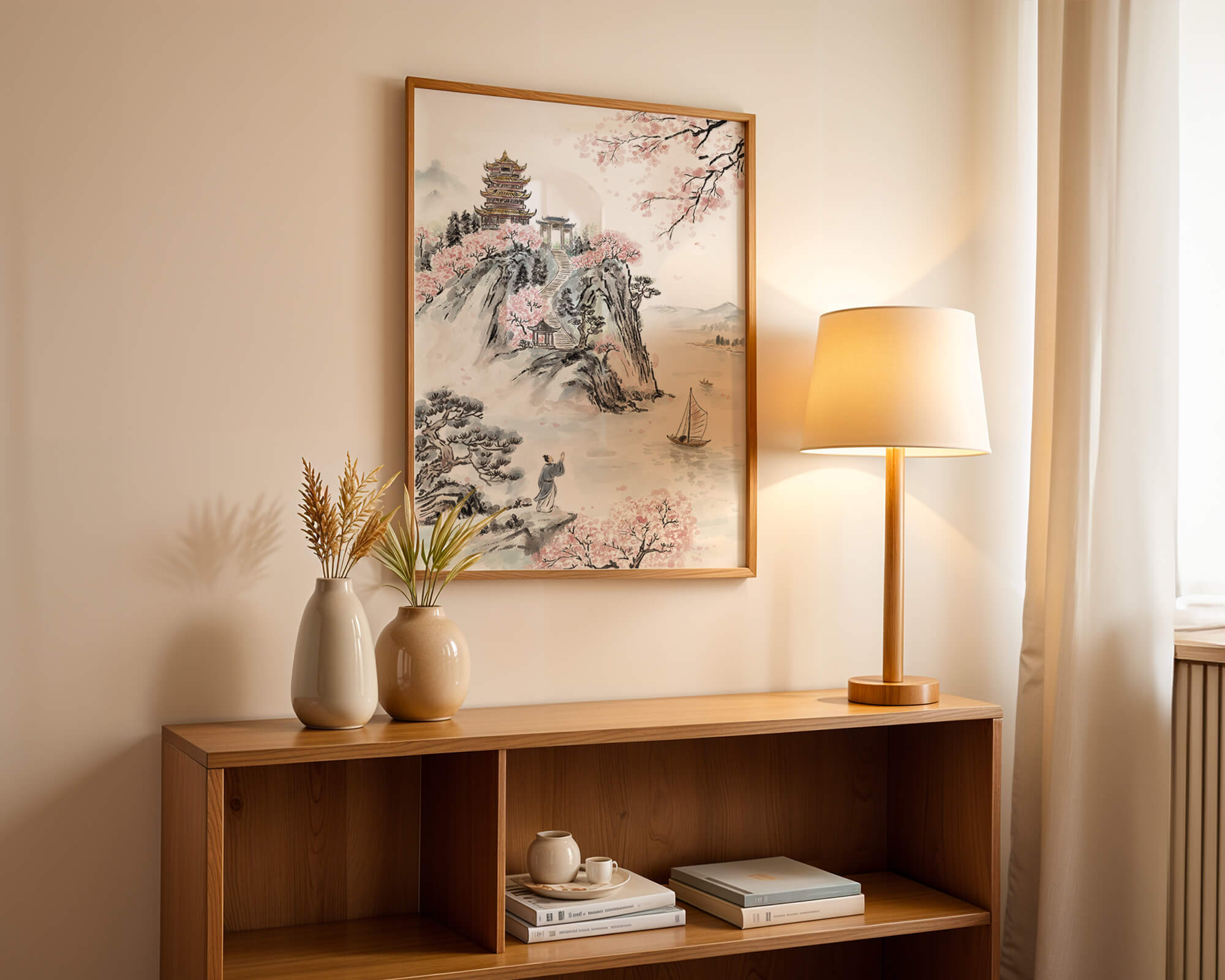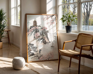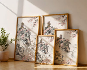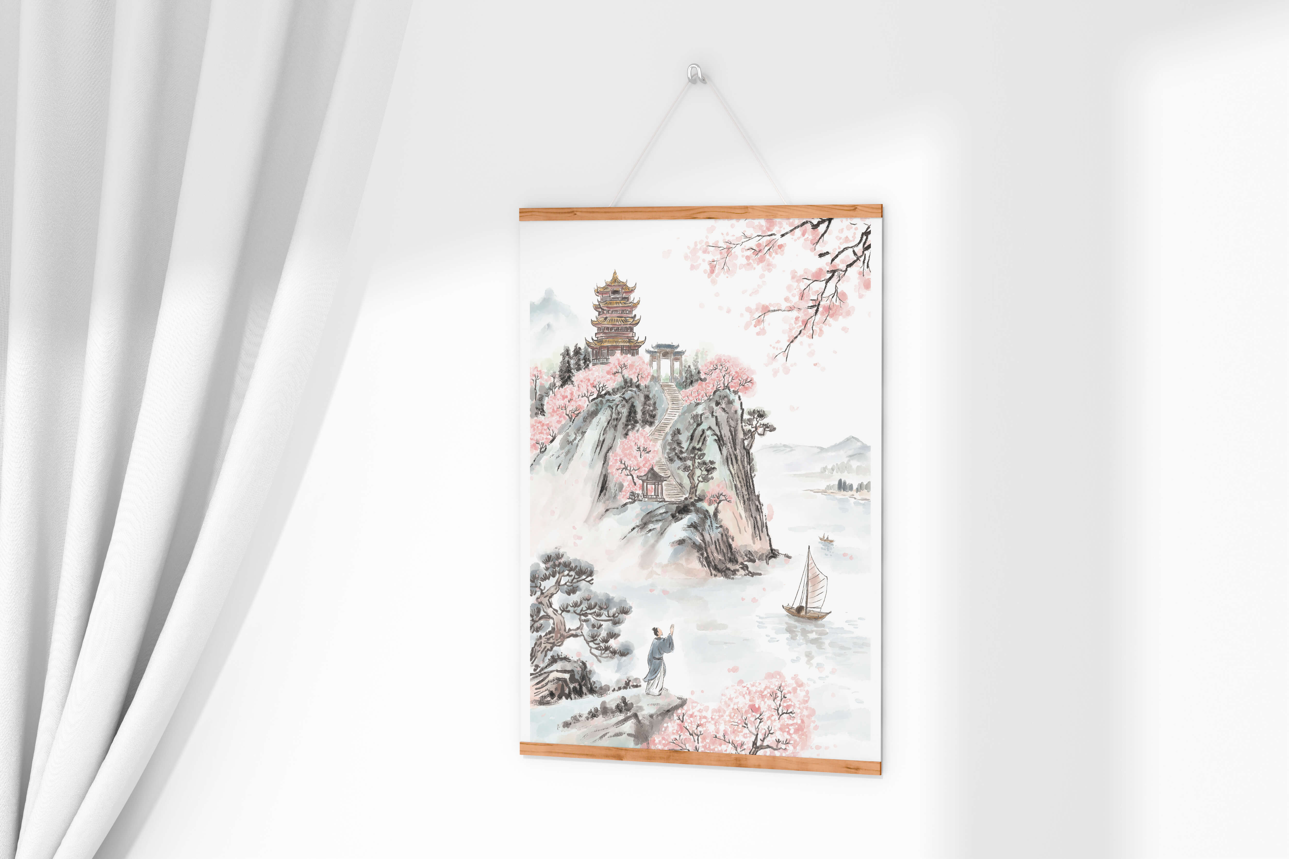 This artwork captures the essence of an idyllic location, blending natural beauty with cultural architecture. The striking pagoda stands majestically atop a hill, surrounded by a sea of pink cherry blossoms. The path leading up to the structure highlights the seamless connection between manmade and natural splendor. In the foreground, a lone figure stands near the edge, gazing at the serene boat gliding smoothly across the water. The soft pastel palette and serene imagery encapsulate the transcendent stillness found in traditional Eastern landscapes, inviting viewers to a place of peace and reflection.