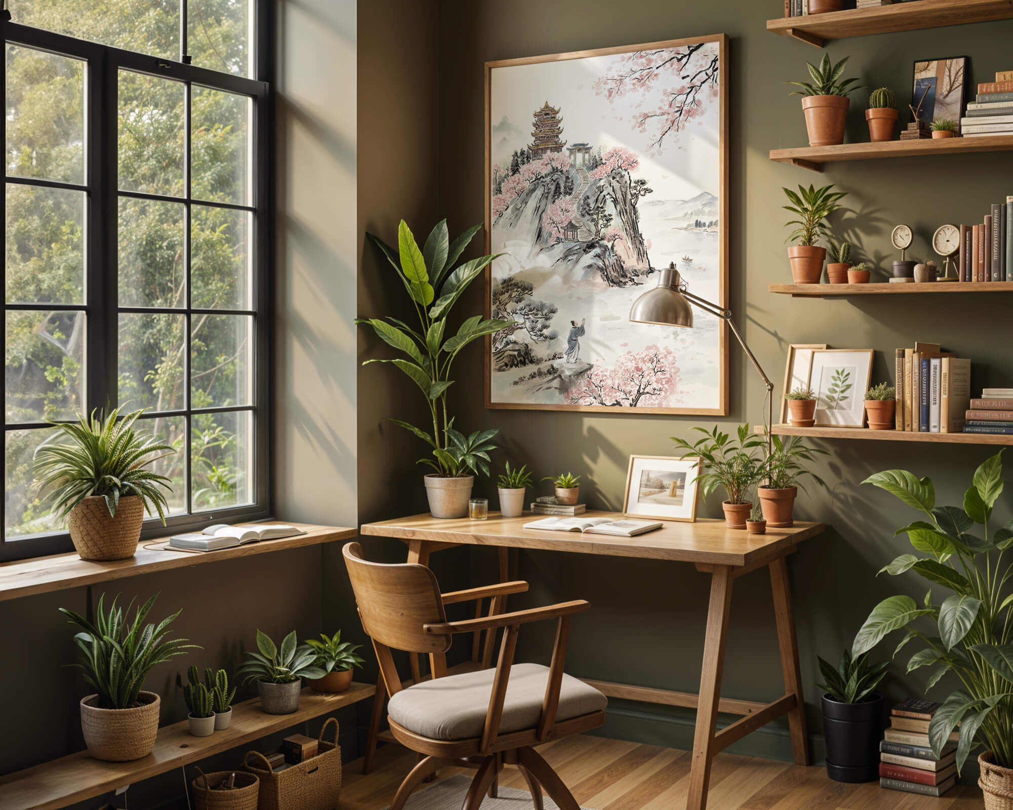 Home Tranquil Landscape with Cherry Blossoms and Traditional Pagoda
