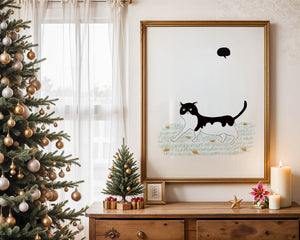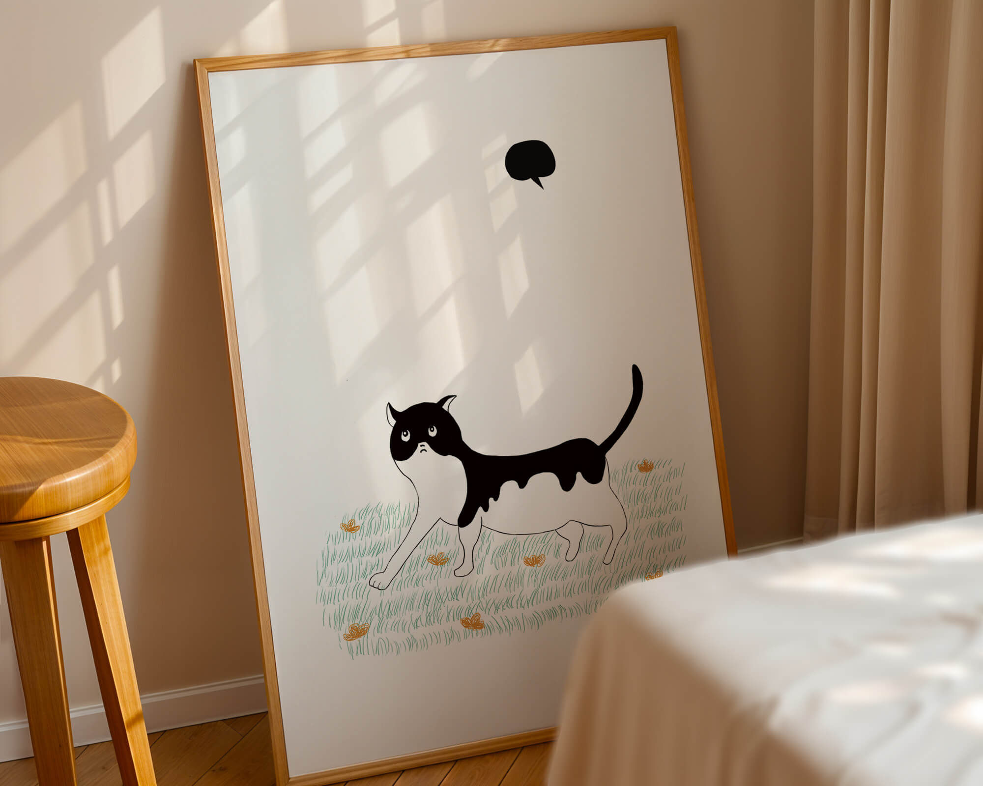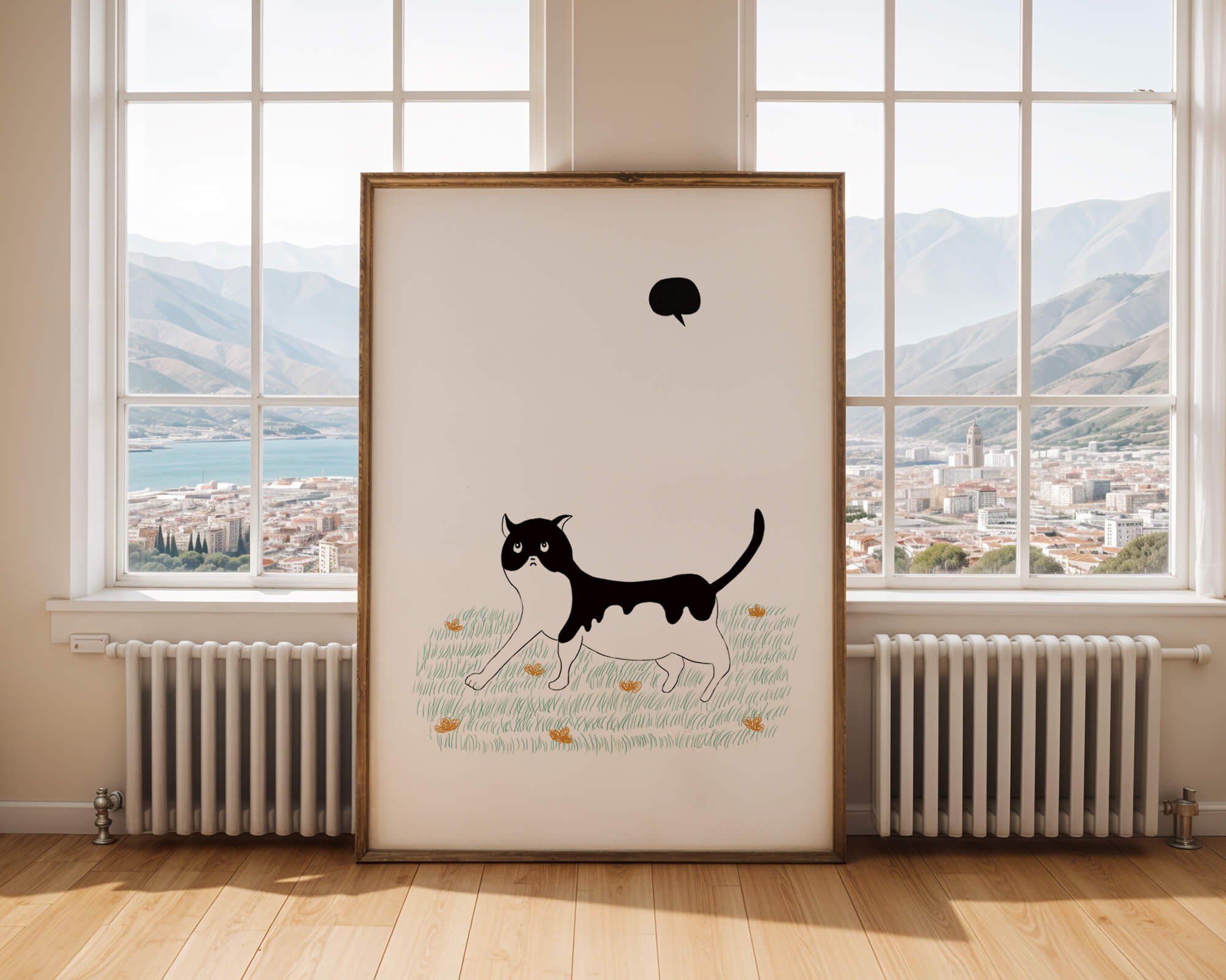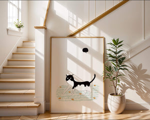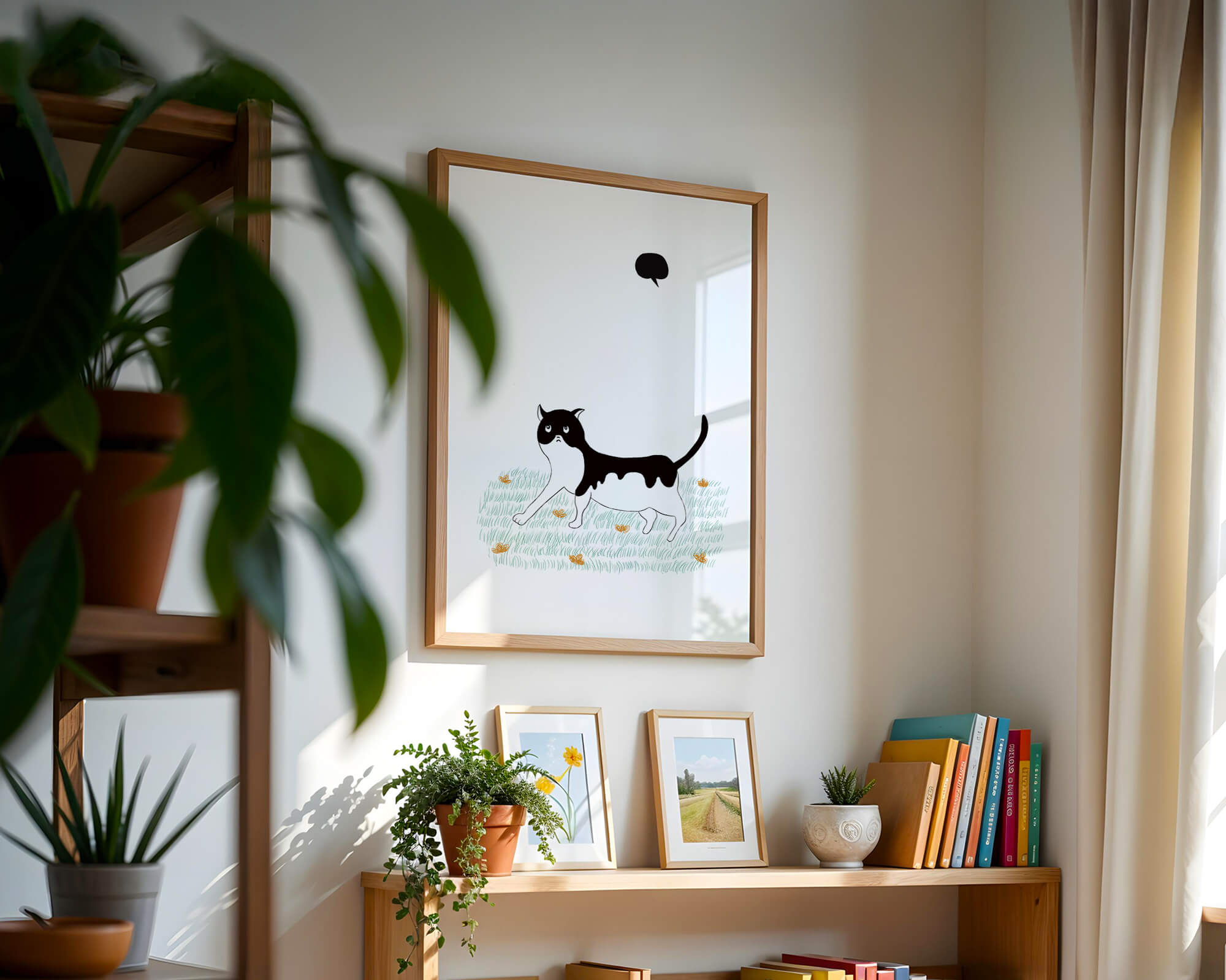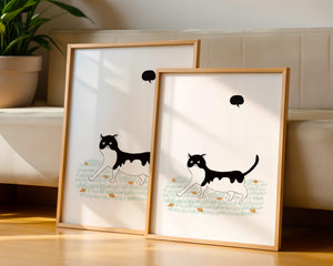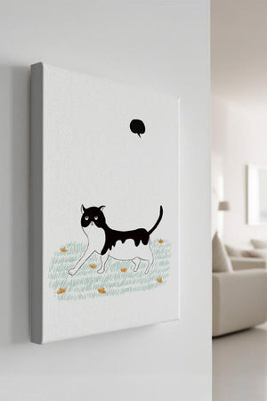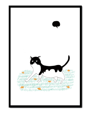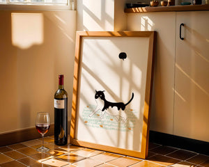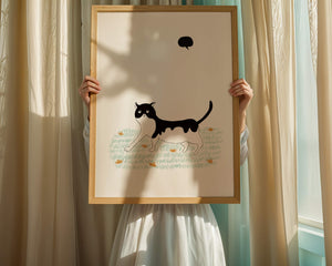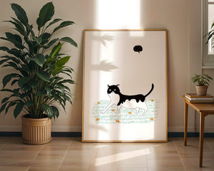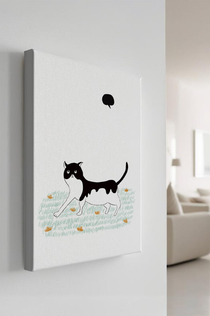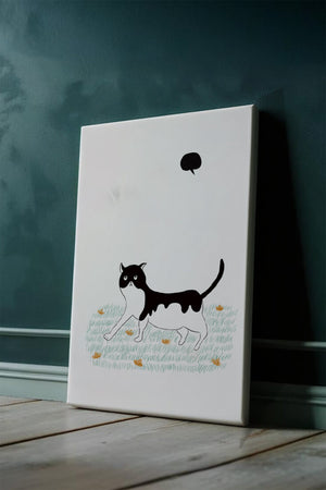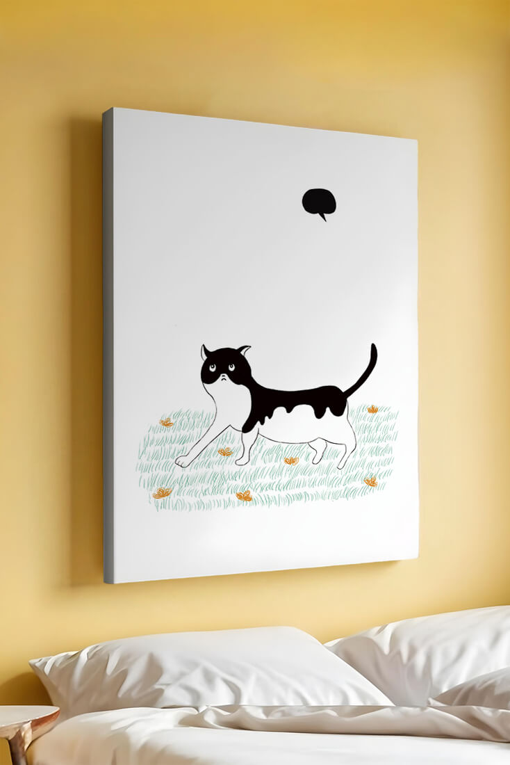 Эта захватывающая картина подчеркивает красоту минималистичного искусства, где меньше — значит больше. Черно-белая кошка ярко выделяется на фоне пышной зеленой природы, а ее выразительные глаза передают чувство любопытства и игривости. Добавление ярких оранжевых цветов вносит энергичный всплеск цвета, оживляющий сцену.Идеально для ценителей искусства, любящих животных, эта иллюстрация может добавить легкости в любое пространство, будь то гостиная, офис или детская комната. Ее современные и игривые элементы делают ее идеальной для креативного декора.