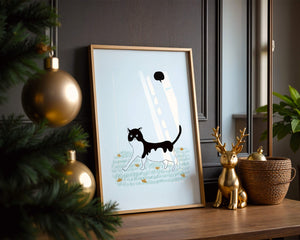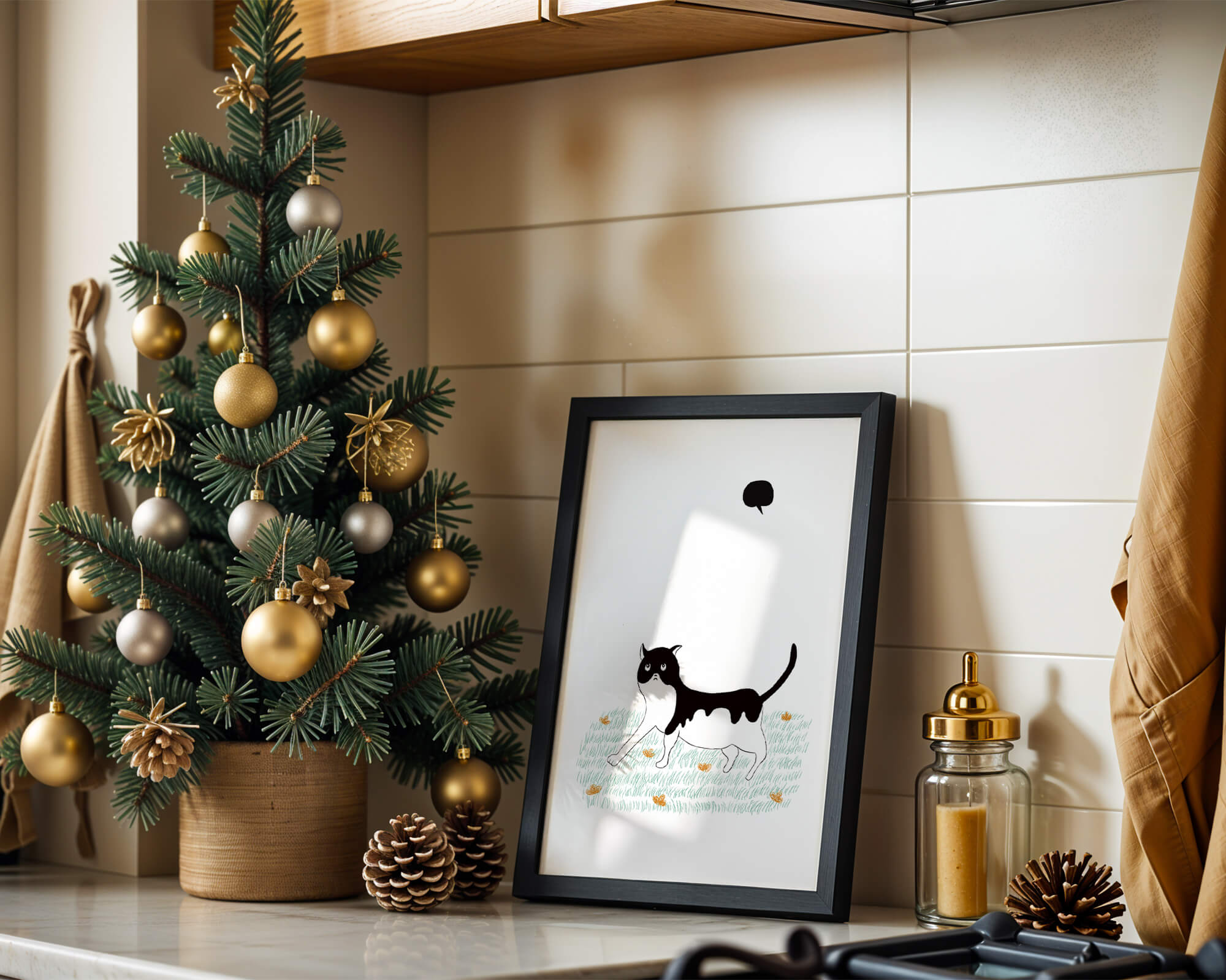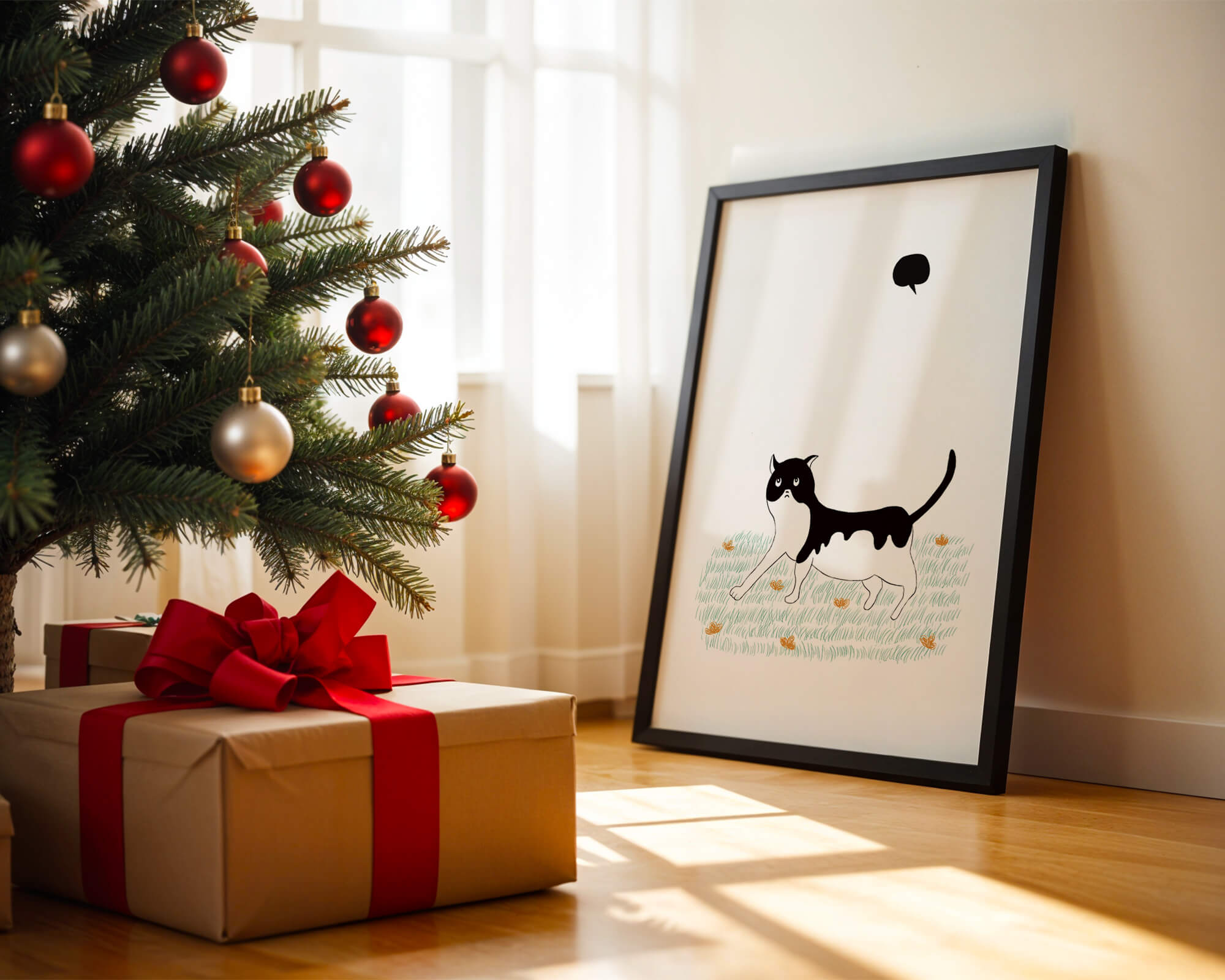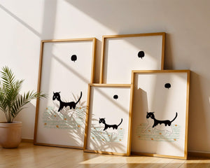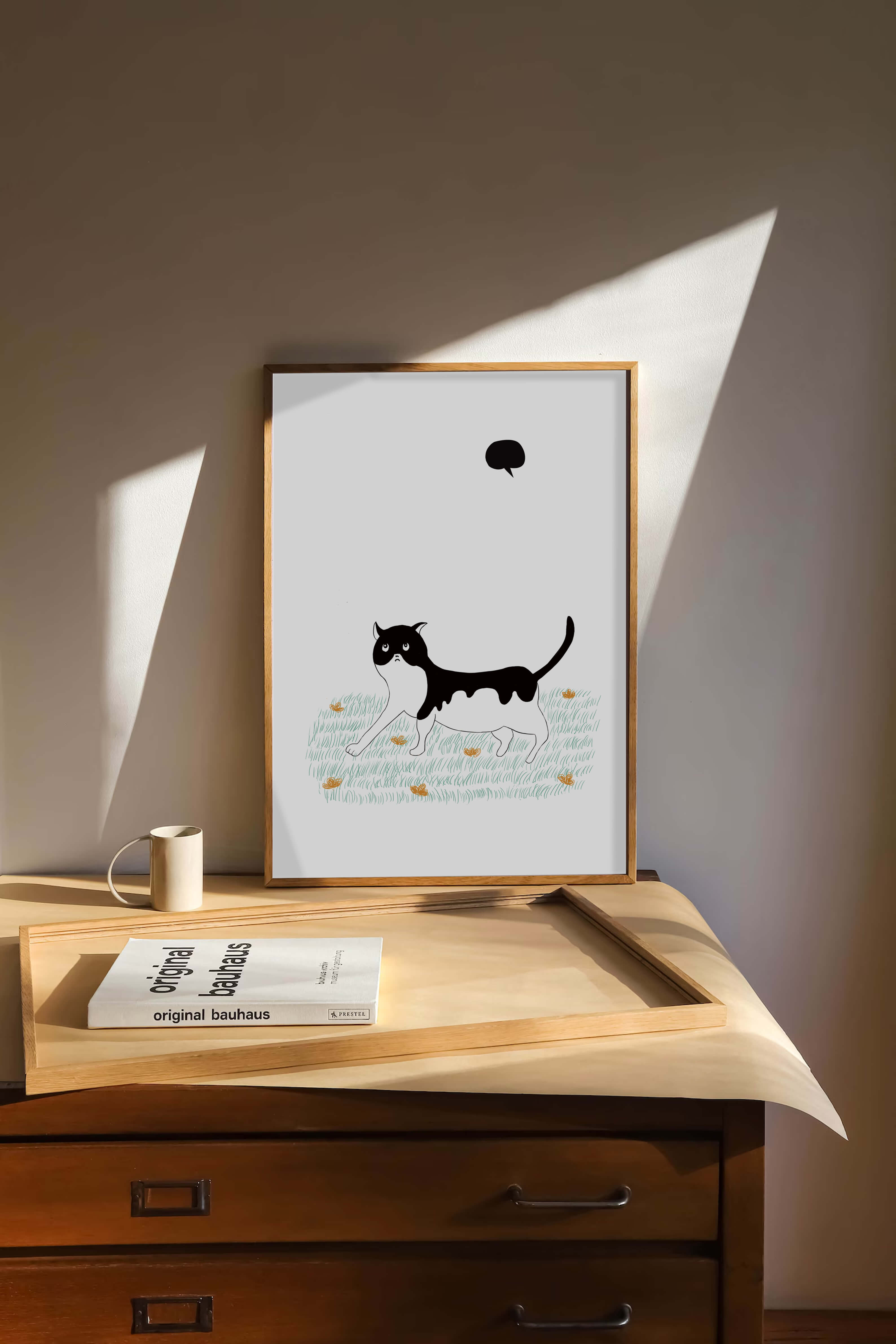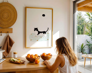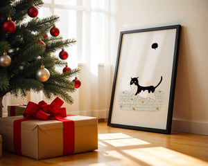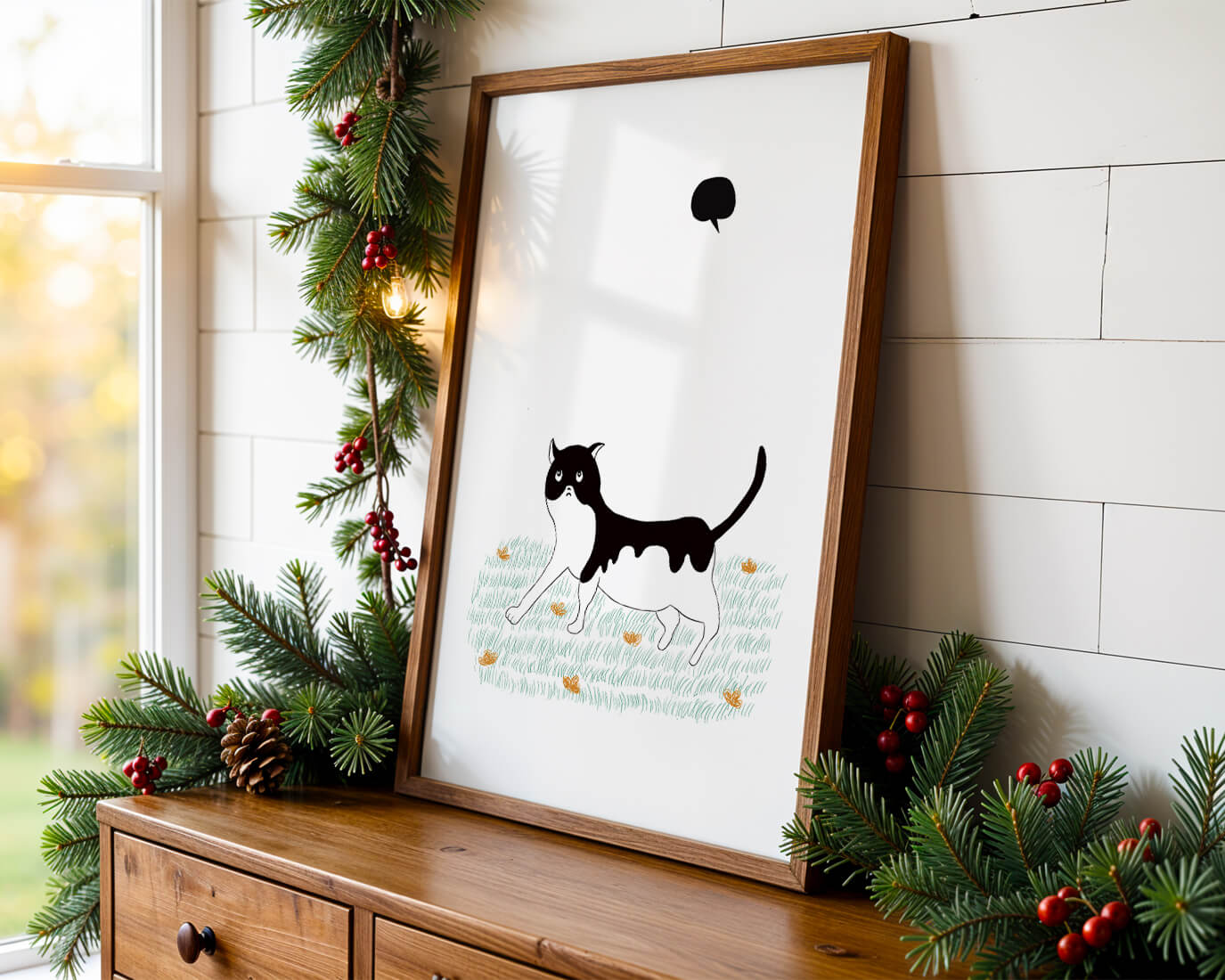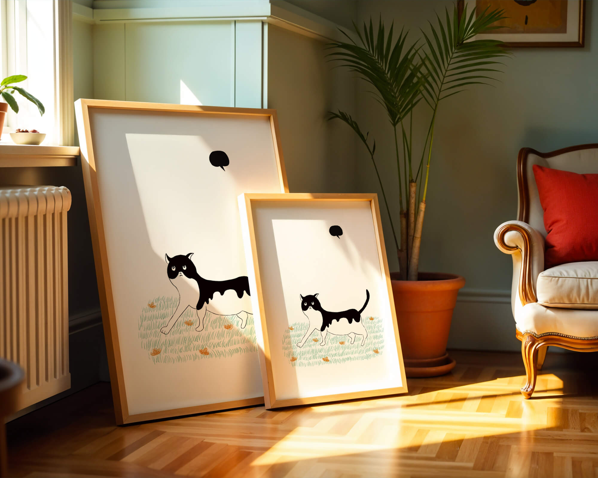 Эта захватывающая картина подчеркивает красоту минималистичного искусства, где меньше — значит больше. Черно-белая кошка ярко выделяется на фоне пышной зеленой природы, а ее выразительные глаза передают чувство любопытства и игривости. Добавление ярких оранжевых цветов вносит энергичный всплеск цвета, оживляющий сцену.Идеально для ценителей искусства, любящих животных, эта иллюстрация может добавить легкости в любое пространство, будь то гостиная, офис или детская комната. Ее современные и игривые элементы делают ее идеальной для креативного декора.