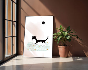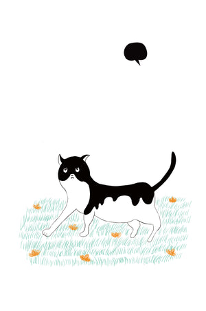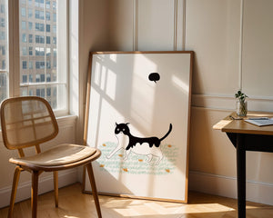 Очаровательная иллюстрация, изображающая черно-белую кошку, прогуливающуюся по полю цветов, дарит взгляд на причудливый мир минималистичного искусства. Простота дизайна подчеркнута ярко-зеленой травой и жизнерадостными оранжевыми цветами, создающими восхитительный контраст.