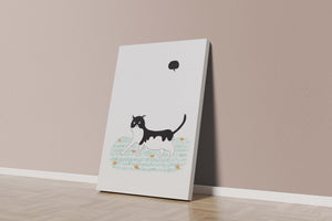 Ilustración caprichosa de un gato en un campo de flores