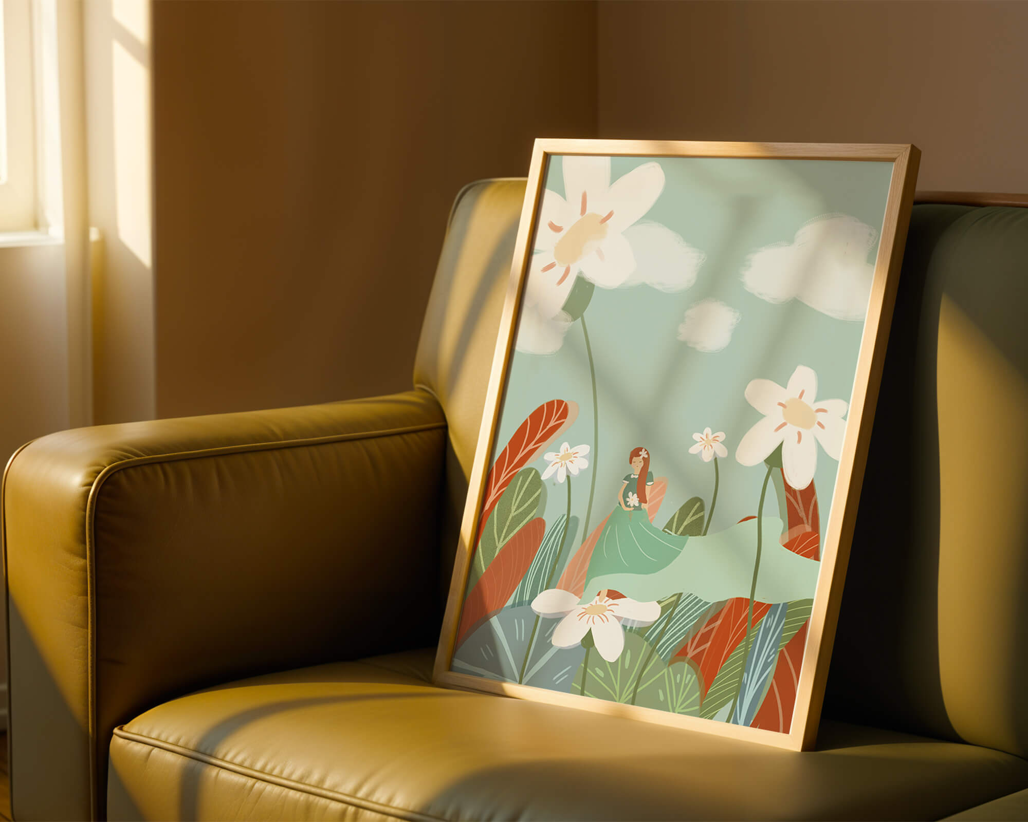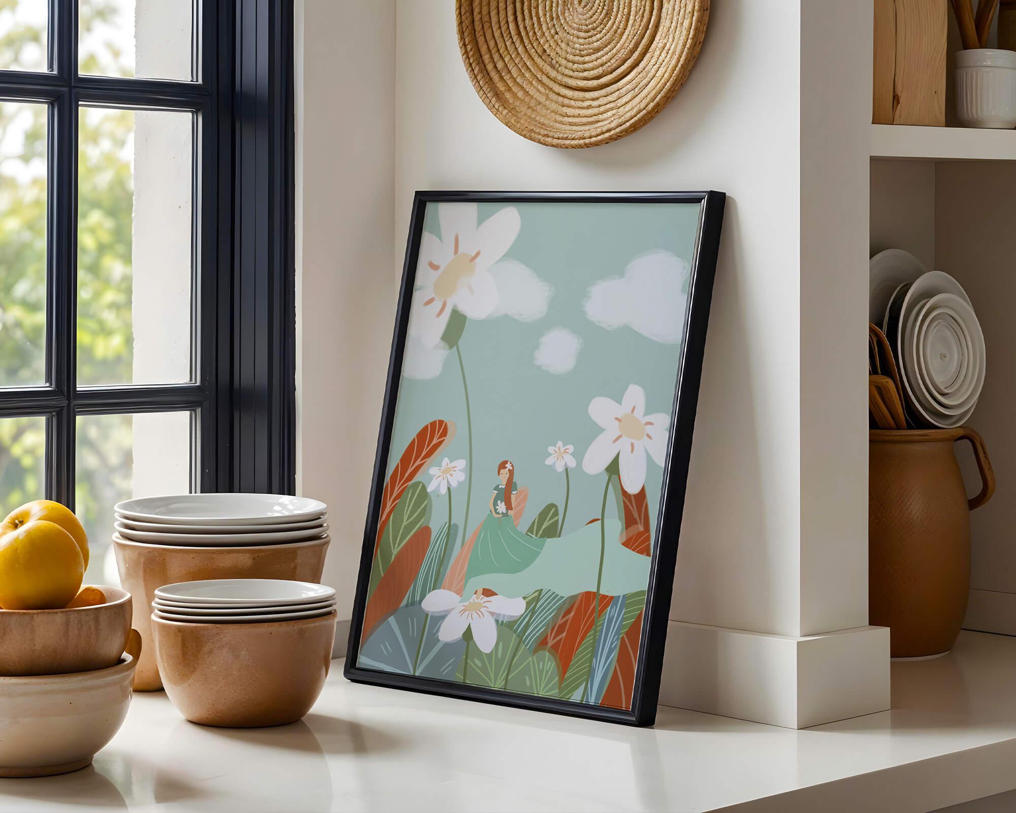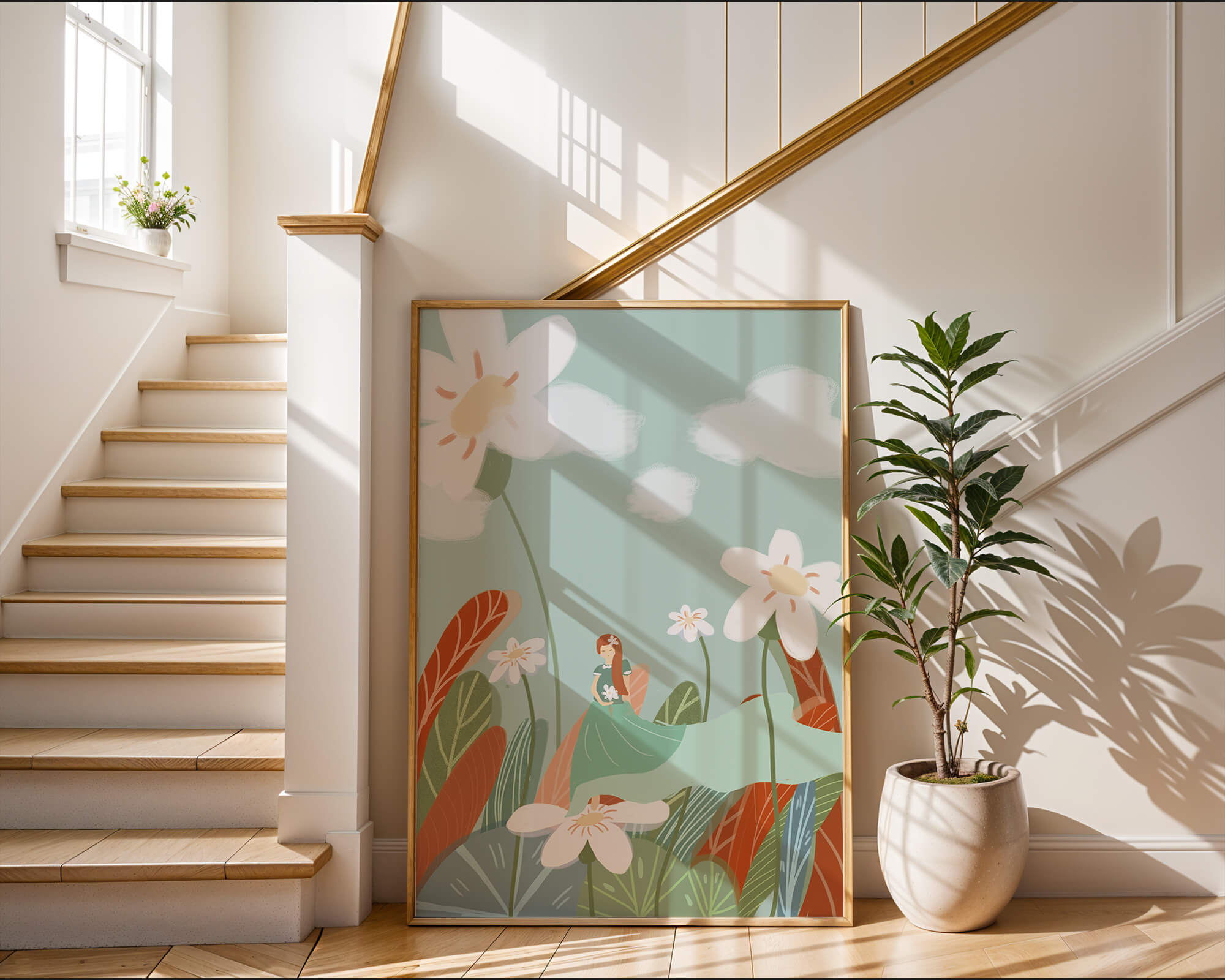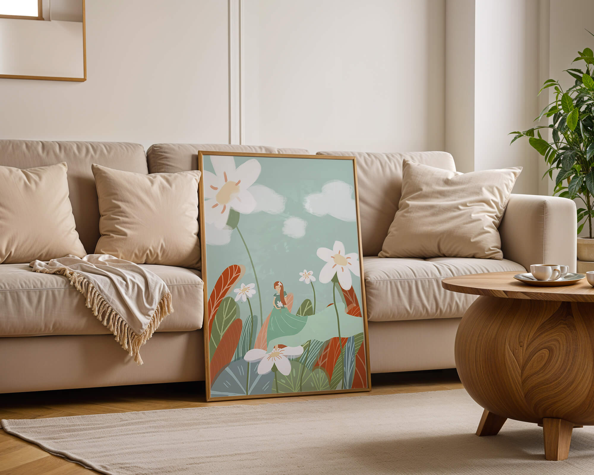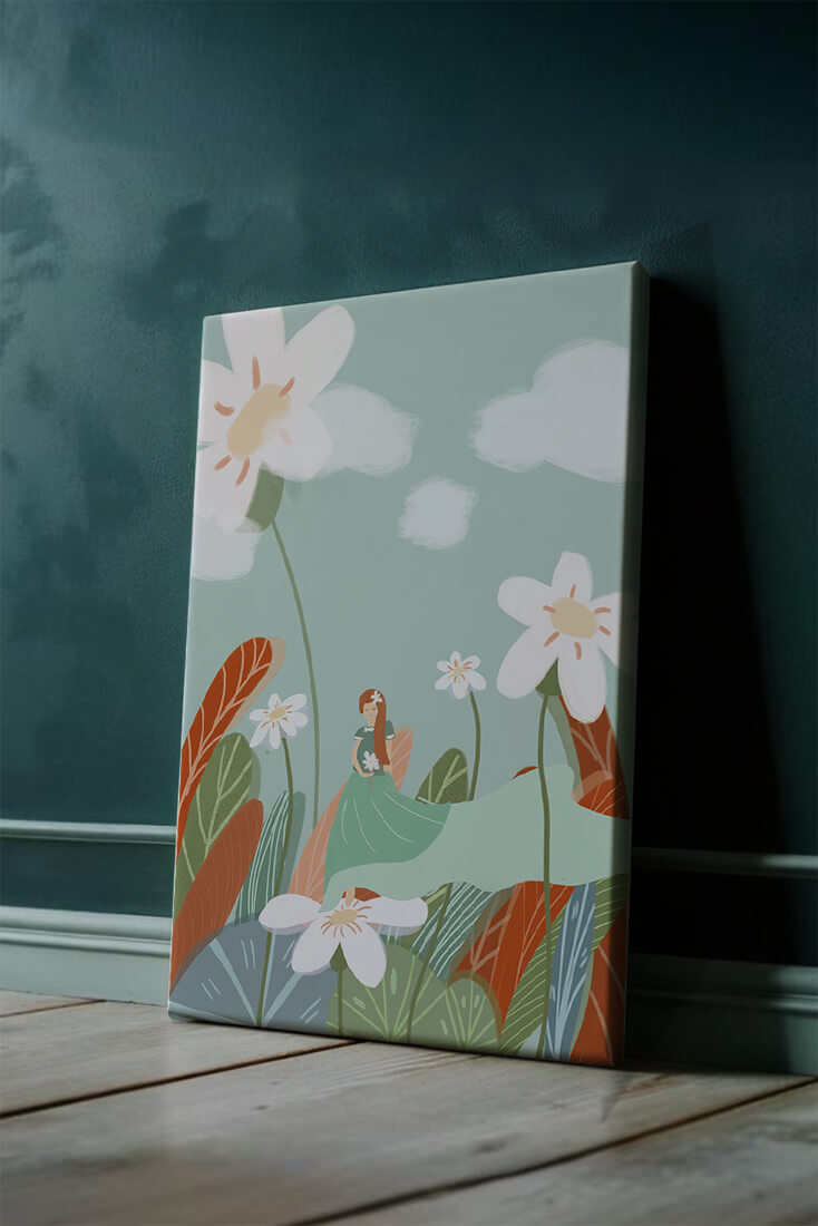 В центре этой магической обстановки женщина в струящемся зеленом платье держит маленький цветок, как будто она часть этого волшебного мира. Яркие цвета красного, зеленого и розового доминируют на заднем плане, с большими ромашками и пышной листвой, устремляющейся к пастельному небу. Взаимодействие форм и оттенков вызывает чувство удивления, делая его идеальным для детской комнаты или пространства, вдохновленного природой. Гармоничное сочетание художественных элементов рисует спокойную картину, которая вовлекает зрителей в этот фантастический мир. Идеальная для домашнего декора, эта иллюстрация приносит свежий штрих природы и воображения на любую стену, завораживая как детей, так и взрослых своей игривой сущностью.| Тип |